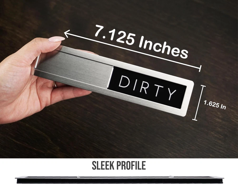 Dual Functionality: Clearly indicates whether dishes inside the dishwasher are clean or dirty with "Clean" and "Dirty" labels. Premium Material: Made of 304 stainless steel, known for its corrosion resistance, making it ideal for kitchen environments with frequent water exposure. Perfect Size: Measures 7.125 by 1.625 inches, ensuring easy readability without occupying too much space. User-Friendly Design: Features a steel sliding door with raised handles for effortless switching between "Clean" and "Dirty" indicators. Simple & Minimal: "Clean" side features a white background, and "Dirty" side has a black background for clear differentiation. Minimalistic Design: The words "Clean" and "Dirty" are in a minimalistic typeface, blending seamlessly with any kitchen decor. Durable Construction: High-quality metal build ensures long-lasting use without wear and tear. Perfect Gift: Comes with 2 double-sided sticker adhesives for non magnetic surfaces packaged in a giftable box. Product Description FridayVibez Premium Stainless Steel Clean/Dirty Dishwasher Magnet The video showcases the product in use. The video guides you through product setup. The video compares multiple products. The video shows the product being unpacked. The answer is clear. Sleek & Modern Like It Came With Your Dishwasher Upgrade your kitchen with our sleek and functional stainless steel. This innovative magnet clearly indicates whether your dishes are clean or dirty, making household chores more efficient. Crafted from premium 304 stainless steel, this magnet is designed to withstand the rigors of a busy kitchen, offering superior resistance to corrosion and water damage. Crafted from 304 Grade Steel Minimalistic Design and User-Friendly Its user-friendly design features a steel sliding door with raised handles, allowing you to effortlessly switch between the "Clean" and "Dirty" indicators. Both sides boast a very minimalistic touch, harmonizing with the entire stainless steel casing for a modern and sophisticated look. The edges of the magnet are smooth and safe, making it ideal for households with children, as it won’t cut their fingers during use. Magnetic Surfaces Or Not Compatible with appliances that look like metal... but aren't. The package includes two adhesive tapes for non-magnetic dishwasher doors, allowing you to easily attach the Stainless Steel Dishwasher Magnet. Just apply the tape to the back of the magnet and press it firmly onto the dishwasher door. These tapes let you enjoy the sleek look of our Stainless Steel Dishwasher Magnet on any type of dishwasher. Easy to Read, Loud & Clear Minimal font that can be read easily. Measuring 7.125 by 1.625 inches, this dishwasher magnet is perfectly sized for easy readability without being obtrusive. The minimalistic typeface used for the "Clean" and "Dirty" labels ensures that this magnet will complement any kitchen decor. Whether your style is contemporary or classic, this dishwasher magnet will seamlessly blend in, adding a touch of elegance to your appliances. Check Out Our Premium Styles! Add to Cart Add to Cart Add to Cart Add to Cart Customer Reviews 4.9 out of 5 stars 377 4.9 out of 5 stars 377 4.9 out of 5 stars 377 4.9 out of 5 stars 1,436 Price $16.99 $ 16 . 99 $16.99 $ 16 . 99 $16.99 $ 16 . 99 $9.99 $ 9 . 99 Trendy Design ✔ ✔ ✔ ✔ Includes Adhesives ✔ ✔ ✔ ✔ Super Strong Magnet ✔ ✔ ✔ ✔ Premium Quality ✔ ✔ ✔ ✔ Trusted US Brand ✔ ✔ ✔ ✔