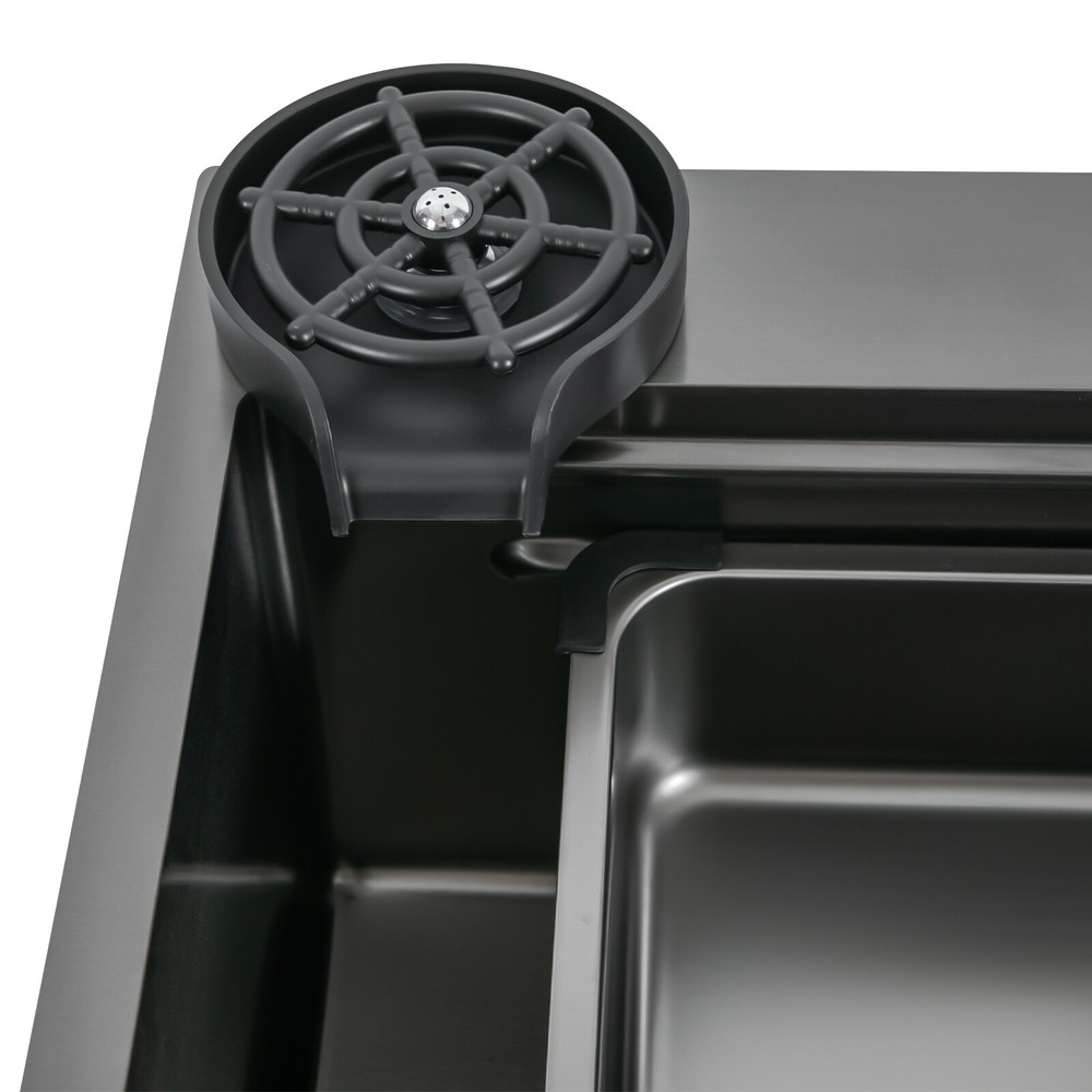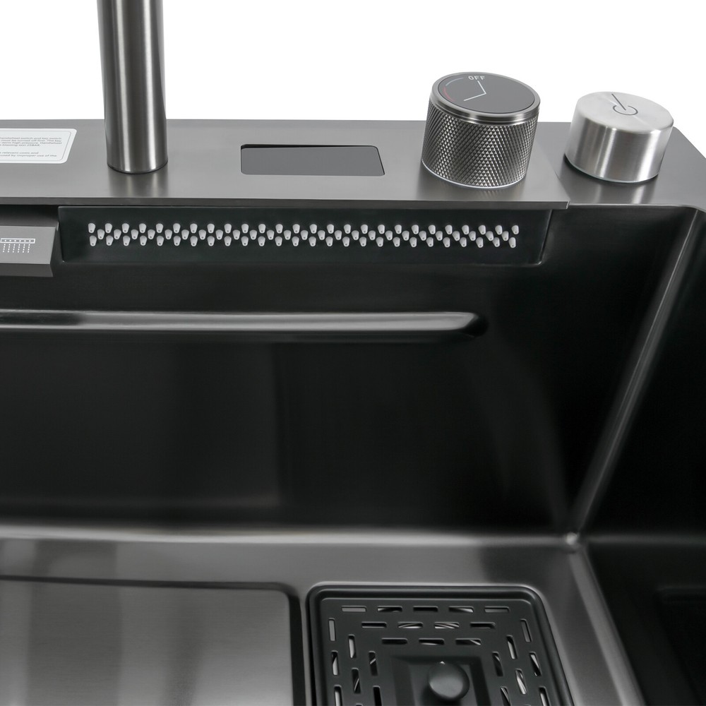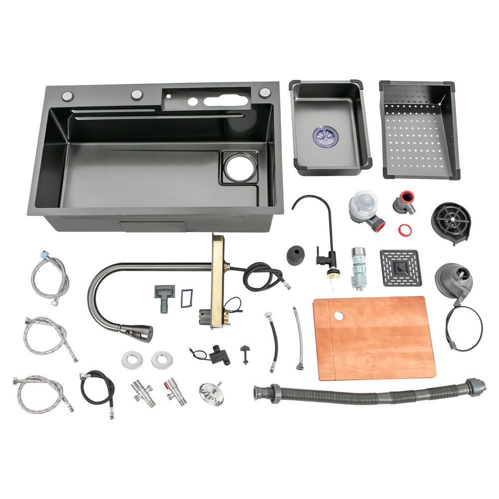 ☆WELCOME TO MY STORE!☆ Welcome to our store~ Description This 201 stainless steel sink adopts a nano-electroplating process, with exquisite workmanship, which is wear-resistant and corrosion-resistant. Its enlarged and deepened sink not only alleviates splashing problems but also increases space utilization for washing large quantities of cookware. It can not only be used as a traditional sink but also can hold a cutting board for chopping vegetables and meat. With it, you can enjoy a more convenient and healthier life. Key Features Build to Last: The premium 201 stainless steel, as well as the exquisite nano-electroplating process, make this product wear-resistant, heat-resistant, corrosion-resistant, and not easy to rust and deform, ensuring a long service life. Large Sink Size: It is large (29.5*18.1*7.9 inches) and can accommodate a large number of plates, dishes, and pots at once. Moreover, it prevents splashing when washing fruits and vegetables. Washing Assistant: The 360° pull-out faucet, three water dispensing modes, and the waterfall spout make the product a wide range of cleaning and more convenient to use. The smart temperature display allows you to easily monitor water temperature and improve the safety of use, and the hydroelectric design doesn't require an external power supply, which is energy-saving and efficient. Humanized Design: The anti-condensation coating prevents condensation in the sink and thus prevents moisture in the kitchen cabinets, and sound-deadening pads reduce noise. Additionally, the right-drain design effectively increases the utilization of cabinet space underneath the sink. Multi-functional: The double-rail design of this sink helps you achieve efficient cooking. It converts into a work platform with the flexibility to place the mobile cutting board and draining basket without taking up countertop space, which greatly saves your workspace and makes it easier and more efficient for you to wash vegetables and dishes. Quick Drainage: It has deflector slots at the bottom for good drainage, effectively preventing water from accumulating inside. It comes with a convenient knob, removable strainer, and a large-diameter drain that allows large amounts of water to drain quickly while preventing food debris from clogging the pipes. Easy Installation: The simple structure and complete set of mounting accessories allow for fast and accurate installation. In addition, different mounting methods can meet your different needs. Easy to Clean: The smooth surface and round corner allow you to easily clean it without leaving dead corners of dirt accumulation. Ideal Gift: This product is stylish and high-quality and can be used as an ideal housewarming, birthday, and holiday gift for parents, friends, and loved ones. Good Customer Service: We stand behind all our guests and look forward to assisting you with your purchase. It is our pleasure to answer your confusion and questions. The end of the story between us is not "we sell and you buy". Details High-pressure Cup Washer: With it, you can operate with one hand, cleaning cups faster and more convenient, while freeing your hands. Water Purification Faucet: The product comes with a separate water purification faucet, and you can connect it to a water purifier (not included) for clean water. Narrow Edge: This design saves space and meets a variety of installation methods. Drain Pipe: It can be bent freely to suit the installation position, reducing restrictions on use. Arcs Shape: The rounded and smooth edges not only add to the aesthetics of the product but also improve the safety of use. Application This product can be widely used in homes, restaurants, laundry rooms, basements, bars, kitchens, food trucks, dessert shops, coffee shops, hotels, garages, gardens, pet shops, etc. for cleaning tableware, vegetables, fruits, pets, etc. Specification Color: Black Style: Modern Shape: Rectangular Material: 201 Stainless Steel Process: Nano-electroplating Assembly Required: Yes Cold Water Pipe Length: 60cm/ 23.62 in Hot Water Pipe Length: 60cm/ 23.62 in Downpipe Length: 60cm/ 23.62 in Faucet Height: 40cm/ 15.7in Sink Size: 75*46*20 cm/ 29.5*18.1*7.9 in Gross Weight: 12kg/ 26.46 lbs Package Size: 81*52*28 cm/ 31.89*20.47*11.02 in Package Included 1* Sink 1* Digital Pull-out Faucet 1* Cutting Board All Accessories for Installation Notes Please note that the main water outlet switch needs to be turned off after each use. Please do not let soft iron, hard or rusty objects contact with the sink for a long time. Please do not wash items in the sink with strong acids and bases. Please clean the sink after each use and wipe it dry. Please allow the slight color difference caused by the shooting light and the 1-3 cm error due to manual measurement, and make sure you do not mind before ordering. Payment Delivery details Terms of sales About us Contact us Payment We accept ebay payment 。 Fees such as import duties, taxes are not included in the item price or shipping costs. These charges are the buyer's responsibility. Delivery details Shipping: 2-9 working days to: USA Terms of sales We maintain high standards of excellence and strive for hundred percent customer satisfaction. Feedback is very important to us. We hope that you contact us immediately before you give neutral or negative feedback, so that we can address your concerns. It is impossible to address issues if we do not know about them! About us Your satis faction is our ultimate goal. We work hard to earn your trust and future business. Our certified technicians have tested each item before shipping. The unit comes with 1 year limited warranty on all manufacturing defects. a) If you receive a defective item, you may return it or ask for a discount. Please contact us within 14 days after you receive the package. b) What you returned must be intact and in its original packaging as re? u. Customer is responsible for shipping costs of the returned item. c) We will cover the