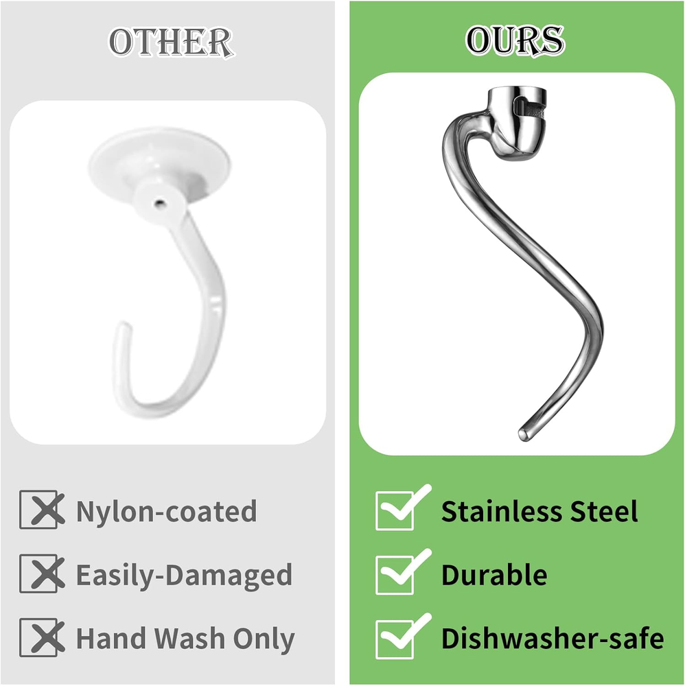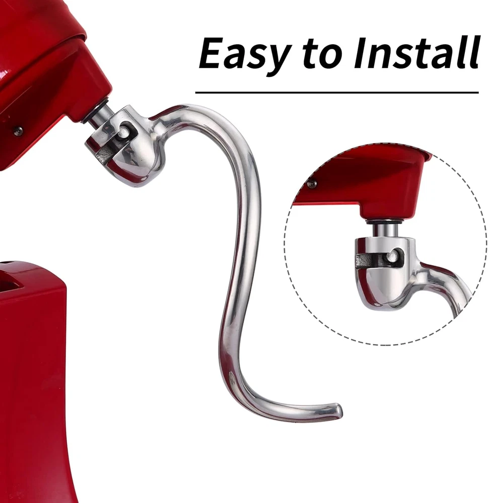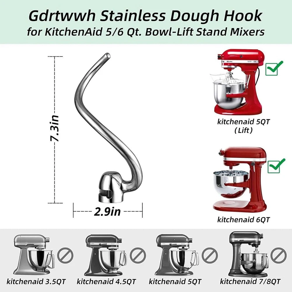 Stainless Steel Dough Hook Attachment Compatible with KitchenAid 5 & 6 Quart Bowl-Lift Mixers