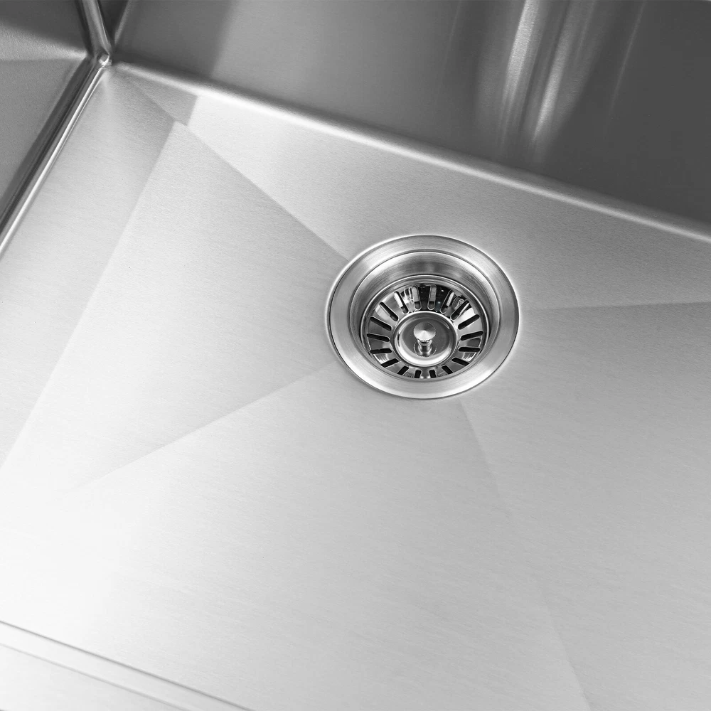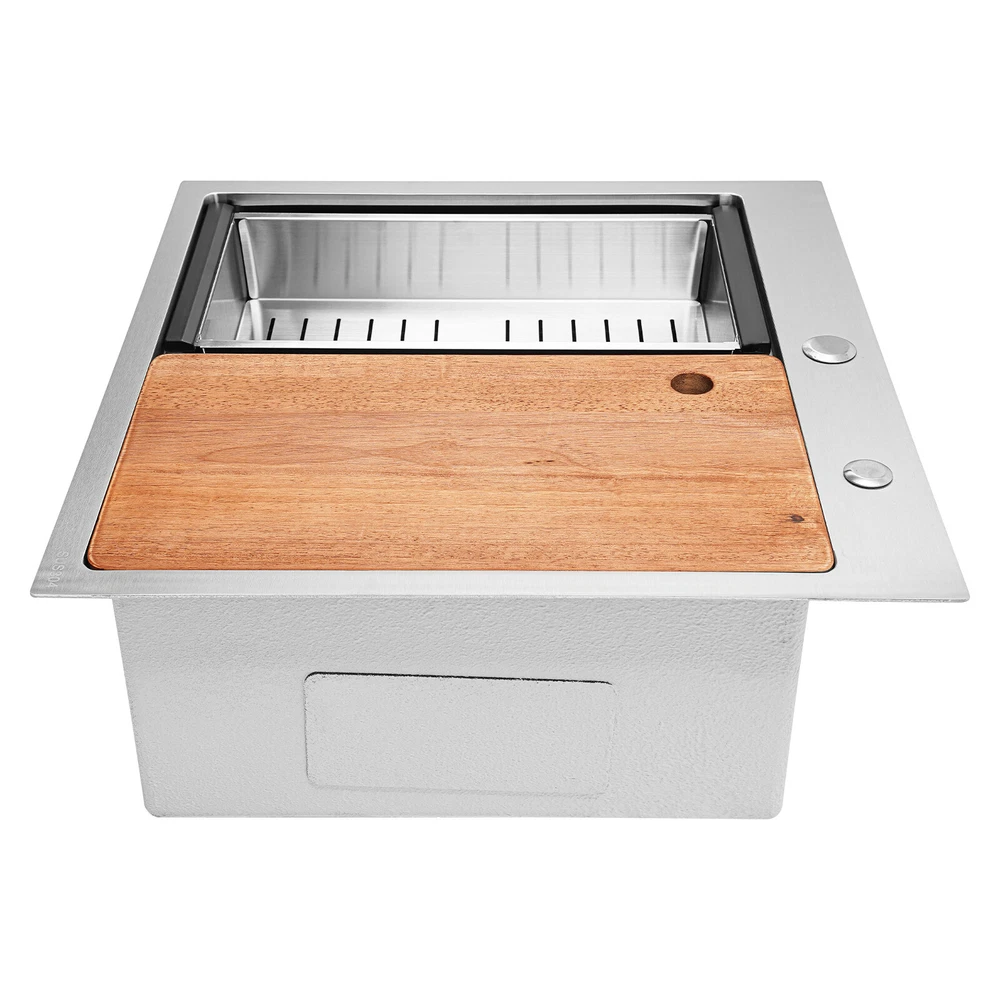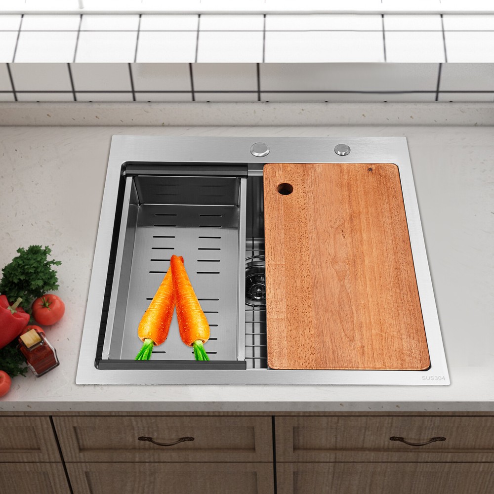 Kitchen Sink Drop-in Bar Sink Stainless Steel Topmount Kitchen Sink 23 x 22 Inch Description Made of high-quality 304 stainless steel, this kitchen sink is exquisitely crafted, wear- resistant , and corrosion- resistant . Its enlarged and deepened sink not only alleviates the splashing problem but also increases space utilization for cleaning numerous cookwares. The design with a cutting board, bottom rinse grid, roll-up dish drying rack and drainage frame allows you to wash and cut fruits and vegetables simultaneously, with which you can enjoy a more convenient life. Key Features Strong and Durable: Made of premium 304 stainless steel through the brushed process, it is corrosion and heat- resistant and will remain as good as new for a long time, even in the face of frequent daily use and all kinds of kitchen utensils collision. Space Optimization: The workstation sink is designed to hold the cutting board and drainage frame on a single track, maximizing the available space on the countertop. Large Capacity: Its large size ( 23*22in ) allows you to clean large amounts of plates, dishes, and pots, and wash fruits, and vegetables at one time without splashing, saving time. Life Assistant: This sink with a cutting board, bottom rinse grid, roll-up dish drying rack and drainage frame cleverly combines washing and meal preparation functions, allowing you to enjoy a convenient life. Invisible and Beautiful: It supports three mount types: top mount, flush mount, and under mount, which will not affect the aesthetics when the sink is flush with the countertop, and the smooth lines and low-key silver-colored appearance can also add a touch of simplicity and elegance to the kitchen. Hassle-free Cleaning: The brushed surface is not easy to leave marks, you can remove surface dust and grease by wiping with a damp cloth and detergent (not included). User Friendly: The rubber mute mat can effectively reduce the noise generated by the faucet water release and the collision of dishes, creating a quiet kitchen environment. The anti-condensation coating effectively prevents excessive temperature differences and protects the cabinet from moisture. Rapid Drainage: The X-shaped water guidelines and enlarged 3.5-inch drain hole help drain water quickly. The equipped drainage frame also ensures that the kitchen is dry and hygienic. Customer Service: We aim to provide quality products and services. If you have any problems, please feel free to contact us. We will reply to you and solve the problem for you as soon as possible. Details Rounded Corners: They are not easy to leave hygiene blind spots, making it convenient for you to clean the sink. Bottom Rinse Grid: With protective covers, it can prevent scratches on the kitchen utensils and sink. Utensils can be placed on the rinse grid for fast drainage. Roll-up Dish Drying Rack: It facilitates you to quickly clean your cookware and drain the bowl quickly to prevent bacteria growth. Hanging Hole: It is convenient for you to hang the cutting board freely in your kitchen after use to keep it dry and hygienic. Application It can be widely used in homes, restaurants, laundries, basements, bars, kitchens, food trucks, dessert stores, coffee shops, hotels, garages, gardens, etc. for washing dishes and cutting vegetables and fruits. Specification Material: 304 Stainless Steel Color: Silver Style: Modern Process: Brushed Shape: Rectangular Mount Type: Topmount, Undermount, Flushmount Assembly Required: Yes Thickness: 100mm/0.39in Drain Hole Diameter: 8.9cm/3.5in Cutting Board Size: 45*25cm/17.7*10in Drainage Frame Size: 45*24*6cm/17.7*9.4*2.4in Product Size: 58.4*55.8*22cm/23*22*8.7in Package Size: 63*50*28cm/24.8*19.69*11.02in Gross Weight: 11kg/24.25lbs Net Weight: 10.2kg/22.49lbs Package Included 1* Stainless Steel Kitchen Sink 1* Cutting Board 1* Bottom Rinse Grid 1* Strainer 1* Drainage Frame 1* Roll-up Dish Drying Rack All Accessories for Use Notes Please check the style and size before purchasing. Please do not scratch its surface with sharp objects to prolong its service life. If you want to get a better installation effect, we suggest you ask professional workers to install it. Please allow the slight color difference caused by the shooting light and 1-3cm error due to manual measurement and make sure you do not mind before ordering. Payment Delivery details Terms of sales About us Contact us Payment We accept ebay payment 。 Fees such as import duties, taxes are not included in the item price or shipping costs. These charges are the buyer's responsibility. Delivery details Shipping: 2-9 working days to: USA Terms of sales We maintain high standards of excellence and strive for hundred percent customer satisfaction. Feedback is very important to us. We hope that you contact us immediately before you give neutral or negative feedback, so that we can address your concerns. It is impossible to address issues if we do not know about them! About us Your satis faction is our ultimate goal. We work hard to earn your trust and future business. Our certified technicians have tested each item before shipping. The unit comes with 1 year limited warranty on all manufacturing defects. a) If you receive a defective item, you may return it or ask for a discount. Please contact us within 14 days after you receive the package. b) What you returned must be intact and in its original packaging as re? u. Customer is responsible for shipping costs of the returned item. c) We will cover the cost of shipping back t with the shipping rate indicated in the registration page. We will send you a new unit or refund the full payment you paid. Thank you. Contact us Business Hour Business Hour: Monday To Friday: 8:30 AM to 5:00 PM (Beijing China time) Due to time zones, our reply to your questions may not be immediately. But within above working time, we will reply your email within 24 hours. If it's non-workdays, please kindly be patient and wait till Monday. Please contact us with ebay mes