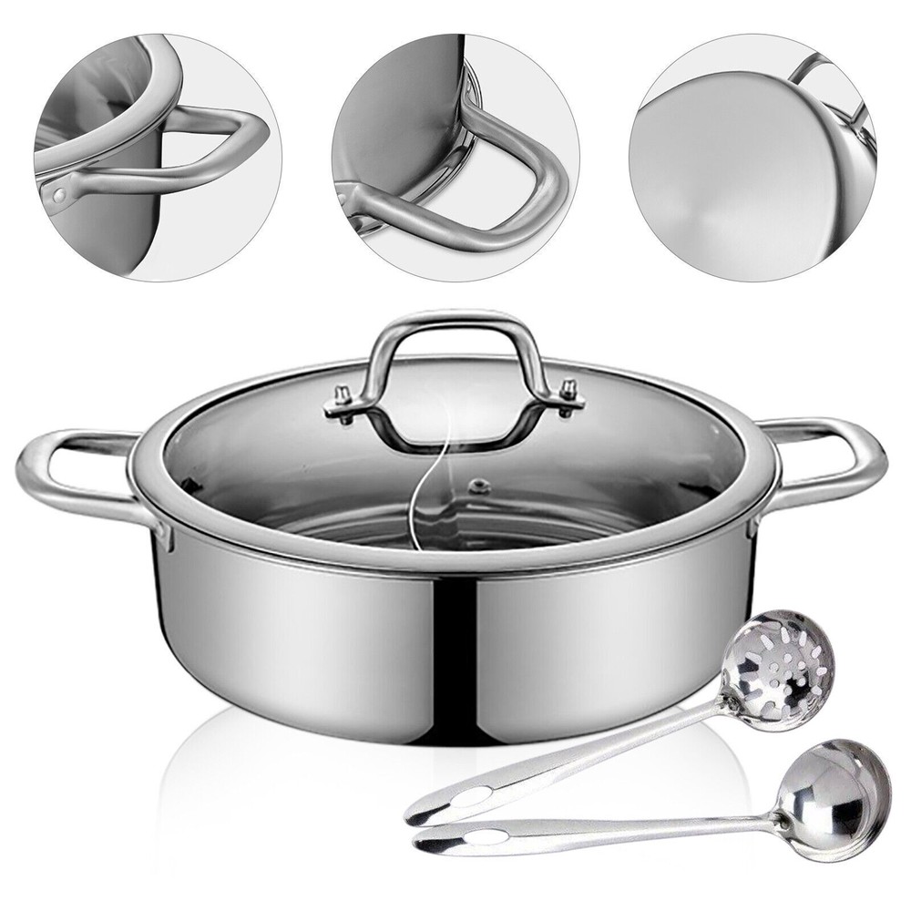 This hot pot is a game-changer for group meals! The dual-sided divider lets you cook two broths at once, perfect for different tastes. The 304 stainless steel is sturdy, heats evenly, and cleans easily. Comes with handy ladles and a tempered glass lid to monitor cooking. Works on all stove types—induction, gas, electric—making it super versatile. Great for family dinners or hosting friends, just like a restaurant experience at home!