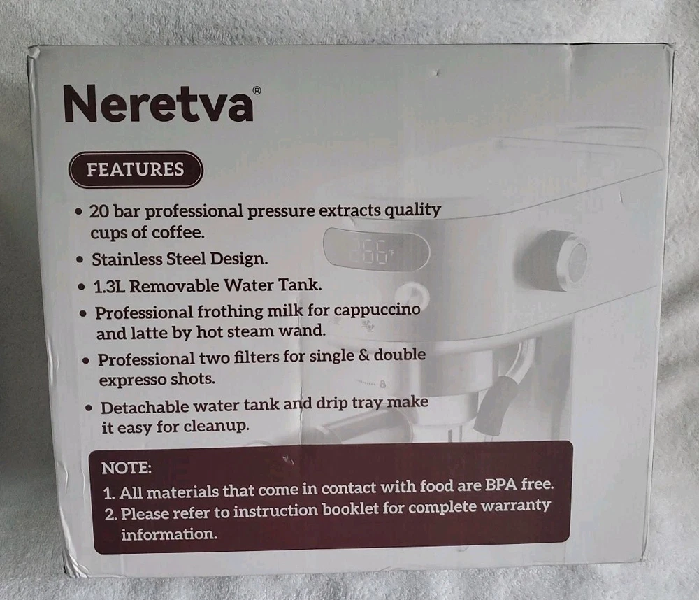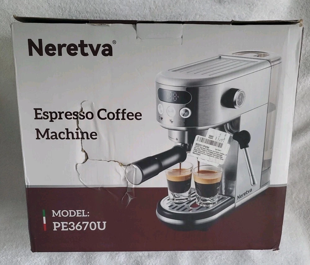 The Stainless Steel Espresso Machine by Neretva is a modern and sleek coffee maker designed for creating espresso and various coffee beverages. With a high pressure of 20 bar, it can produce rich and flavorful drinks like latte, mocha, cappuccino, and iced coffee. The machine features a steam wand, frother, and adjustable settings for single or double shots. It also includes an automatic shutoff, metallic exterior finish, and operates on a semi-automatic mode with touch control buttons. With a capacity of 1.305 liters and a wattage of 1350W, this espresso machine is a stylish and functional addition to any kitchen for coffee enthusiasts. *** Box May Show Signs Of Damage But Item Is In Perfect Condition (see pictures) ***