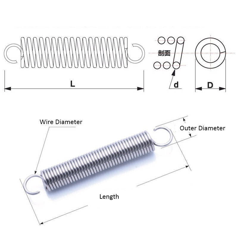 Extension Tension Spring Hook Ring-end 2x14mm 2x17mm Stainless Steel L=50~300mm Product Manual: Product Name. Open double-ended tension spring Product material: 304 stainless steel Product size: wire diameter * spring outer diameter * spring length mm For example: 0.8*6*305mm (wire diameter=0.8*spring outer diameter=6*spring length=305mm) Surface treatment: No treatment This product supports the size of large quantities of custom