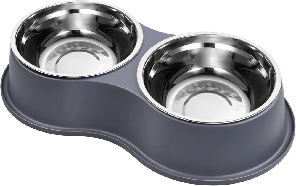 Double Stainless Steel Dog Bowls, 18oz × 2 Pet Food Water Bowls with Non-Slip Base, No-Spill Feeding Bowls for Small Medium Dogs Cats Puppies Kittens NOTE: The stainless steel double bowls are nested together during packaging for safe shipping. Please check if they are stuck together—you can separate them gently before use. 18oz Large Capacity Dual BowlsSet includes 2 × 18oz stainless steel bowls, ideal for serving food and water at the same time to meet daily feeding needs. Premium Food-Grade Stainless SteelConstructed with rust-proof, anti-corrosion, heat-resistant stainless steel, safe for hot food and long-lasting daily use. 4 Non-Slip Mats + No-Spill Resin BaseEquipped with 4 non-slip mats to stop sliding and reduce noise; the spill-proof design effectively keeps floors clean. Wide Application for Most PetsPerfectly sized for puppies, kittens, small dogs, cats, and medium dogs, suitable for multi-pet families. Anti-Skid & Mess-Free DesignStable base prevents tipping and splashing, saving you from frequent floor cleaning even for messy eaters.