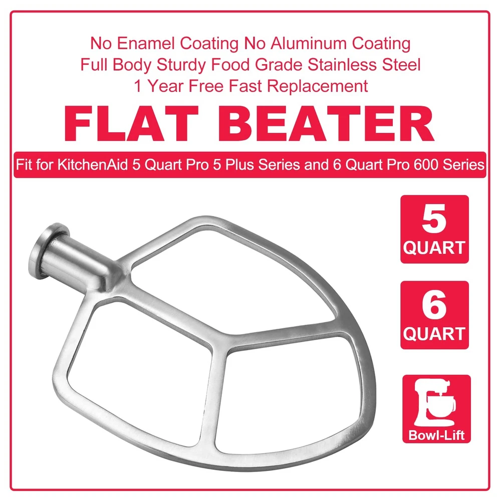 Stainless Steel Flat Beater Replacement for KitchenAid 5-6 Quart Bowl-Lift Professional Series đăMaking Home Baking EasierăThe flat beater attachment makes home baking easier by quickly and efficiently mixing ingredients together. This is especially useful for recipes that require a lot of mixing, such as cakes, cookies, and bread dough. " 5ď¸âŁ&6ď¸âŁăFit for 5 and 6 Quart Mixeră The flat beater attachment is designed to fit KitchenAid bowl lift 5 quart Professional 5 Plus series and 6 quart Professional 600 series mixers. This ensures that you get a perfect fit and optimal performance every time. đ ăQuality Stainless SteelăThe flat beater attachment is made of high-quality stainless steel, which is durable and long-lasting. It is also dishwasher safe, making it easy to clean and maintain. " đăSafe And Affordable Choiceă The flat beater attachment is a safe and affordable choice for home baking. By providing a quick and efficient way to mix ingredients, it helps you avoid the potential đăCareăwill escort you through your baking experience. We'll solve all your problems quickly, properly and thoughtfully, making your every choice a wise one!