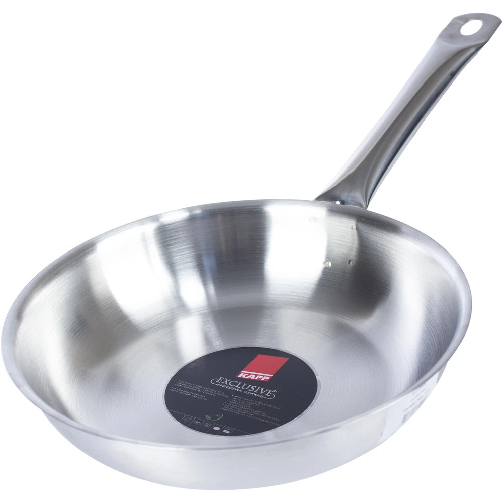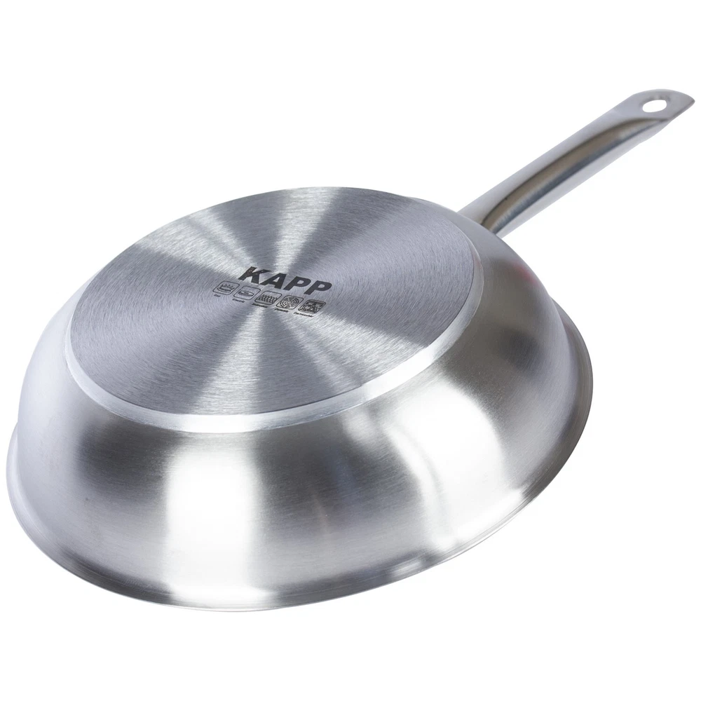 STAINLESS STEEL 18/10 BODY: Skillet made with brushed 18/10 stainless steel with an aluminum disc layered in the bottom for increased quality. This mixture of chromium and nickel allows for better heat distribution. These chromium binds to the stainless steel surface and protects it from harmful acid causing rust, stains, corrosion, or cracks in the material. It is specifically manufactured to allow the product to last long-term, especially in the harsh conditions of professional kitchen. ERGONOMIC COOKWARE DESIGN and superior features for optimal cooking performance.Stainless steel cooking surface does not discolor, react with food or alter flavors. PROFESSIONAL TRIPLE PLY CONSTRUCTION. The frying pans are constructed using a triple layer technique which contains stainless steel material on the outer layers and an aluminum layer in the middle for heat conduction purposes. Heat Surround Technology. Stainless steel cooking surface does not discolor, react with food or alter flavors. Works on Induction, gas, electric, glass, ceramic, halogen, etc.; Dishwasher safe" COOL TOUCH HANDLE: The stainless-steel long handle is reinforced with extra durability. Secured with riveted stainless-steel handles to ensure a safe grip and to add a bit of style. Updated cast-stainless-steel handle stays cool to the touch and comes riveted for strength. Our heat resistant handles provides customers with the comfort, quality, and safety from a product that is designed for everyday use. Suitable For All Stove Tops & Even Heat Distribution Benefits: Our products are compatible with all cooktops including induction, oven and broiler-safe up to 500°F. All the Cookware forms KAPP in PFOA-Free, SGS Certified. The frying pan will distribute the heat effectively so that it can cook foods more evenly with fewer hot spots, in turn saving more energy. This prevents areas of the cooking surface directly above the heat source to be much hotter than the other areas on the pan. Restaurant commercial grade quality products brought to your home. It is manufactured with commercial grade stainless steel. Professional kitchen supplies brought to your home with reasonable price.