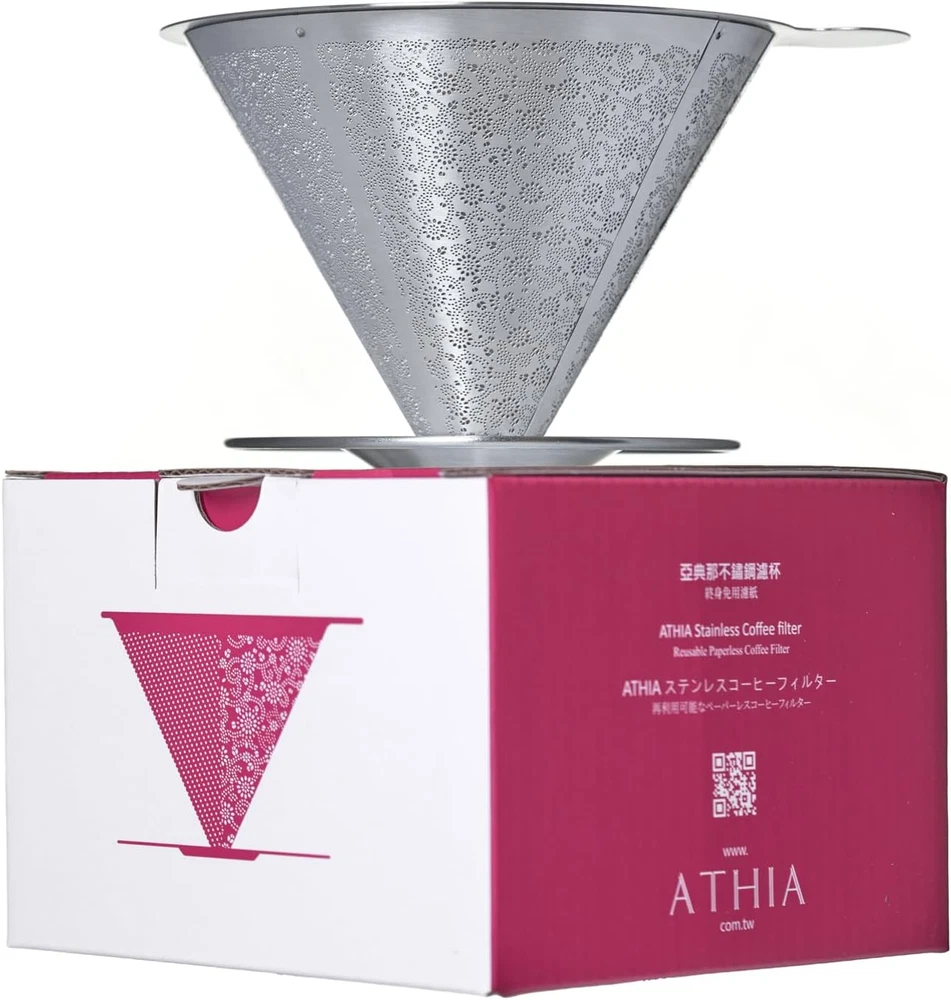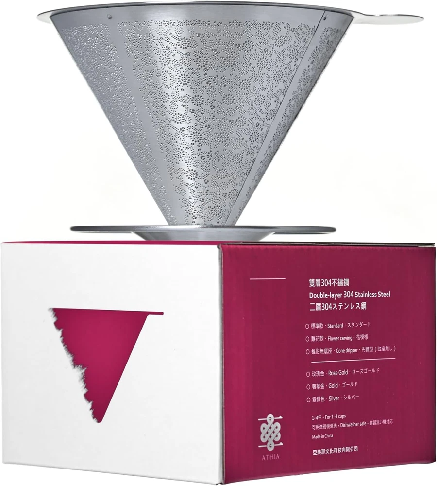 COMPATIBLE WITH MOST COFFEE MAKERS--ATHIA Golden Coffee Dripper is designed to fit Hario V60 02 and 03 drippers, as well as most standard coffee makers, coffee pots and mugs. RETAIN COFFEE AROMA--ATHIA Golden Coffee Dripper allows natural coffee bean oils and nutrients to filter through to your cup while eliminating the paper taste from traditional filters. Comparing with paper filters, the flavor becomes milder but deeper, and the aroma becomes more mellow by using ATHIA Golden Dripper. EASY to CLEAN-- After use, simply empty your coffee grounds and rinse ATHIA Golden Dripper under warm running water. We also recommend descaling your pour over filter every 2-3 weeks. Dishwasher safe. REUSE and SAVE MONEY-- ATHIA Golden Dripper allow you to use repeatedly. It provides with consistent results without sacrificing coffee quality. Your purchase may save 25,000 paper filters from heading to the landfill. By switching to ATHIA Golden coffee dripper, no more wasting money each month on paper filters. Eco-friendly Solution--ATHIA Golden Dripper provides an eco-friendly solution for pour-over coffee. To switch to ATHIA Golden Dripper today you’re helping save our planet tomorrow. Reduce, Reuse and Recycle! Product Description DOUBLE LAYERS 304 STAINLESS STEEL MADE COFFEE FILTERS Standard- Silver No more paper filters. Standard-Rose Golden No paper filter bleaching concern. Standard-Golden Not sticky powder and easy to clean. High quality coffee dripper It provides with consistent results without sacrificing coffee quality. It allows you to use repeatedly. RETAIN COFFEE AROMA milder but deeper ATHIA Golden Coffee Dripper allows natural coffee bean oils and nutrients to filter through to your cup while eliminating the paper taste from traditional filters. Comparing with paper filters, the flavor becomes milder but deeper, and the aroma becomes more mellow by using ATHIA Golden Dripper. ATHIA GOLDEN DRIPPER is made by double-layers 500 meshes with elaborated design ATHIA GOLDEN DRIPPER with elaborate carving-Rose Golden ATHIA GOLDEN DRIPPER with elaborate carving-silver ATHIA GOLDEN DRIPPER with elaborate carving-golden EASY to CLEAN After use, simply empty your coffee grounds and rinse ATHIA Golden Dripper under warm running water. We also recommend descaling your pour over filter every 2-3 weeks. Dishwasher safe. ATHIA GOLDEN DRIPPERs have cone shape design for your choice. Elaborate Golden and Rose golden are available. Eco choice ATHIA Golden Dripper provides high quality, delicate design and eco solution for pour-over coffee. Reuse and Save money Your purchase may save 25,000 paper filters from heading to the landfill. By switching to ATHIA Golden coffee dripper, no more wasting money each month on paper filters. upper view To switch to ATHIA Golden Dripper today you’re helping save our planet tomorrow. Reduce, Reuse and Recycle! Elaborate design golden rose golden rose golden Elaborate design to fit most coffee makers ATHIA Golden Coffee Dripper is designed to fit Hario V60 02 and 03 drippers, as well as most standard coffee makers, coffee pots and mugs.