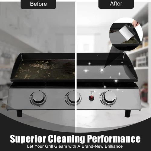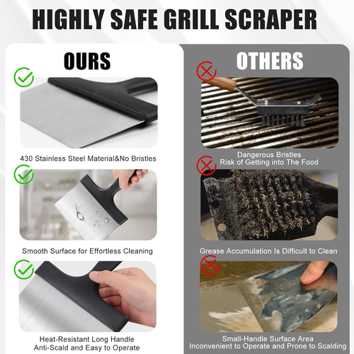 Grill Scraper, Griddle Scraper, Food Scraper with Handle for Blackstone Grill Accessories,Outdoor Barbecue Tools,Stainless Steel Scraper for Blackstone, Flat Top Grill Cleaning, Easy to Remove Stain LuxeFusion Product Description Features Large Surface for Easy Cleaning: Our grill scraper features a wide blade design that increases the cleaning area and enhances efficiency. The blackstone griddle scraper’s broad, sharp edge allows for quick scraping to remove stubborn residues and grease that sponges,soap,and water cannot tackle.Moreover,unlike wire grill brushes, this blackstone scraper has no bristles, eliminating concerns about bristles breaking off and contaminating food. Safety Anti-Scald Handle:Our grill scraper's handle is ergonomically designed for a comfortable grip, effectively reducing fatigue during use. Made from high-quality heat-resistant plastic, this griddle scraper provides additional safety against burns while cleaning. A convenient hanging hole at the end of the handle offers more storage options. (Note:The grill scraper is recommended to wait until the grill cools down before using the blackstone scraper for griddle to avoid damaging the handle.) Premium Heat-Resistant Material: Crafted from high-strength stainless steel, this griddle scraper enhances durability while preventing rust and corrosion. The grill scraper’s thickened stainless steel construction is heat-resistant, ensuring the blackstone scraper won't warp or get damaged during grilling, making the grill scraper for outdoor grill suitable for both hot and cold surface cleaning tasks. Multi-Functional for Various Uses: This blackstone griddle scraper serves not only as a cleaning tool for removing stubborn grime and food debris from grills but also features sharp edges that can be used for slicing vegetables,flipping food or even suitable for mixing chocolate! Whether for family gatherings or outdoor barbecues, this griddle scraper meets diverse needs effortlessly. What will you receive:In addition to a grill scraper, you will also benefit from our 24/7 online customer support service, ensuring you have peace of mind whenever you need assistance. Product Details Product Dimensions: 8.8 x 6.5 x 0.69 inches Item Weight: 7.7 ounces Manufacturer: HANWRAPS Country of Origin: China Item model number: GS-02 🚚 Free Shipping All orders ship free and fast to your doorstep. 🔁 Easy Returns Satisfaction guaranteed. 30-day returns, no questions asked. 💬 24/7 Support Contact us anytime; we’re here to help, day or night. Brought to you by LuxeFusion – Quality you can trust.