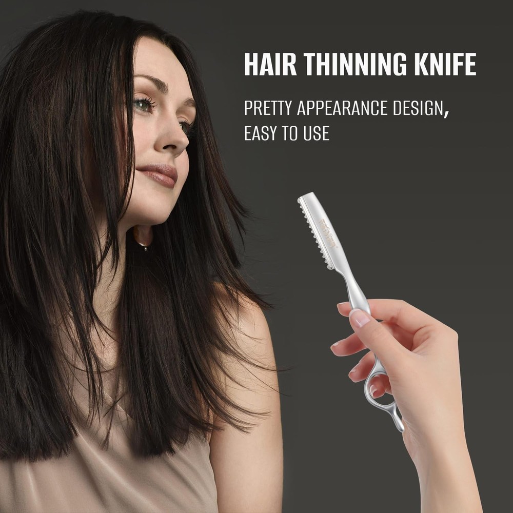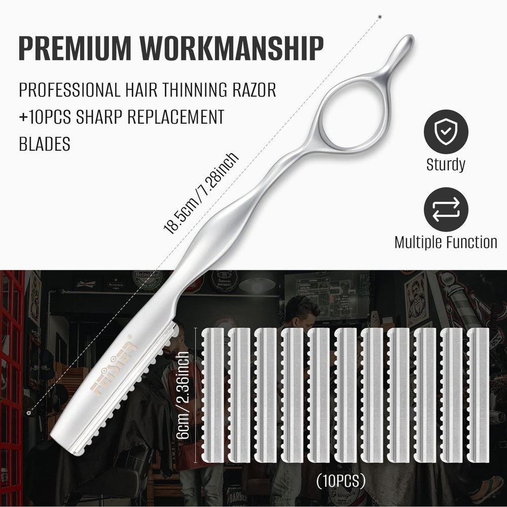 Stainless Steel Hair Thinning Styling Razors for Cutting Hair, Silver Product Details Product Dimensions : 7.28 x 0.98 x 0.28 inches; 4.16 ounces Manufacturer : FEISIER Brand: FEISIER Number of Blades: 10 Recommended Uses For Product: Hair Thinning Styling Age Range (Description): Adult Skin Type: Normal 【DURABLE MATERIAL】: The Hair thinning razor is made of stainless steel and inclued 10 replacement blades in a box. The quantity is enough to meet your daily use and replacement, and can provide you with long-lasting service. 【UNIQUE DESIGN】: The appearance of adopts matte finish,the frosted look more advanced. The handle is ergonomically designed and functional, reducing thumb and wrist hyperextension and relaxing elbows and wrists. 【EASY TO USE】: Hair thinning razor easy to install,quick blade insert and remove, thinning Razor is innovatively designed for smooth styling experience.Easy for anyone to use, suitable for salon, home and personal use, giving you a relaxing and shaving experience. 【SAFETY CUTTING HAIR】: Hair thinning knife with safety guard, better prevent skin from being scratched.Also note that it comes with sharp blades, should be handled with care. 【VARIOUS FUNCTION】: Slender razor edge can be used for thin bangs, shaving, trimming hair, etc, you can also use them to trim wigs and pet's bristle.Favorite hair thinning knife for stylists and barbers, suitable for all types of hair.
