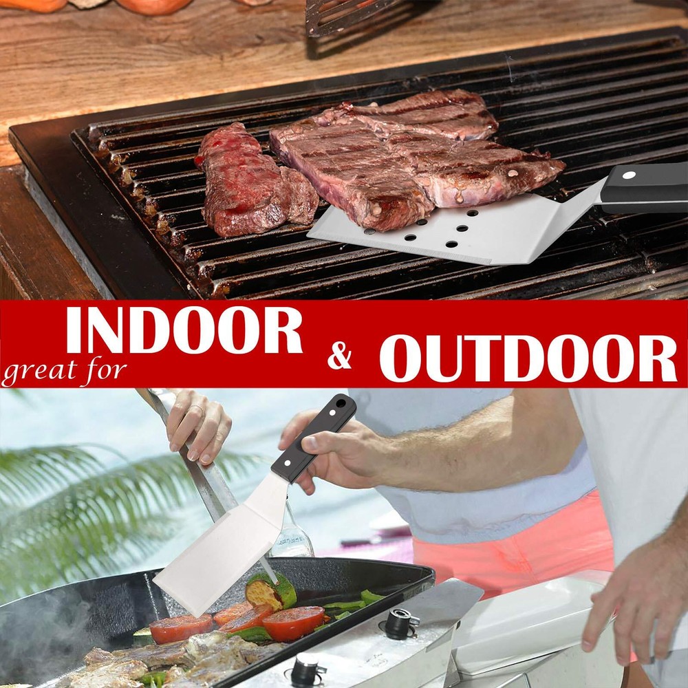 HaSteeL Metal Spatulas, Stainless Steel Griddle Spatula Tools with Riveted Handle, Heavy Duty Burger Turner for Teppanyaki BBQ Flat Top Hibachi Cast Iron Grilling Cooking, Dishwasher Safe - (2Packs) GRIDDLE SET - Including a solid metal spatula and a perforated burger turner to meet different cooking needs, Size 11.5in and blade width 3in, Plus 2 hooks for convenient hanging and storage without mess, Dishwasher safe DURABLE & STURDY - Made of high quality stainless steel ensure a long service life, Up to 1.5mm thickness of heavy duty metal hold heavier stuff without bending, Matte finished and smooth metal for easy and safe cleaning RIVETED HANDLE - ABS plastic handle with triple rivets is more stable than those flimsy ones, Ergonomic handle fits perfectly into extended metal part and ensure a better use, Non falling nails and wobbling handles BEVELED EDGE - Advantage of 3-sided beveled edges make flipping, frying, transferring and lifting effortless, Sharp enough for great cutting and scraping, Perforated surface can filter extra grease or liquid A MUST HAVE - Multipurpose for indoor and outdoor, Like kitchen cooking and baking for homemakers, restaurant serving and preparing for chefs, backyard party, cookouts, camping, tailgating for BBQ fans HaSteel Metal Griddle Spatula Set of 2 is made of premium stainless steel with solid handle to make you feel like a grill pro. Built to last by 1.5mm thickness of heavy duty metal to ensure bending proof. Ergonomic ABS handles are heat proof to protect your hands from scalding and ensure a comfortable grip. 45° angled structure and beveled edge make cooking, flipping and frying much easier and reduce fatigue while use. Specifications: Content: 1 x Solid Metal Spatula, Size L 11.5in by W 3in 1 x Perforated Burger Turner, Size L 11.5in by W 3in 2 x Hanging Hooks Blade Material: High Quality stainless Steel Handle Material: Heatproof ABS Plastic Using tips: 1. Use warm soap water to wash thoroughly those residue left from manufacturing before first use. 2. Used mild detergent to clean up after each use, then dry it by soft rag immediately instead of air dry to avoid water stains. 3. Store it in a dry place to keep its beautiful surface and durability. Satisfaction guarantee: HaSteeL attach great importance to every customer’s complete satisfaction and shopping experience. Your support and trust in us are just what we are strive for. We’re always here to solve problem for you at the first time. Shipping We offer FREE shipping on all orders! We ship within Three business days of payment, usually sooner. We use a selection of shipping services such as UPS, FedEx, USPS etc. We only ship to the lower 48 states, no APO/FPO addresses or PO Boxes allowed. Local pickups and combined shipping options are not provided at this time. Return You can return a product for up to 30 days from the date you purchased it. Any product you return must be in the same condition you received it and in the original packaging. Please keep the receipt. Payment We accept payment by any of the following methods: PayPal Please pay as soon as possible after winning an auction, as that will allow us to post your item to you sooner! Feedback Customer satisfaction is very important to us. If you have any problem with your order, please contact us and we will do our best to make you satisfied. Contact Us If you have any queries, please contact us via ebay. We usually respond within 24 hours on weekdays. Please visit our eBay store to check out other items for sale! Thank you for shopping at our store.