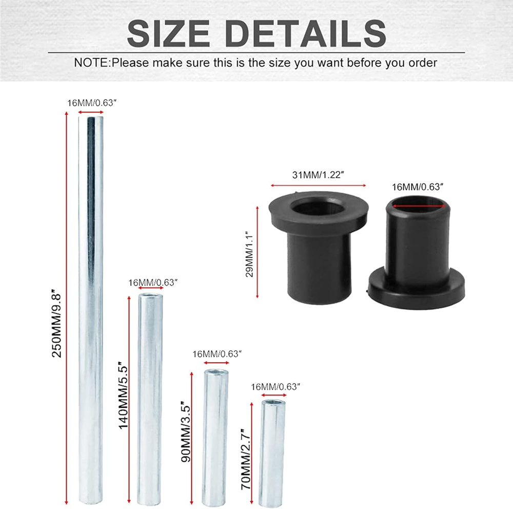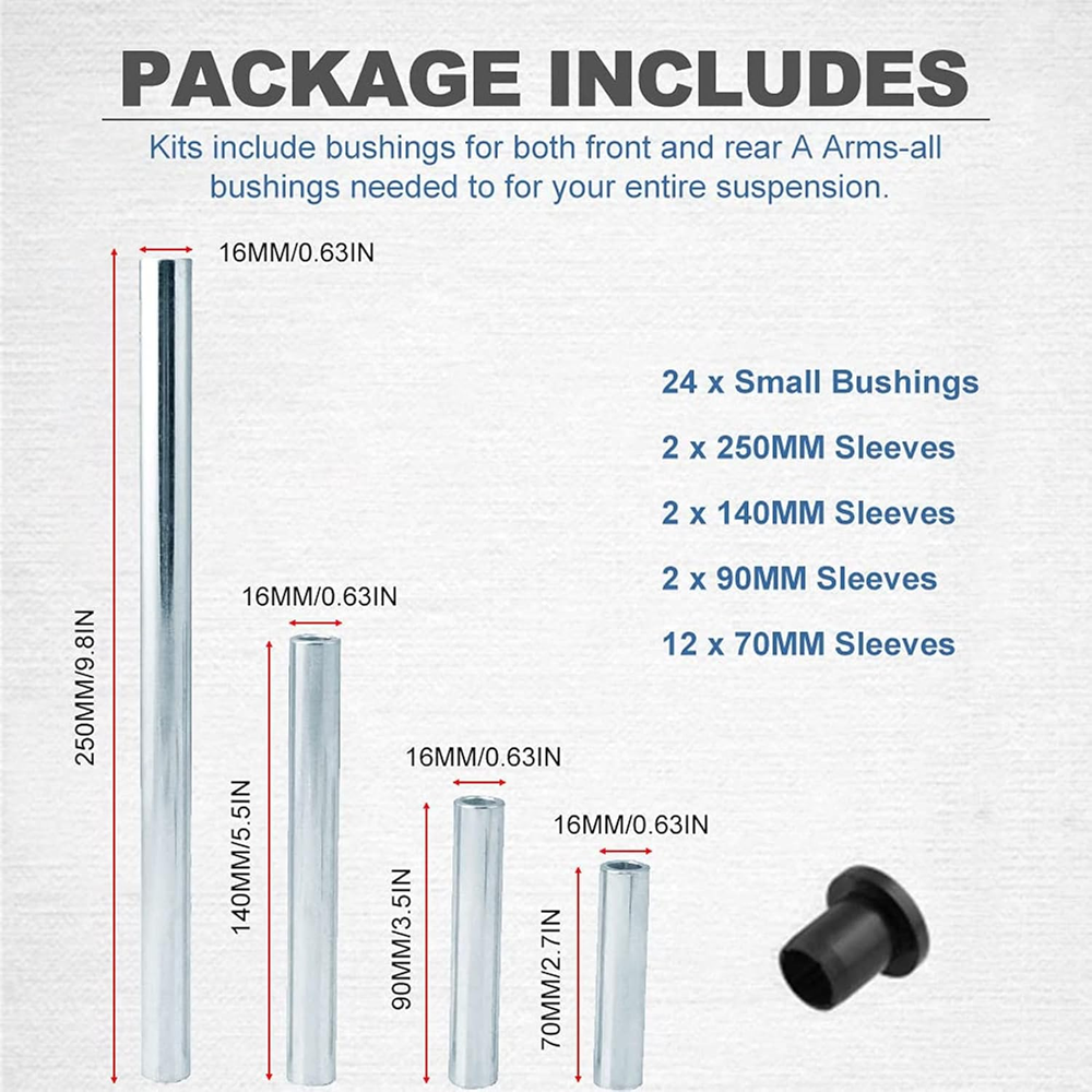 Store New Arrivals Add to Favorite View Feedback Contact Stainless Steel Heavy-Duty A-Arm Control Arm Bushings Kit Brake Suspension Compatible with Polaris Ranger XP 900 / Crew 2013-2021 (Front and Rear) Description Item Weight 0.035 ounces Manufacturer Part Number MB-ABK004 Package Dimensions 8.98 x 6.61 x 3.23 inches 【Compatible with】 Compatible with 2013+ Polaris Ranger XP 900, 2014+ Polaris Ranger XP 900 Crew. 【Easy to install】 Direct and easy installation. 【Function】ushings are suitable for front and rear A-arms, the number of bushings meets the needs of the entire suspension. Control arm bushings with heavy-duty material will provide better cushion performance for your vehicle, reducing the friction between different parts, and protect the front and rear suspension." 【Excellent Quality】using high-quality Iron and polypropylene as raw material. The raw materials meet the standards. 【Package Include】36× Plastic Bases, 18× Sleeves.(As the picture shows) Product Description Compatible with Compatible with 2013+ Polaris Ranger XP 900, 2014+ Polaris Ranger XP 900 Crew. Feature Function: Ushings are suitable for front and rear A-arms, the number of bushings meets the needs of the entire suspension. Control arm bushings with heavy-duty material will provide better cushion performance for your vehicle, reducing the friction between different parts, and protect the front and rear suspension." Excellent Quality: Using high-quality Iron and polypropylene as raw material. The raw materials meet the standards. What will you get Plastic Bases * 36 Sleeves * 18 Installation Step 1 Remove the cover plate, jack up the car, remove the front wheel. Step 2 Unscrew all the bolts connected with a-arm(including the bottom plate and the connection of shock absorber) and remove a-arm. Step 3 Dismantle the old sleeves & bushings and clean the a-arm. Step 4 Select sleeves of appropriate length and install after full lubrication. ABOUT US We offer the best prices around on high quality products. Our E-store includes media such as books, movies, music and games while offering electronics, toys, sporting apparel, clothing, tools, general home, garden items and more. SHIPPING We are always working hard to ensure your package arrives as soon as possible. Please understand that some factors like weather, high postal traffic, and the performance of shipping companies are outside of our control. We offer free shipping to the lower 48 states and ship within 2 business days of payment, usually sooner. We do not accept P.O. Boxes. Please provide a physical address. For shipping outside of the continental USA, we only use eBay's Global Shipping Program.The item is shipped to KY and then sent to the rest of the world. International customers are responsible for all duties and taxes. Continue to check out in order to calculate costs for shipping the item to your country. Messages regarding eBay's Global Shipping Program MUST be directed at eBay EXCLUSIVELY. RETURNS We offer a 30-Day Return Policy on items which you are not completely satisfied with. You have the option for a full-refund or an exchange of the item. No returns are available on items shipped outside of the USA. PAYMENT We accept PayPal. CONTACT US This page content is yet to come Please ad us to your favorite seller and visit again later Thank You CUSTOMER SATISFACTION We try our very best to make sure every customer is completely satisfied. If there's a problem, message us! We're happy to help. WE ACCEPT Copyright © 2021 AutoDS. | All Rights Reserved