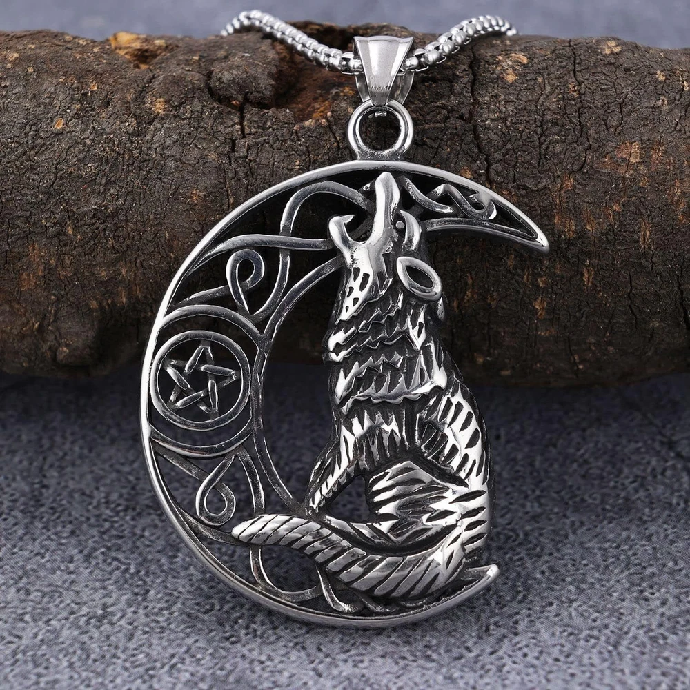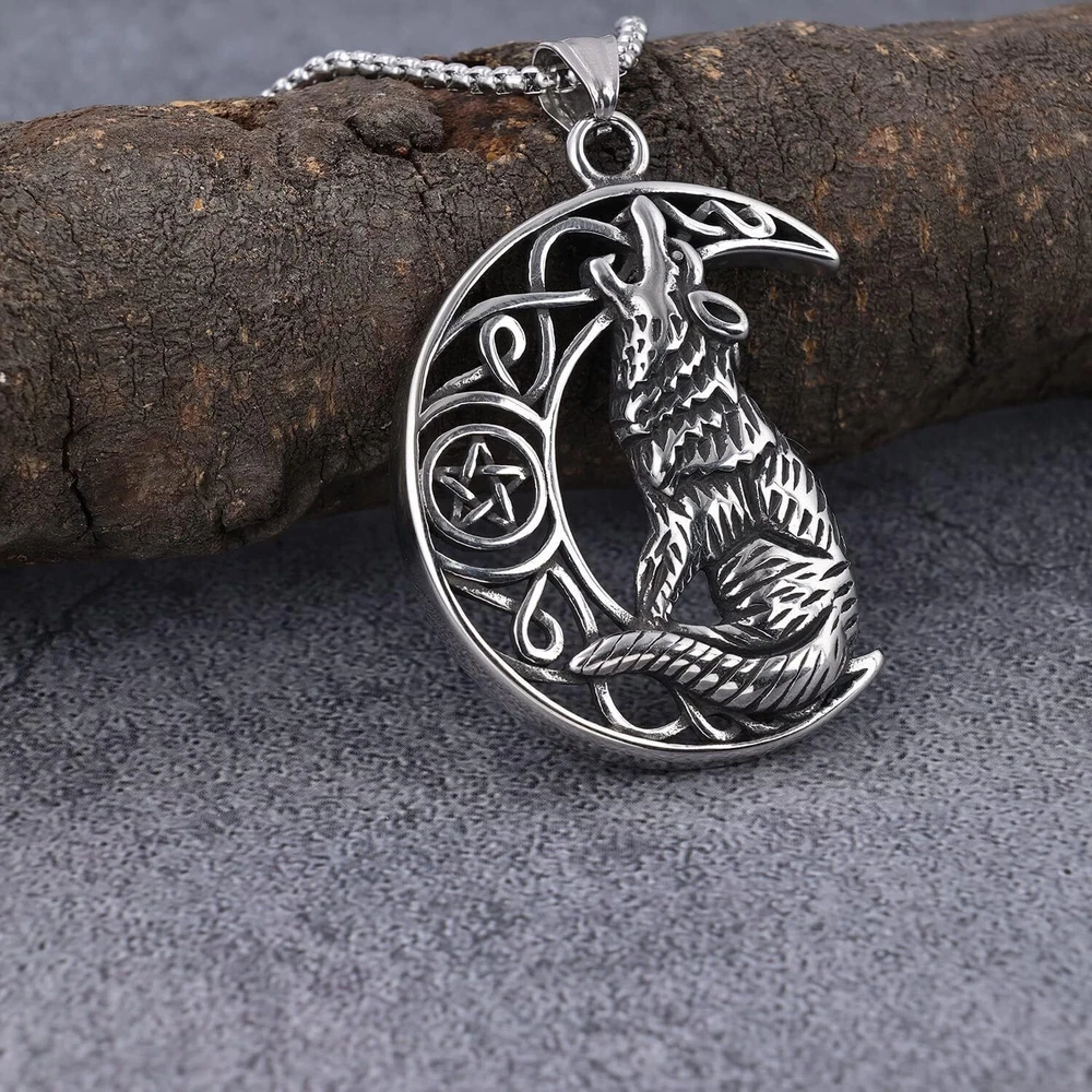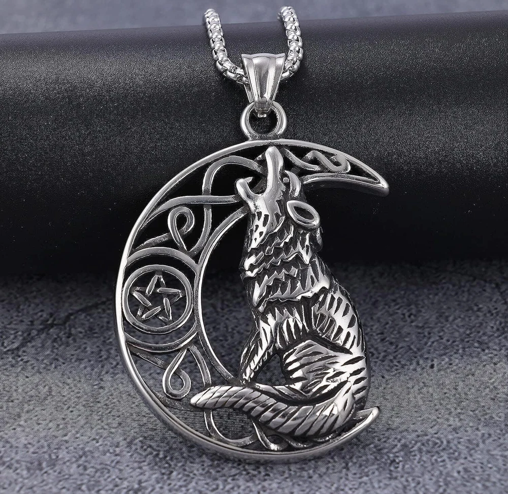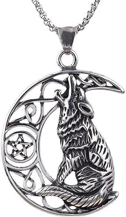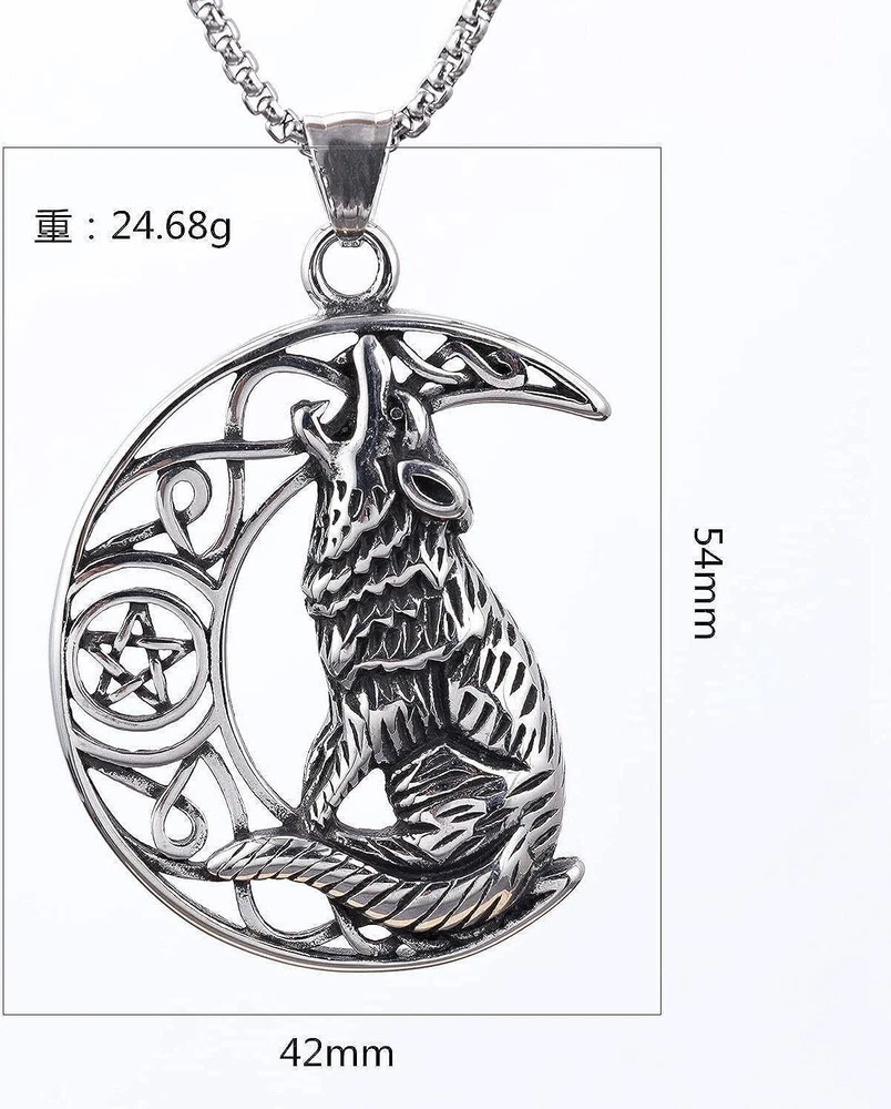 HOWLING WOLF NECKLACE: This totem pendant depicts the spiritual connection between the wolf and the moon, featuring a howling wolf sitting on the crescent moon with Celtic knots and a pentacle Hollow crescent wolf Pendant size: 54*42mm. Chain Length 60cm Material: 316L Stainless Steel celtic jewelry necklace , hypoallergenic, tarnish resistant,nickel-free,lead-free,cadmium-free,suitable for long-term wear,especially sensitive skin women. IDEAL GIFT: Get this stunning piece of jewelry for yourself or your loved one as a unique Valentine's Day, Christmas, birthday or anniversary gift. Brand : Cy trendy Metal (Pendant): 316L Stainless Steel Metal (Chain): 316L Stainless Steel Pendant Size: 54mm*42mm Chain length: 60cm Pendant Weight: 25g We offer high quality rings and necklaces, Not like many others who misclaim their rings are made of 316L are actually 304 or 316 steel, We use GENUINE 316L Stainless Steel as material,The 316L stainless steel do not suffer corrosion,tarnish or rust when expose in wet environment, it is one of the best metal when choosing rust resistance rings and necklaces because of it's sufficiently reactive to protect itself from further attack by forming passive corrosion product layer Package include : 1 x necklace