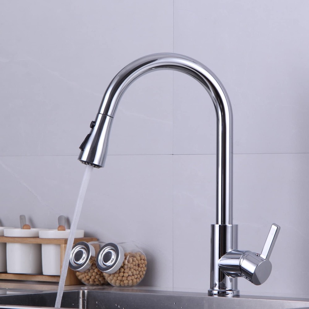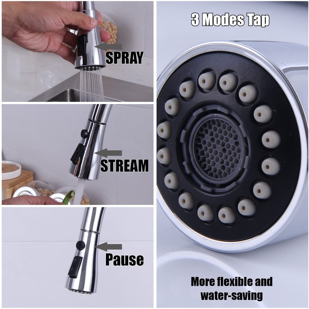 Features: PULL OUT & SWIVELS 360Retractable pull-out hose with handle docking arm creates smooth operation, easy movement and maximizes reachability in and around the sink in daily use. DUAL-FUNCTION SPRAYHEADoffers aerated stream for everyday cleaning and powerful spray for heavy-duty rinsing and easy cleanup. The pause button control the steam out as you need. EASY OPERATIONHigh arc kitchen sink taps, which effectively break the space constraint, provide full-range kitchen sink coverage with an 50cm retractable hose, 360 rotating sprayer and spout. The single handle is easy to operate, allowing you to adjust temperature and water flow easily. Include PEX hoses that can withstand high temperatures, which helps assist leaks and bursts. EASY TO CLEAN & QUICK INSTALLATIONThe mixer tap's nozzle can be removed for regular cleaning and replacement. The surface of the faucet is treated with multi-layer materials that make it easier to maintain. It prevents stains from remaining and can be simply wiped with a rag. Installation takes only about 20 minutes. NO Plumber Required. Detailed instructions are included. Detailed installation video also available. BUY WITH CONFIDENCE TAPS2 years. If you have any problems with your accessories used, you can send us an email at any time. We will provide you with new accessories. Please note: the sprayhead is made of plastic. More convenient to use and avoid burning your hands.