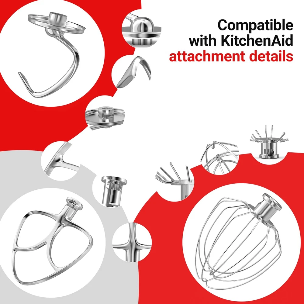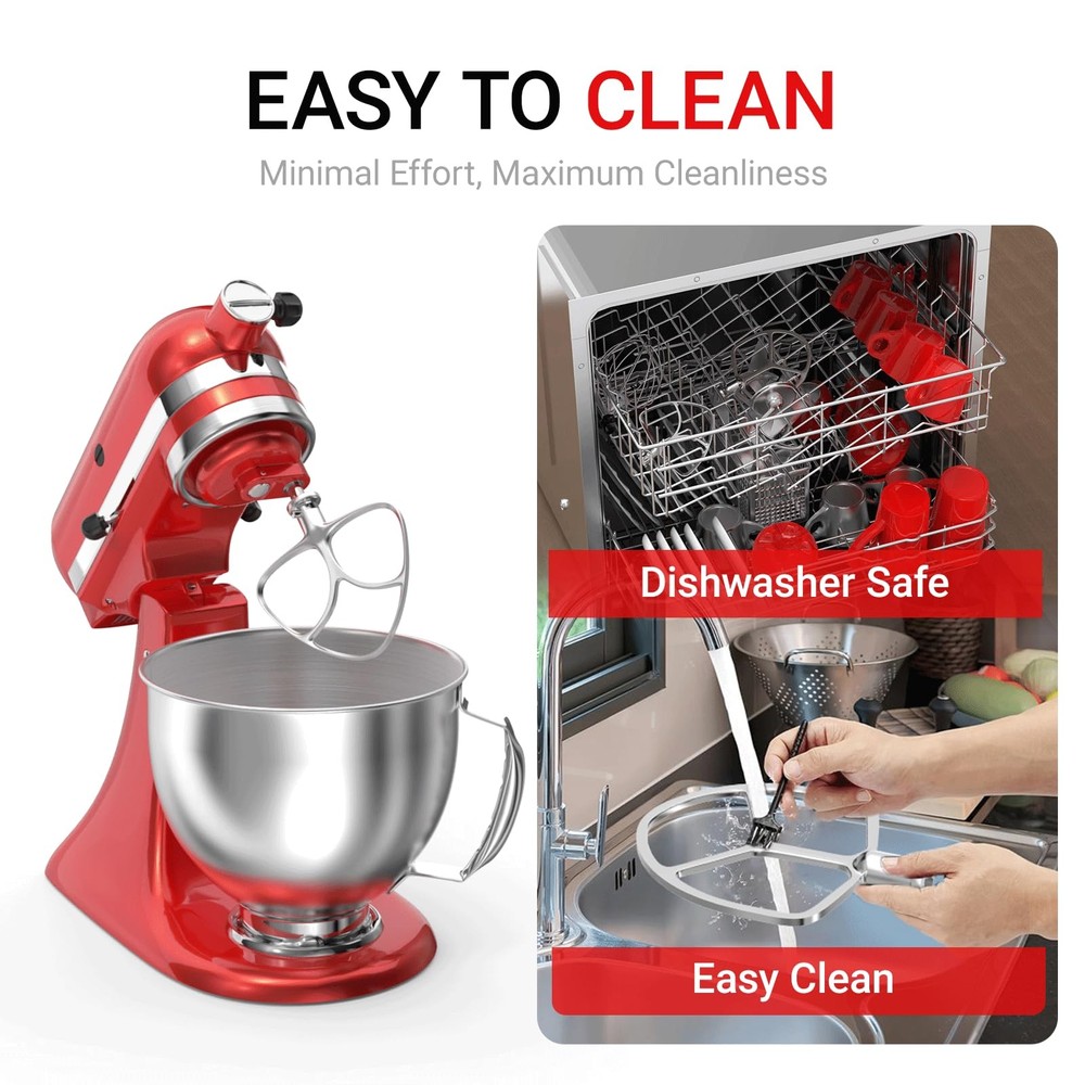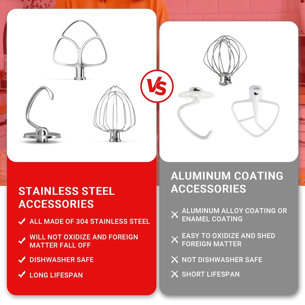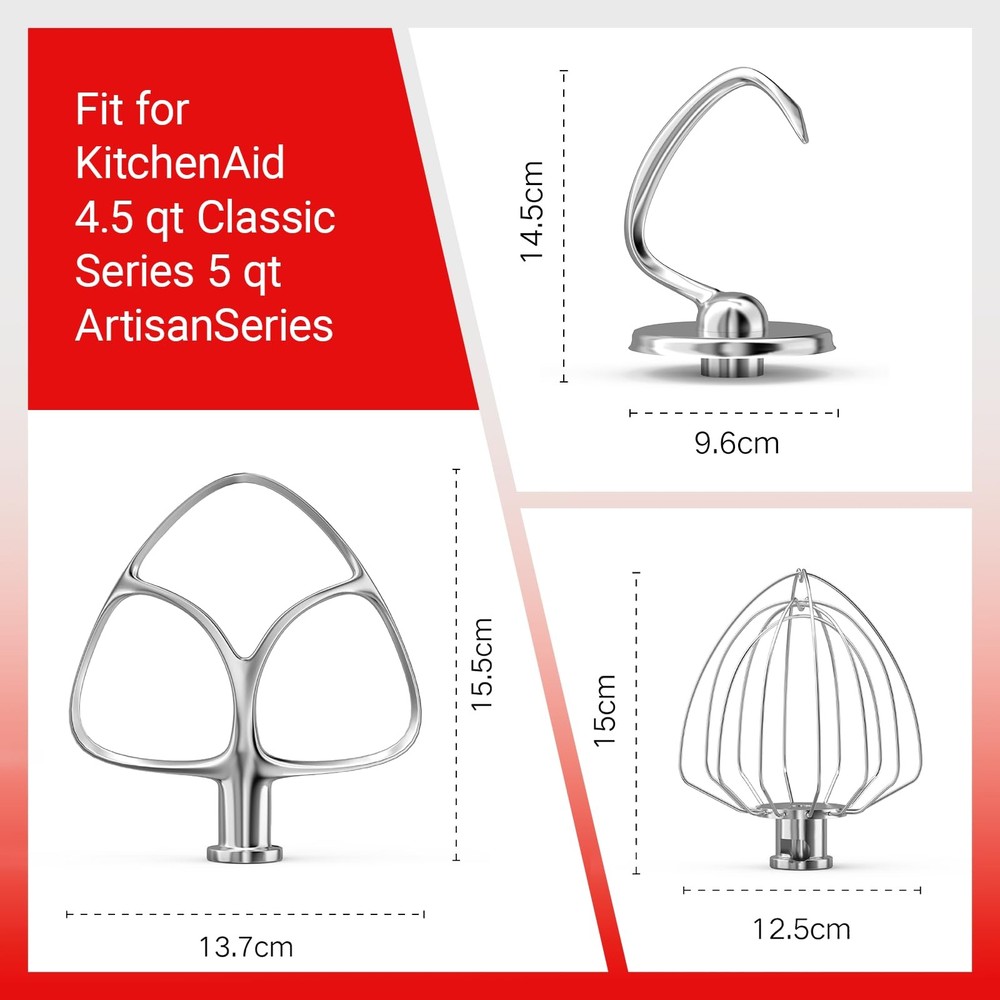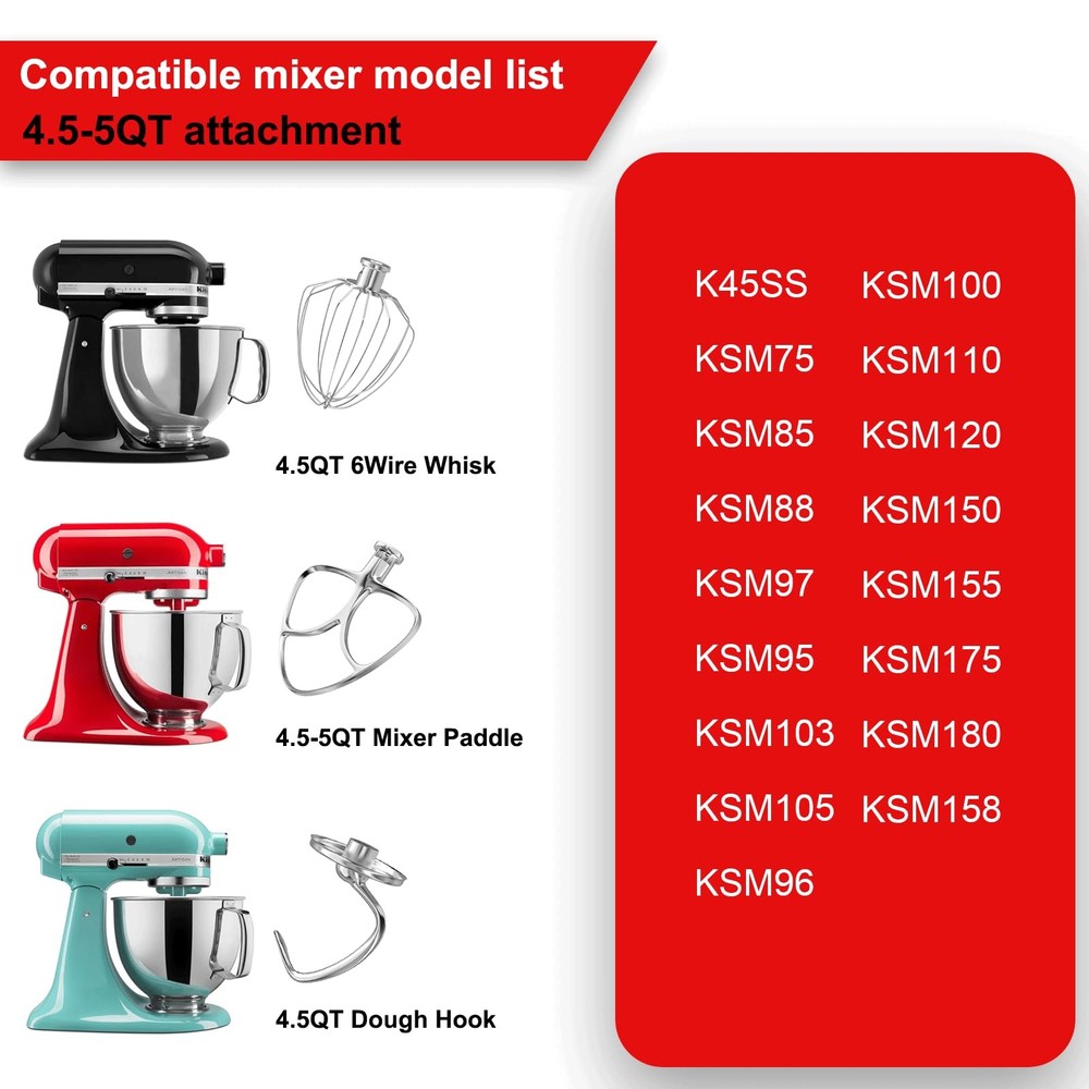 Stainless Steel Kitchen Mixers Accessories Compatible with KitchenAid Mixer and 4.5-5 Qt Bowl. K45WW 6-Wire Whip, 4.5-5QT Flat Beater Paddle, 4.5-5QT Dough Hook Attachment Dishwasher safe [Fit for 4.5 and 5 Quart Mixer]: FitsKSM100 KSM110 KSM120 KSM150 KSM155 KSM175 KSM180 KSM158 K45SS KSM75 KSM85 KSM88 KSM97 KSM95 KSM103 KSM105 KSM96 etc.Before buying, please check your KitchenAid Tilt-Stand faucet model (NOTE: This accessory only fits the model shown in the picture and the 4.5-5 qt Slanted Head Kitchen Aid mixer.) [Stainless steel material]: This kitchen aid 3-piece attachment is made of food-grade stainless steel, which is safe and healthy, and ensures that the mixing attachment is sturdy and durable. It can withstand frequent mixing and long-term use, providing a reliable choice for your cooking. [Easy to clean]: The smooth surface is not easy to stick to food residues, making this stainless steel 3-piece attachment for Kitchen Aid mixer very easy to clean. You can simply rinse it with water or put it in the dishwasher, giving you more time to focus on baking. [Comprehensive 3-Piece Set]: Designed as a value-packed solution for KitchenAid 4.5-5QT bowl-lift stand mixers, this trio seamlessly replaces the original accessories while offering enhanced versatility. The 6-wire whisk ensures rapid aeration for fluffy meringues and whipped cream; the flat beater handles cookie dough and batters with precision, while the dough hook tackles heavy bread doughs effortlessly. (The only items in this set are: K45WW 6-Wire Whip, 4.5-5QT Flat Beater Paddle, 4.5-5QT Dough Hook Attachment) [Efficient Service]: If you are not sure whether this accessory will match your KitchenAid mixer, please feel free to contact us, or please leave your question in the Q&A feature. We will be happy to answer your question.