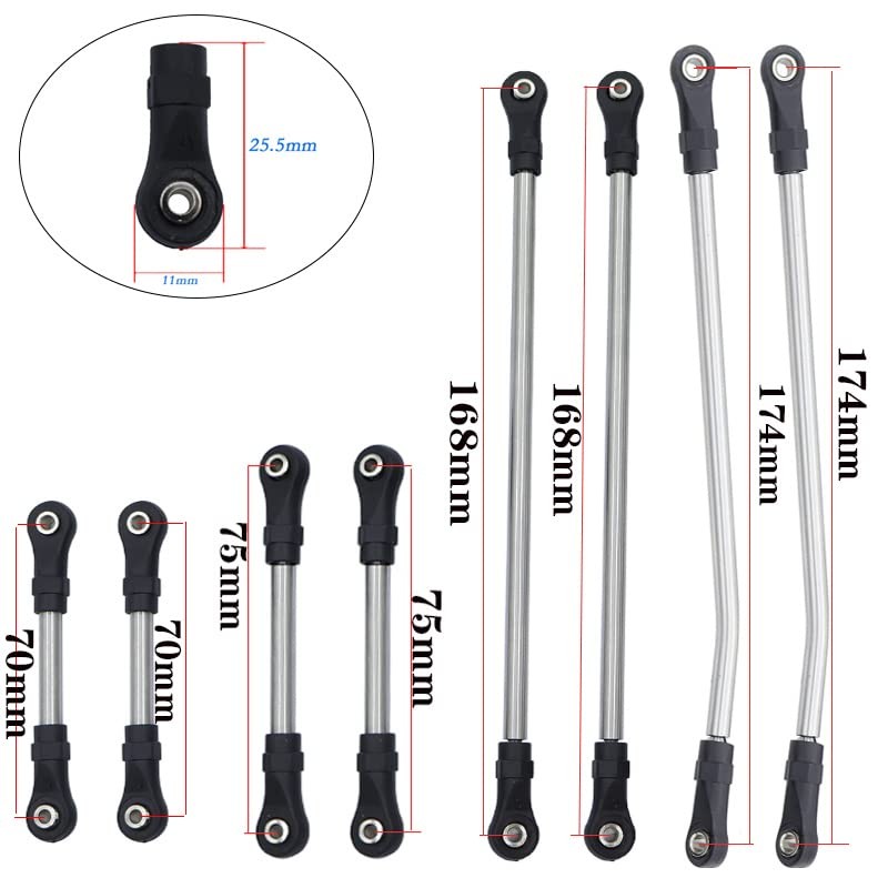 Product Description: Made of high quality stainless steel. Easy to install and durable. Unassembled Kit, easy to install. Suit for 1:10 Axial SCX10 III, Capra 1.9 UTB, SCX10 II, TRX4 Specifications: Link Rod Material: Stainless Steel Rod End Material: Plastic Net Weight: 152g(SCX10 III), 136g(Capra 1.9 UTB),139g(SCX10 II), 156g(TRX4) Package List: 1Set x Stainless Steel Linkage Unassembled Kit Notice:Pls allow 1-3mm error due to the manual measurement. Made of high quality stainless steel Easy to install and durable Unassembled Kit, easy to install Suit for 1:10 Axial SCX10 III, Capra 1.9 UTB, SCX10 II, TRX4