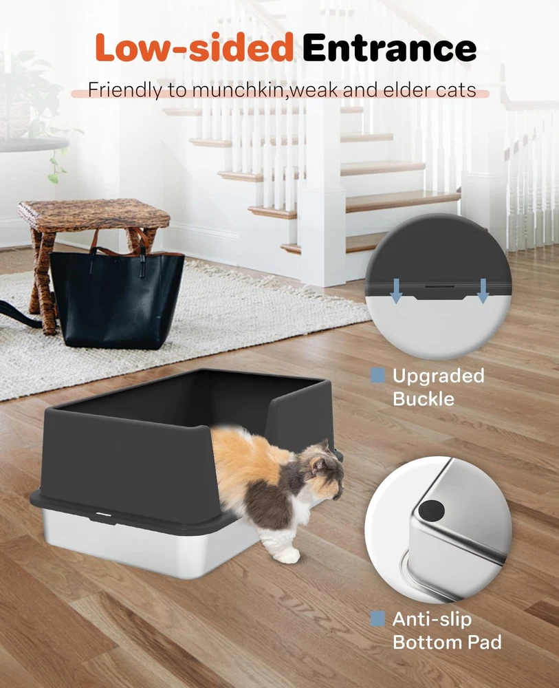 Premium Stainless Steel Cat Litter Box for a Cleaner, Odor-Free Home Say goodbye to messy cleanups with our high-sided stainless steel cat litter box. Its sleek, durable design prevents spills and splashes, making it perfect for cats who love to dig or aim high. The non-stick surface ensures litter won't cling, while the open and modern look blends seamlessly into any home decor. Built for easy cleaning and long-lasting use, it's the ideal choice for a fresher, stress-free environment for you and your feline companion. Large & Extra-Large Sizes for Every Need: Choose from two sizes of litter box—to find the perfect fit for your home. The extra-large cat litter box holds up to 36L of litter, making it ideal for big cats or multi-cat households. The large size, holding up to 24L, is great for medium breeds or single-cat homes. Both options minimize the need for constant litter refills, saving you time and effort Superior Leak-Proof Design: With 6.6-inch high walls, this metal litter box with enclosure effectively prevents urine or litter splashes, keeping your floors clean. The overlapping design between the steel litter pan and the lid forms a tight, leak-proof seal, ensuring no leaks occur through the seams. Say goodbye to messes and hello to a cleaner, more hygienic home Easy to Clean & Odor Control: Cleaning this cat box is a breeze. The smooth stainless steel surface ensures litter slides off effortlessly—nothing sticks. Just rinse with water for a spotless clean and wipe with a cloth for a residue-free surface. Plus, the material's odor control properties of stainless steel keep unpleasant smells at bay, leaving your home fresh and odor-free Durable Stainless Steel Construction: Crafted from high-quality stainless steel, this kitty litter box is built to last. Unlike some plastic covered litter boxes that scratch or crack easily, our stainless steel litter box is resistant to deformation, rust, and wear, ensuring long-lasting strength and durability. It’s the perfect choice for both you and your feline friend Open-top Design & Easy Access: Unlike enclosed cat litter boxes, we’ve chosen an open-top design to prevent odors from building up in a confined litter box. The low-entry side makes accessing the kitten litter box easier for elderly or short-legged cats. There are two buckles on the high sides which keep it tightly in place, so you won’t have to worry about your cat knocking it off while coming and going