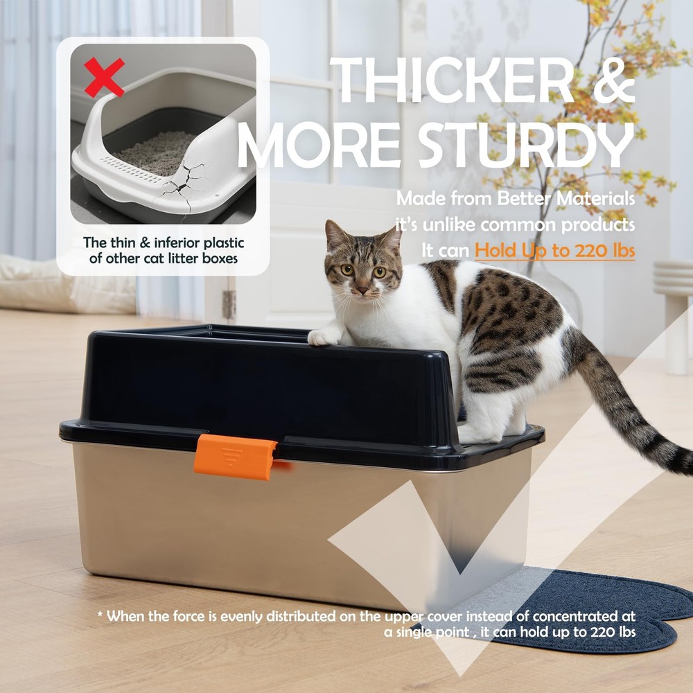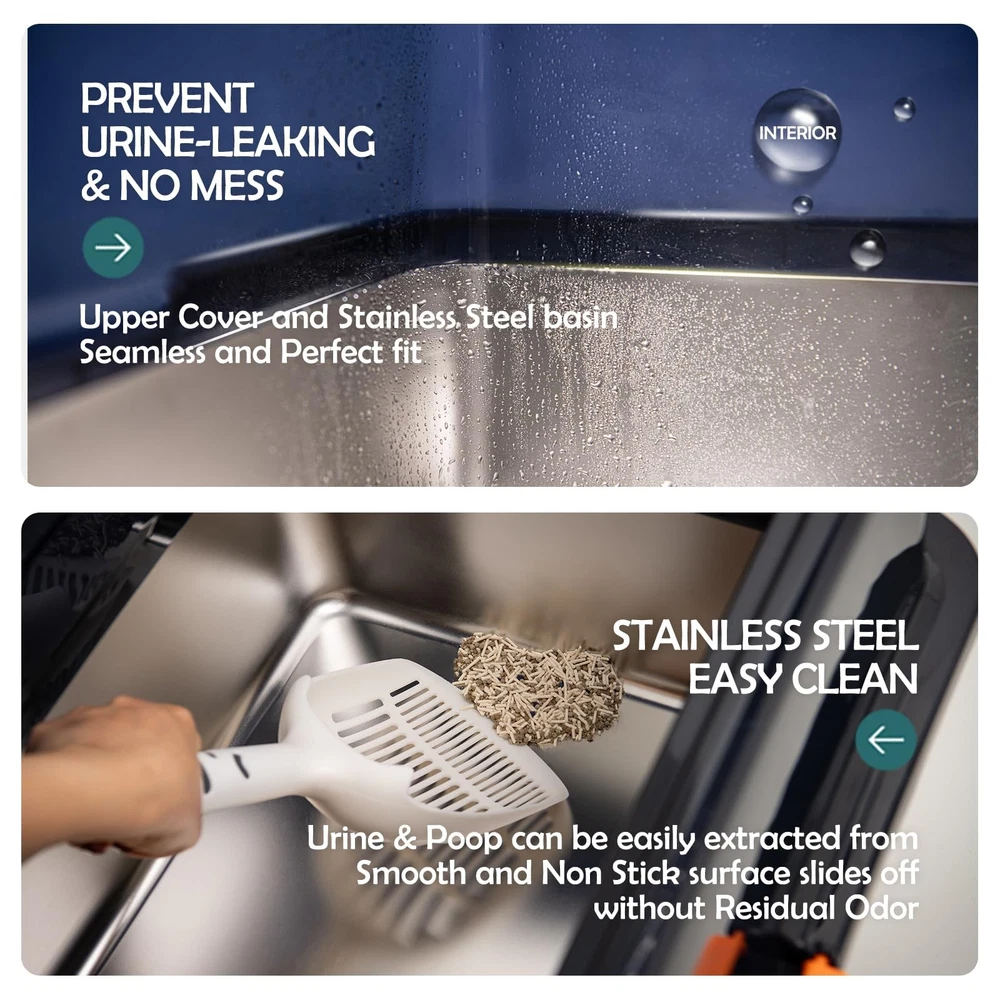 Pakage List : 1) Cat litter scoop 2) XXL Stainless steel cat litter box with lid 3)Cat litter box enclosure high side 【Extra Large Size Cat Litter box for Big Cats】XXL stainless steel cat litter box measures 23.6''x 15.7''x 11.8'', providing a comfortable space for cats of all breeds. The large litter pan of 20 liters capacity reduces the need for frequent cleaning and allowing you to leave home with peace of mind for up to 30 days. 【High-Sided Stainless Steel Cat Litter Box for High Peeing Cat 】 The metal cat litter box with high wall sides enclosure, with a 6'' plastic top cover overlapping the 6'' high jumbo cat litter box and special buckle design, keep the urine in the box instead of seeping through the seam, effectively preventing overflow and splashing. The high-sided covered cat litter box also provides more privacy space for cats. 【DIY Cat Litter Box Enclosure High Wall】 L18.9”×W18.9”×H20.3” inches (Hand measurement will have discrepancy of about 1/2" ), large DIY enclosure high side lead your cats to enter and exit from the passage and prevent cat litter from spilling on the floor, save litter and keep clean. You could DIY the splash guard shape and size according to the size of your cat litter box. 【Sturdy Stainless Steel Box】Made of ABS enclosed high wall enclosure and thick stainless steel, the enclosed stainless steel litter box is sturdy and resistant to rust and wear. 【Easy Cleaning and Doesn't Absorb Odor】It is easy to clean the stainless steel enclosed litter box of non-stick surface, leaving no lingering odors behind. Unlike plastic litter box, the stainless steel box does not absorb stains or odors.