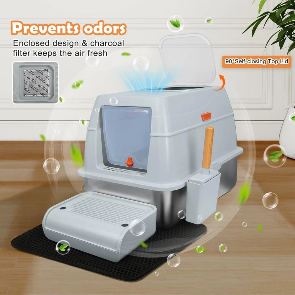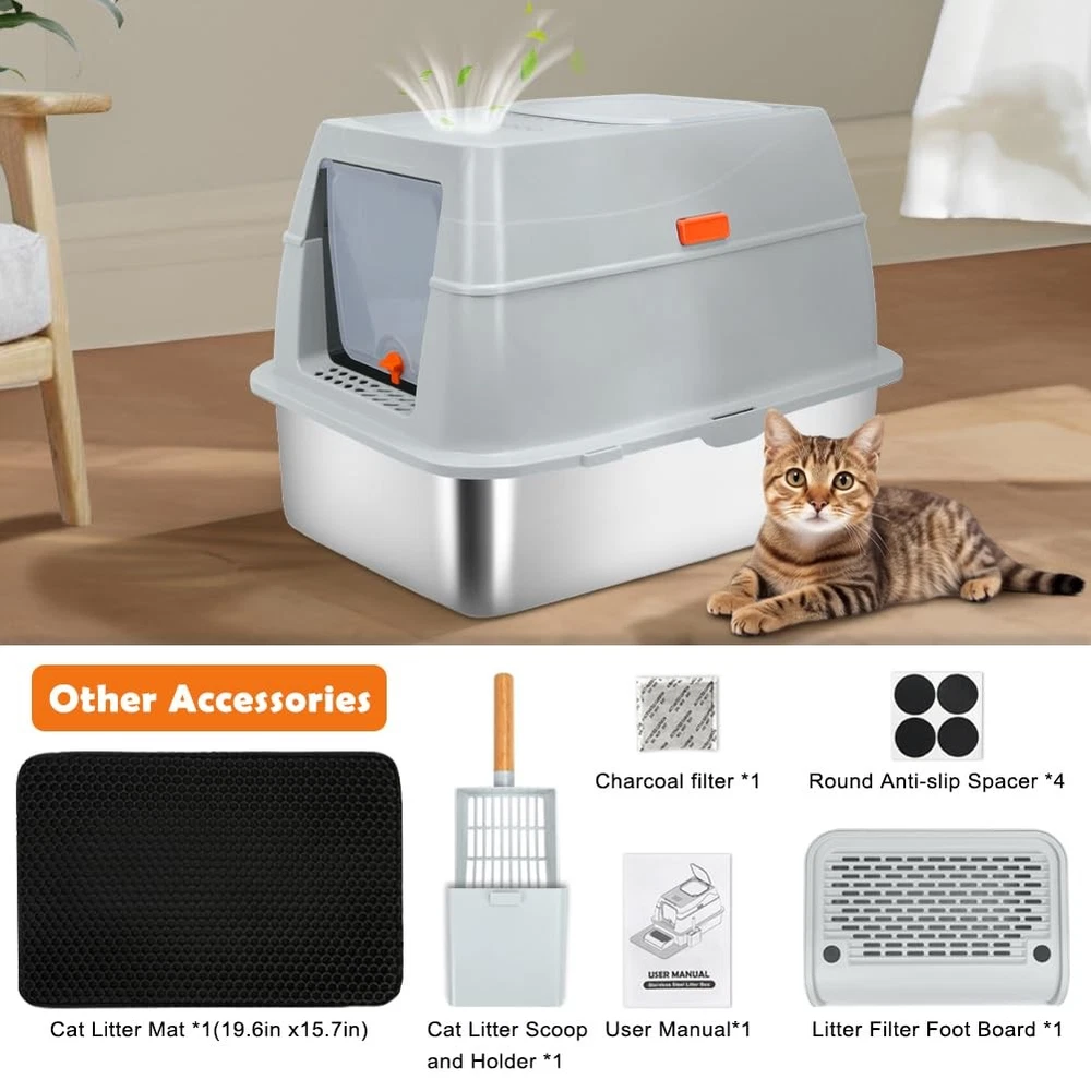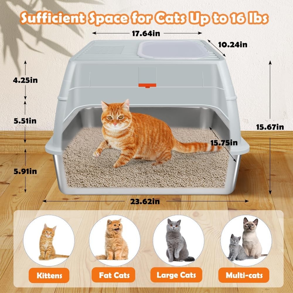 XL Top Entry Enclosed Stainless Steel Cat Litter Box with Lid, Footboard, Honeycomb Cat Litter Mat, Sturdy Scoop, and Charcoal Filter (Gray) Specification: Material: Stainless Steel, ABS Size: Extra Large Dimensions: 23.62"L x 15.75"W x 15.67"H Color: Gray Why Choose Our Stainless Steel Litter Box? 1.Unlike traditional plastic litter boxes, stainless steel resists scratches, odours, and stains, keeping your home fresher. 2.With a lifespan of 3-5 years, this high-quality cat litter box reduces the need for frequent replacements. 3.Everything you need in one package: XL stainless steel litter box - Rust-resistant, long-lasting, and easy to clean. Litter scoop - Makes daily waste removal effortless. Footboard - Helps small and senior cats step in with ease. Honeycomb mat - Double-layer design traps stray litter to keep floors clean. Slip-resistant pads - Ensure the litter box stays securely in place. User manual - Provides easy setup and care instructions. Charcoal filter - Control odors and keep your space fresh. Cat Owners' Essential Q&A: Q: Is this litter box suitable for large cats or multiple cats? A: Yes! The XL size accommodates cats up to 16 lbs and is spacious enough for multi-cat households. Q: How does the stainless steel material help with odors? A: Its non-porous surface resists absorbing odors, unlike plastic boxes, ensuring a fresher environment. Q: How to help my cat adapt to this new metal litter box? A: Start with the semi-closed mode and add a small amount of used litter. Most cats adjust within 1-3 days. Q: Is assembly complicated? A: No tools needed! The one-click mechanism and modular design allow setup in under 2 minutes. Q: Can senior cats use this box comfortably? A: Yes! The included footboard provides a step for easy access, ideal for seniors or kittens. SPACIOUS SPACE FOR CATS UP TO 16LBS - Measuring 23.62"L x 15.75"W x 15.67"H, this stainless steel litter box provides ample room for your cat. The 5.51-inch-high sided enclosure and 4.25-inch top minimize litter scatter. Please check the dimensions before purchasing to ensure a proper fit for your space TWO DIFFERENT USE MODES - Designed for two modes of use, the fully closed mode has a 90° self-closing top lid and comes with a charcoal bag box that holds odor-absorbing charcoal filter to control odors, and keep dogs out. Semi-closed model is easy to clean and helps cats adapt to a new enclosed litter box UNIQUE IN AND OUT DESIGN - This litter box offers one entry and two exit options to suit different cats. With the knob facing down, the front door is for entering only, and the exit is on top, preventing litter spills. When the knob is facing up, the front door is two-way and cats can also exit from the top for more freedom PREMIUM STAINLESS STEEL - Made from ABS material and thickened stainless steel, this cat litter box is rust-resistant, scratch-resistant. Unlike plastic alternatives, it minimizes odors and keeps your space fresh. The stainless steel litter pan has a weight capacity of 110 lbs and lasts 3-5 years, reducing the need for frequent replacements EASY-TO-CLEAN DESIGN - The smooth stainless steel surface makes it simple to rinse and wipe down. Its modular one-second disassembly allows you to lift the metal litter pan quickly for cleaning, without having to move other parts. Easy to take care of cleaning and create a clean and fresh toilet environment for your cat INCLUDES ESSENTIAL ACCESSORIES - The package contains an oversized stainless steel litter box, litter scoop, footboard, honeycomb mat, slip-resistant pads, charcoal filter, and instructions. The footboard helps kittens and seniors access the box, while the double-layer honeycomb mat traps stray litter, ensuring a clean floor