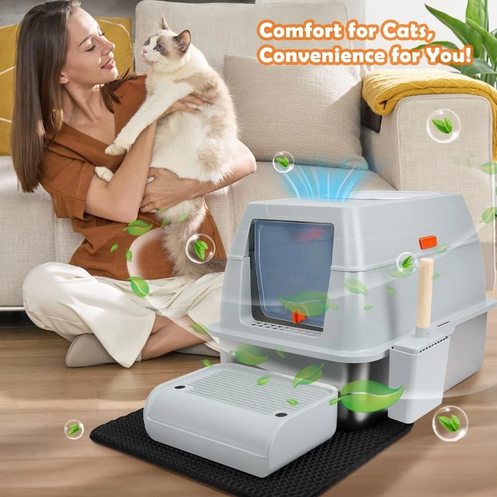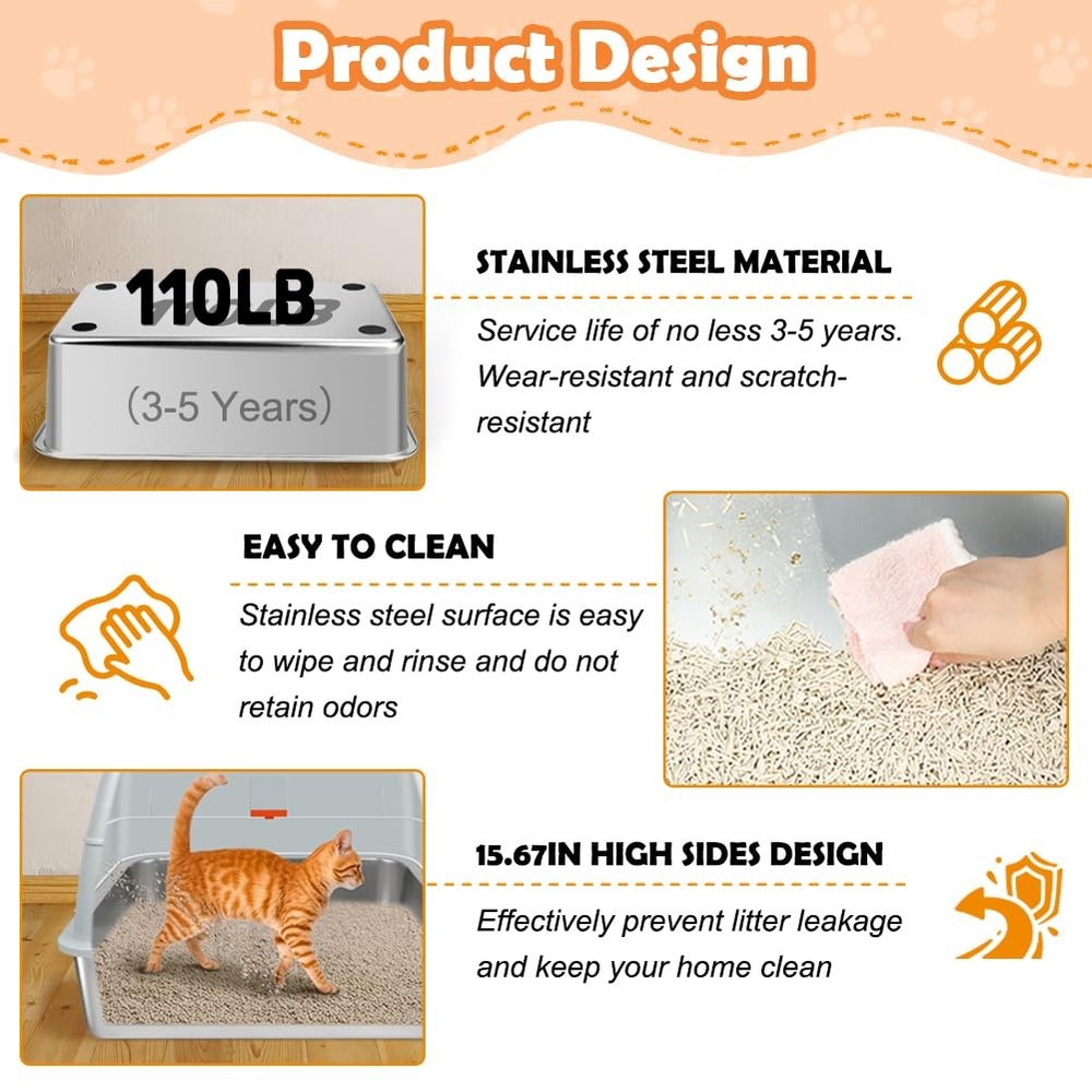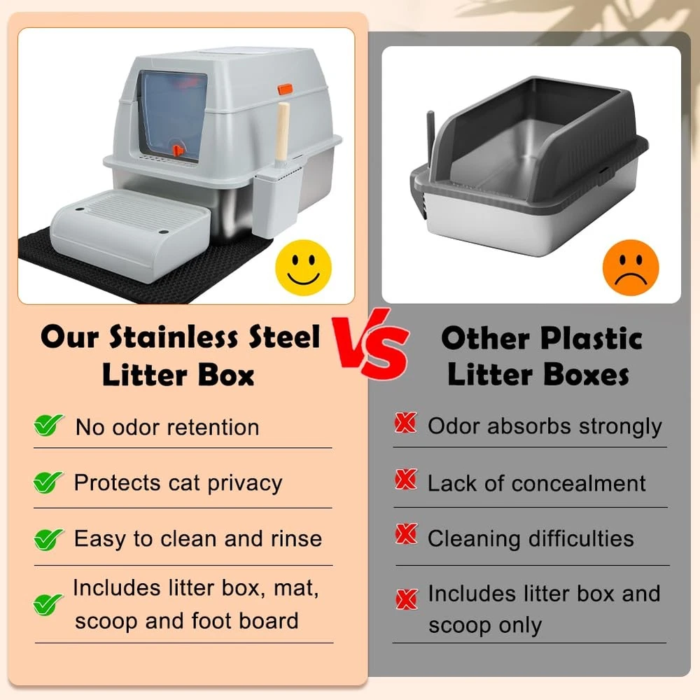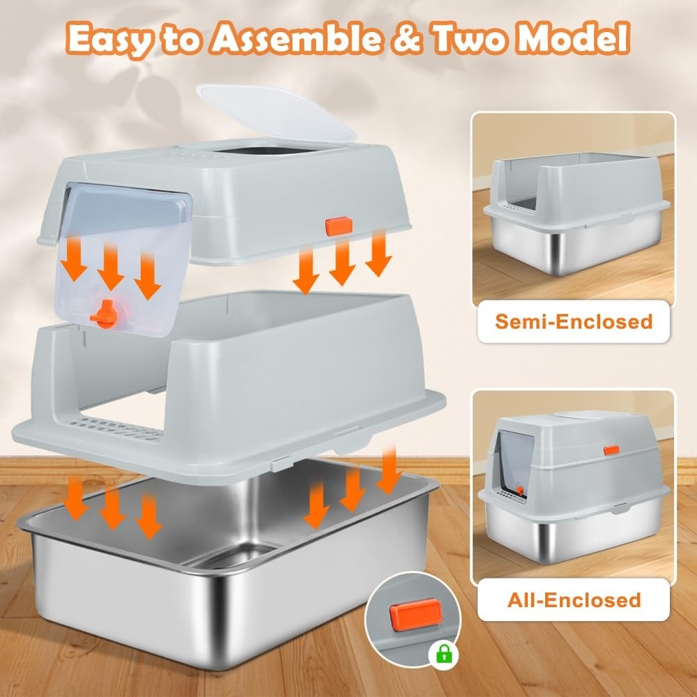 XL Top Entry Enclosed Stainless Steel Cat Litter Box with Lid, Footboard, Honeycomb Cat Litter Mat, Sturdy Scoop, and Charcoal Filter (Gray) Specification: Material: Stainless Steel, ABS Size: Extra Large Dimensions: 23.62"L x 15.75"W x 15.67"H Color: Gray Why Choose Our Stainless Steel Litter Box? 1.Unlike traditional plastic litter boxes, stainless steel resists scratches, odours, and stains, keeping your home fresher. 2.With a lifespan of 3-5 years, this high-quality cat litter box reduces the need for frequent replacements. 3.Everything you need in one package: XL stainless steel litter box - Rust-resistant, long-lasting, and easy to clean. Litter scoop - Makes daily waste removal effortless. Footboard - Helps small and senior cats step in with ease. Honeycomb mat - Double-layer design traps stray litter to keep floors clean. Slip-resistant pads - Ensure the litter box stays securely in place. User manual - Provides easy setup and care instructions. Charcoal filter - Control odors and keep your space fresh. Cat Owners' Essential Q&A: Q: Is this litter box suitable for large cats or multiple cats? A: Yes! The XL size accommodates cats up to 16 lbs and is spacious enough for multi-cat households. Q: How does the stainless steel material help with odors? A: Its non-porous surface resists absorbing odors, unlike plastic boxes, ensuring a fresher environment. Q: How to help my cat adapt to this new metal litter box? A: Start with the semi-closed mode and add a small amount of used litter. Most cats adjust within 1-3 days. Q: Is assembly complicated? A: No tools needed! The one-click mechanism and modular design allow setup in under 2 minutes. Q: Can senior cats use this box comfortably? A: Yes! The included footboard provides a step for easy access, ideal for seniors or kittens. SPACIOUS SPACE FOR CATS UP TO 16LBS - Measuring 23.62"L x 15.75"W x 15.67"H, this stainless steel litter box provides ample room for your cat. The 5.51-inch-high sided enclosure and 4.25-inch top minimize litter scatter. Please check the dimensions before purchasing to ensure a proper fit for your space TWO DIFFERENT USE MODES - Designed for two modes of use, the fully closed mode has a 90° self-closing top lid and comes with a charcoal bag box that holds odor-absorbing charcoal filter to control odors, and keep dogs out. Semi-closed model is easy to clean and helps cats adapt to a new enclosed litter box UNIQUE IN AND OUT DESIGN - This litter box offers one entry and two exit options to suit different cats. With the knob facing down, the front door is for entering only, and the exit is on top, preventing litter spills. When the knob is facing up, the front door is two-way and cats can also exit from the top for more freedom PREMIUM STAINLESS STEEL - Made from ABS material and thickened stainless steel, this cat litter box is rust-resistant, scratch-resistant. Unlike plastic alternatives, it minimizes odors and keeps your space fresh. The stainless steel litter pan has a weight capacity of 110 lbs and lasts 3-5 years, reducing the need for frequent replacements EASY-TO-CLEAN DESIGN - The smooth stainless steel surface makes it simple to rinse and wipe down. Its modular one-second disassembly allows you to lift the metal litter pan quickly for cleaning, without having to move other parts. Easy to take care of cleaning and create a clean and fresh toilet environment for your cat INCLUDES ESSENTIAL ACCESSORIES - The package contains an oversized stainless steel litter box, litter scoop, footboard, honeycomb mat, slip-resistant pads, charcoal filter, and instructions. The footboard helps kittens and seniors access the box, while the double-layer honeycomb mat traps stray litter, ensuring a clean floor