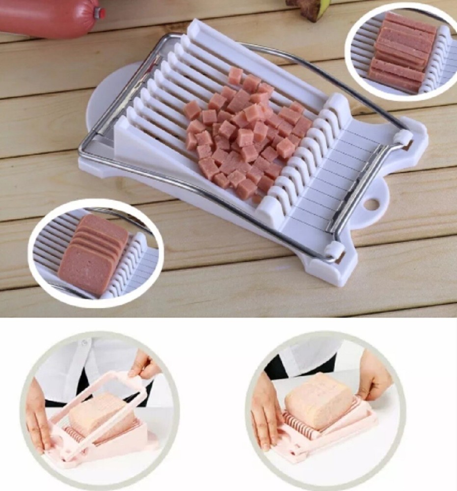 šš„ Stainless Steel Luncheon Meat Slicer - Easy Kitchen Cutter This slicer gets you even slices of luncheon meat, ham, cheese, bananas, or hardboiled eggs in seconds! š„Ŗš Specs : About 8.74ā long, 5ā wide, with stainless steel wires spaced 0.3ā apart. Lightweight (7.05 oz). Material : Food-grade PP/ABS plastic (base) + sharp stainless steel wires (durable & safe). ⨠How to Use : Put food (like luncheon meat) on the base, press the wire frame down. Done! š Uses : Works efficiently on luncheon meat, cold cuts, ham, soft cheeses (like brie), bananas, and hardboiled eggs. Perfect for creating neatly sliced ingredients for snacks, meals, or party platters.šāļø