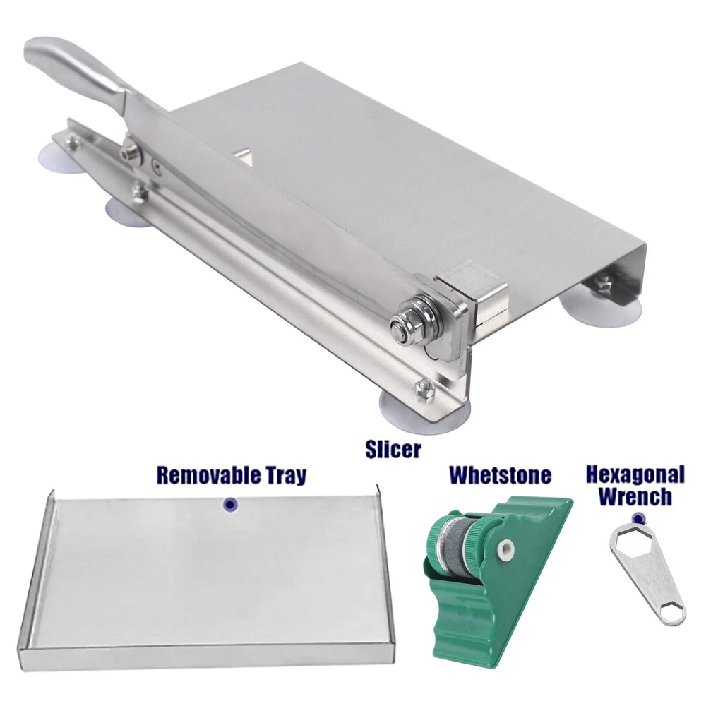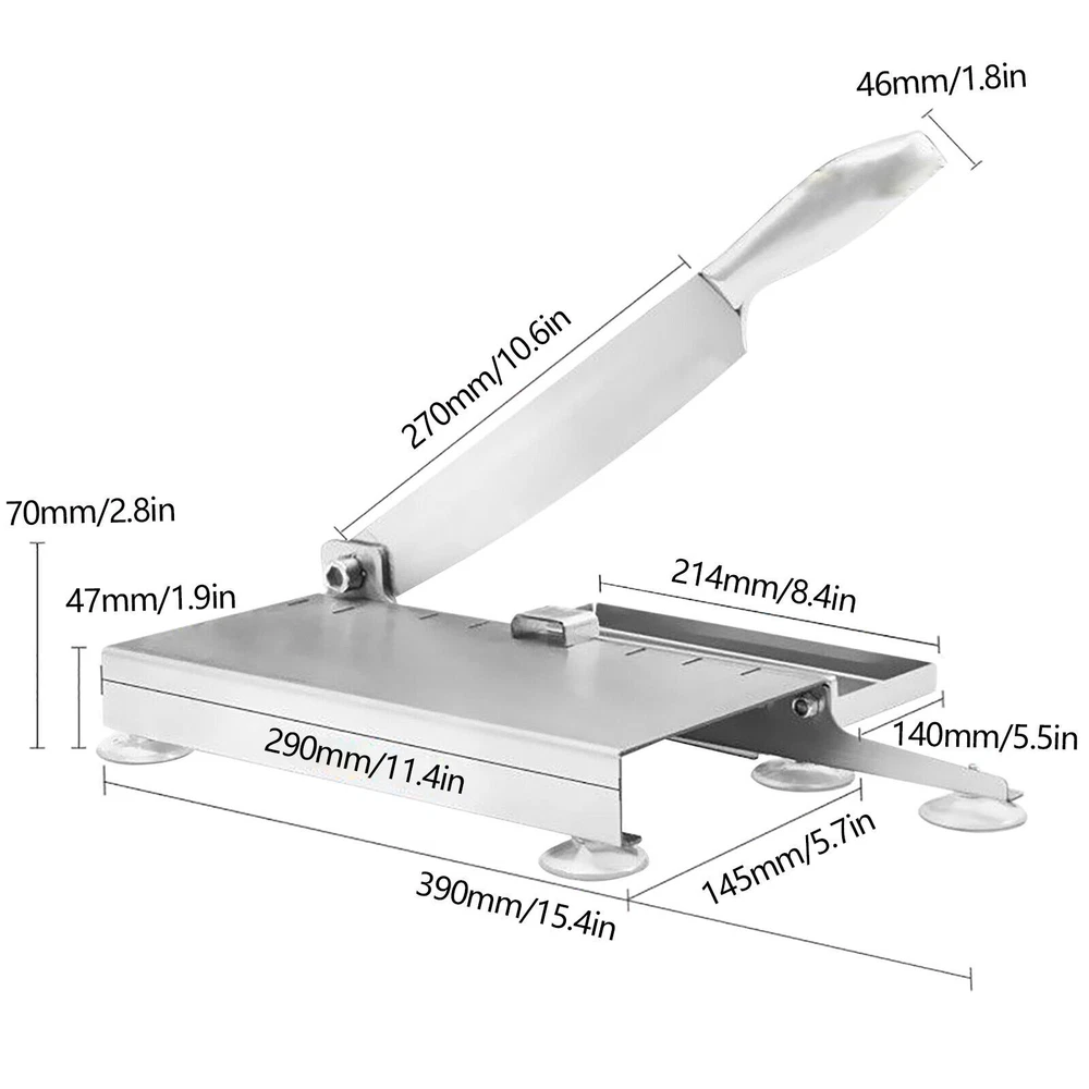 This manual meat slicer is a game-changer for home butchers! The sharp stainless steel blade cuts through ribs, jerky, and frozen meat like butter. Perfect for portioning chicken, fish, or even cheese with precision. The sturdy build feels durable, and the long blade makes quick work of small bones and cartilage. Just remember—it's not for massive leg bones, but for everyday meat prep, it's fantastic! Easy to clean and surprisingly efficient for a manual tool.