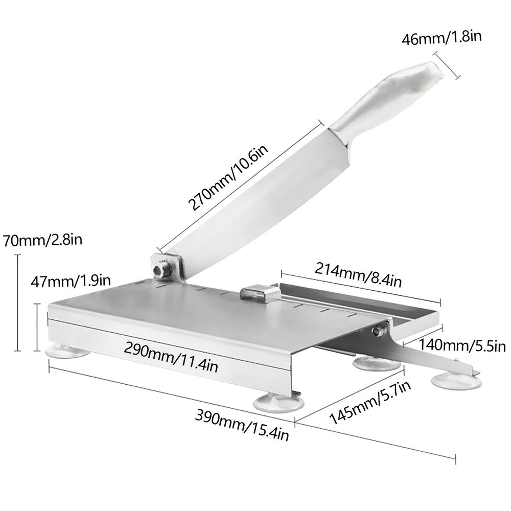 Manual Meat Slicer Bone Cutter Stainless Steel Beef Bone Cutting Machine Manual Frozen Meat Slicer Stainless Steel Small Ribs Cutter Cutting Machine Description : Fit for: Small Ribs, Cartilage, Jerky, , Beef and Mutton Rolls,Chicken, Fish, Vegetable, Cheese, Etc. Not Fit for: Big and Hard Bones like Cow and Sheep, Trotters, Cattles, Large Leg Bones of Pigs Stainless Steel Material--the Blade Is Forged from 430 Stainless Steel at Multiple High Temperatures, Which Is More Sturdy and Durable. the 270mm Long Blade Allows You to Easily Cope with the Needs of Daily Cutting of Chicken Legs and Ribs. the Body Is Made of 202 Stainless Steel Forged with Rounded Corners, Which Makes It Safer and More Stable When Used. You Can Clean the Entire Slicer with Water, but Please Pay Attention to Maintenance. Non-slip Suction Cups & Snaps --the 5 Suction Cups on the Base Allow the Machine to Be Firmly Adsorbed on the Flat Operating Table, Bringing Stability to Your Slicing Work. the Addition of Adjustable Anti-slip Snaps Prevents the Food from Slipping During Cutting, Making the Slicing Work Smoother. Collection Tray --Each Package Comes with a Tray, Which Can Be Used to Accept the Cut Food, so That the Food Is Kept Hygienic and Will Not Contaminate the Tabletop. the Removable Design Makes It Easy to Clean and Store. Application --If You Have Trouble Cutting Chicken Legs, Ribs, Frozen Meat and some Bone-bearing Ingredients, Then This Machine Is Definitely the Choice for You to Solve These Troubles. You Can Add One in Your Kitchen, It Is Definitely a Good Kitchen Helper; You Can Also Add One in Your Restaurant, It Will save You a Lot of Time to Cut Ingredients, While Absolutely Saving Effort. Parameters: Net Weight: 2.1kg Dimension: 390*145*70mm Blade Length: 270mm/10.6in. Effective Cutting Length: 243mm/9.6in. Base Height: 47mm Payment Delivery details Terms of sales About us Contact us Payment We accept ebay payment 。 Fees such as import duties, taxes are not included in the item price or shipping costs. These charges are the buyer's responsibility. Delivery details Shipping: 2-9 working days to: USA Terms of sales We maintain high standards of excellence and strive for hundred percent customer satisfaction. Feedback is very important to us. We hope that you contact us immediately before you give neutral or negative feedback, so that we can address your concerns. It is impossible to address issues if we do not know about them! About us Your satis faction is our ultimate goal. We work hard to earn your trust and future business. Our certified technicians have tested each item before shipping. The unit comes with 1 year limited warranty on all manufacturing defects. a) If you receive a defective item, you may return it or ask for a discount. Please contact us within 14 days after you receive the package. b) What you returned must be intact and in its original packaging as re? u. Customer is responsible for shipping costs of the returned item. c) We will cover the cost of shipping back t with the shipping rate indicated in the registration page. We will send you a new unit or refund the full payment you paid. Thank you. Contact us Business Hour Business Hour: Monday To Friday: 8:30 AM to 5:00 PM (Beijing China time) Due to time zones, our reply to your questions may not be immediately. But within above working time, we will reply your email within 24 hours. If it's non-workdays, please kindly be patient and wait till Monday. Please contact us with ebay message. Please feel free to contact us if you have any questions. Monday To Friday: 8:30 AM to 5:00 PM (Beijing China time) Due to time zones, our reply to your questions may not be immediately. But within above working time, we will reply your email within 24 hours. If it's non-workdays, please kindly be patient and wait till Monday. Please contact us with ebay message. Please feel free to contact us if you have any questions.