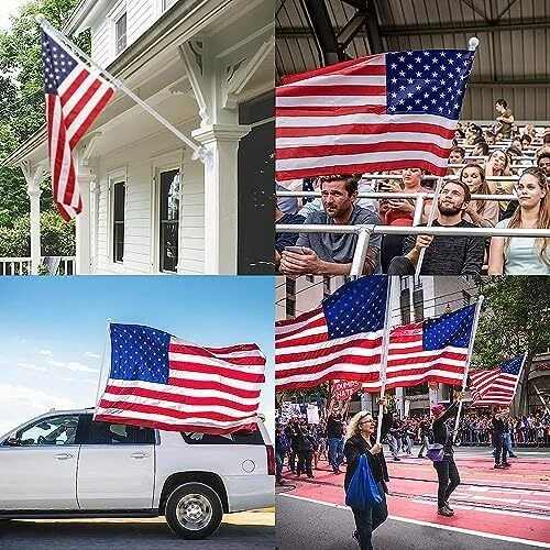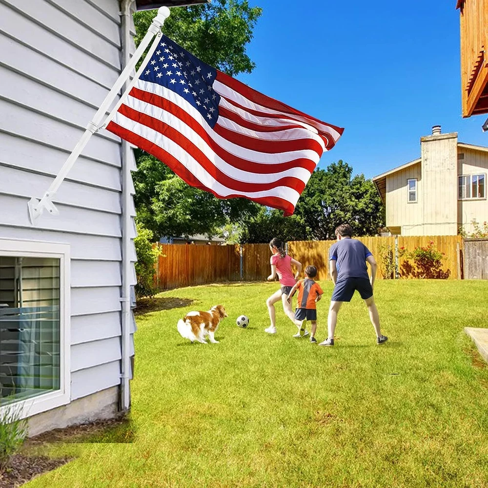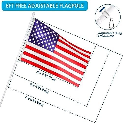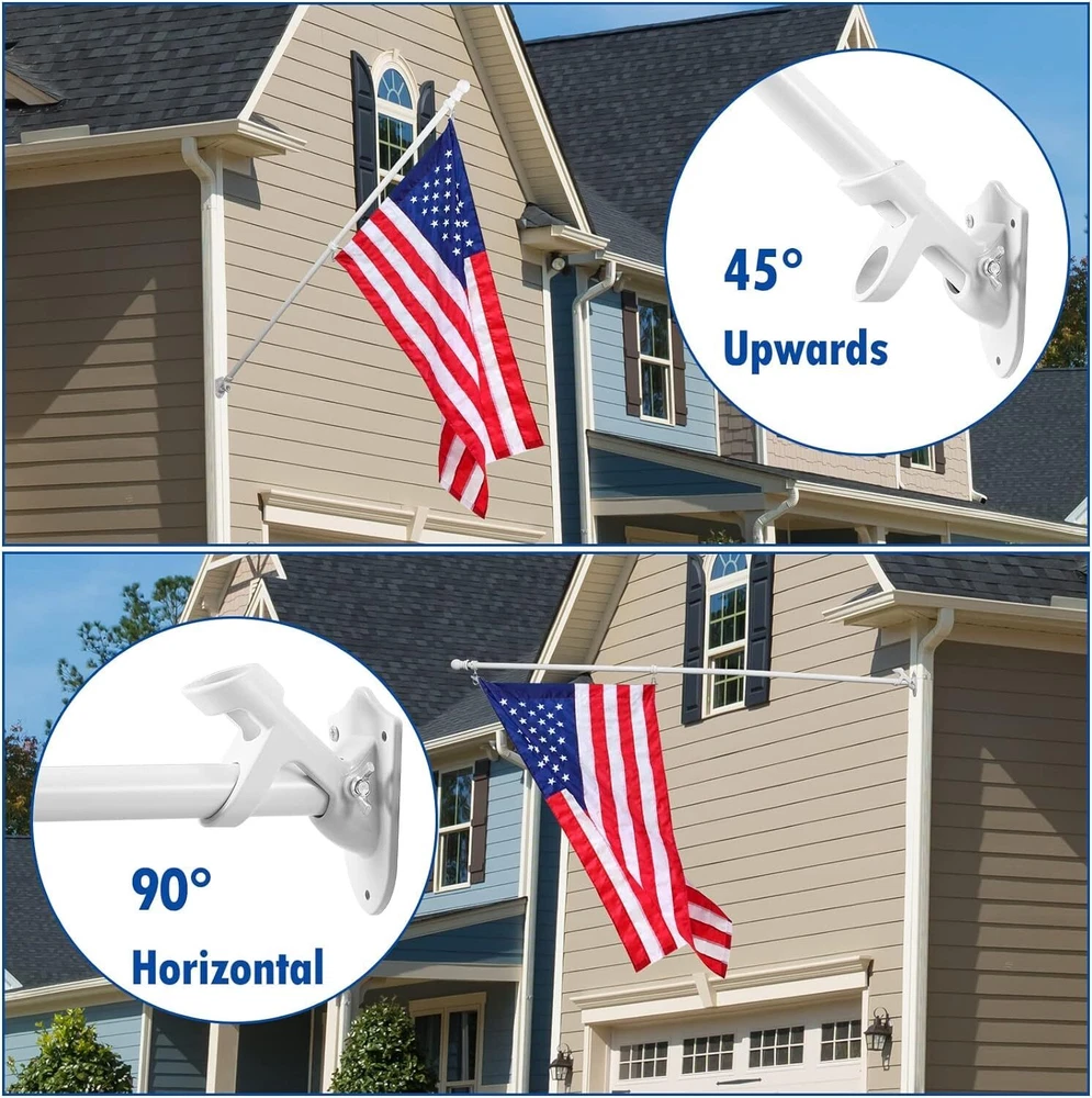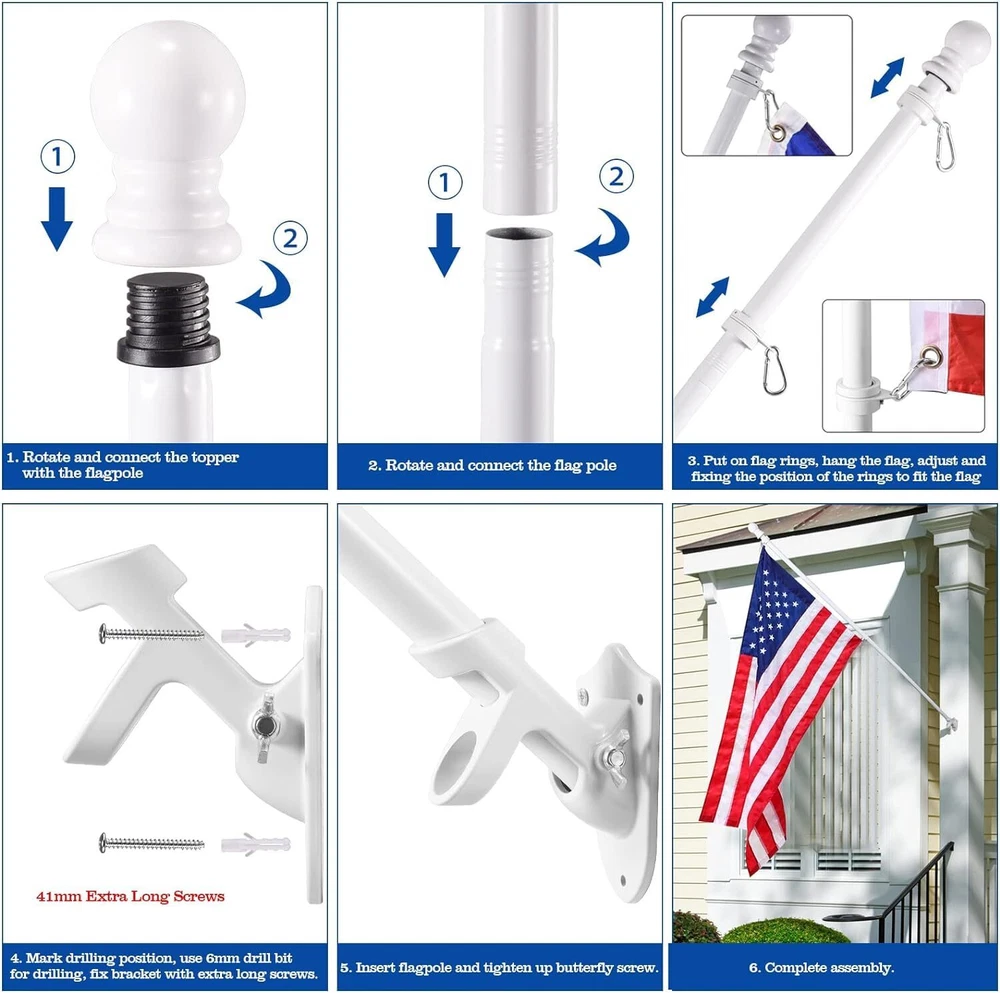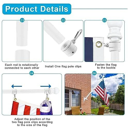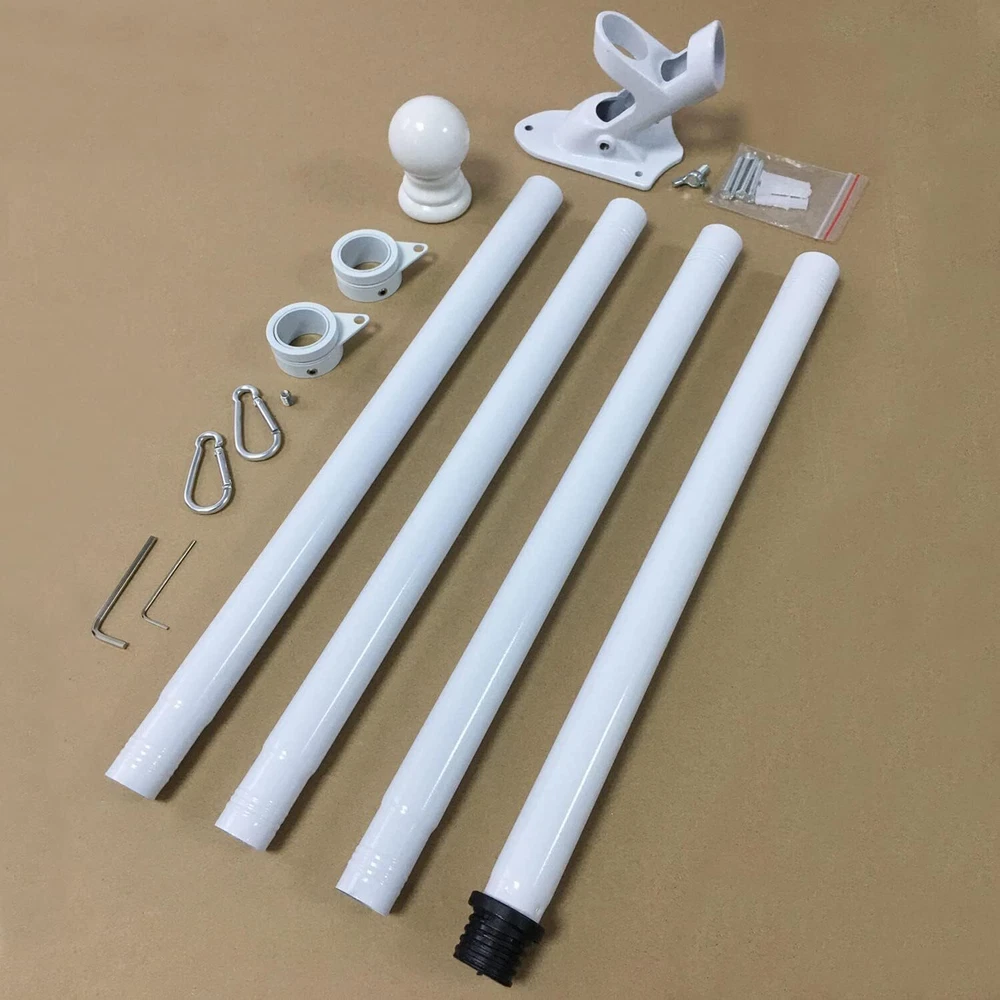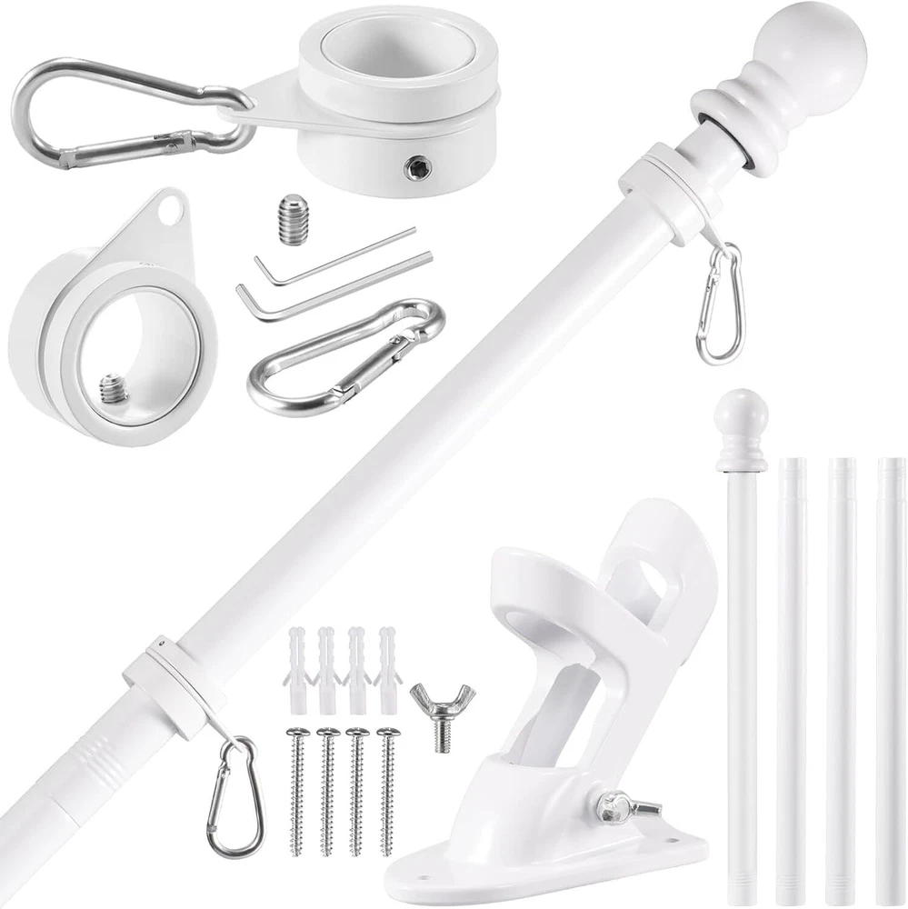 Proudly display the American flag with this White Flag Pole Kit for Outside House. The 6FT thickened stainless steel outside wall mount flagpole is designed to securely hold 3x5' or 4x6' American flags (approximately 91cm x 152cm or 122cm x 183cm). The tangle-free 360° rotating hardware ensures your flag flies freely without wrapping around the pole. This outdoor flagpole kit is perfect for mounting on your porch, truck, boat, or any exterior wall. Constructed with durable materials, it's built to withstand the elements and provide years of reliable service. Elevate your patriotic spirit and showcase your national pride with this high-quality flagpole kit. 【6FT WHITE FLAGPOLE KIT INCLUDES】5 sections of white metal flagpole, 1 x white top ball, 2 x white flagpole rings, 2 x silver aluminum grommets, 2 x silver hex wrenches, 1 x silver spare built-in screw, 1 x 1" white aluminum flagpole bracket, 4 x steel screws and 4 x anchor bolts and 1 x butterfly screw; 【SUITABLE FOR 3'X5' OR 4'X6' FLAGS】Made of thickened stainless steel, the flagpole wall is thickened by 0.45mm, more durable, won't bend, break or twist. Comes with 5 sections of splice pole with threaded connectors, easy to assemble and disassemble the flagpole by just turning and twisting. The length can be adjusted between 1.3 feet and 6 feet (2 feet/3 feet/4 feet/5 feet/6 feet) to meet your various requirements. 【360° ANTI-TRANGLING】Using improved high strength steel swivel ring, it rotates super smooth, more durable, does not rust, and is not easy to bend or break, which effectively reduces tangling problems and withstands harsh weather elements! The inner diameter of the ring is 1.02 inches, adjustable size by built-in screws and Allen wrenches. Comes with 2 pieces aluminum alloy mountaineering carabiners, the perfect connector for flagpoles and flags with grommets! 【2 POSITION WHITE FLAGPOLE HOLDER】2 Position 1 inch flagpole holder allows the flag to be displayed at 45 or 90 degrees. Die-cast from thickened high quality aluminum material, precision polishing process, with waterproof and rustproof coating protection, stable and durable, long lasting Equipped with 4 high hardness steel extension screws and 4 anchor bolts and 1 butterfly screw, very sturdy hardware kit for safe use outdoors! 【EASY TO ASSEMBLE AND USE】5-stage design makes installation and disassembly easier, just connect the pole and put the flagpole into the bracket to install. Easily stored in our box when not in use. Provides superior strength and longevity with an easy-to-assemble kit. Suitable for a wide range of options for residential and commercial properties, it can be installed in your yard, garden, house or even truck or boat.