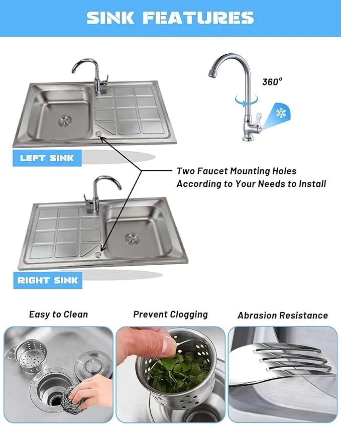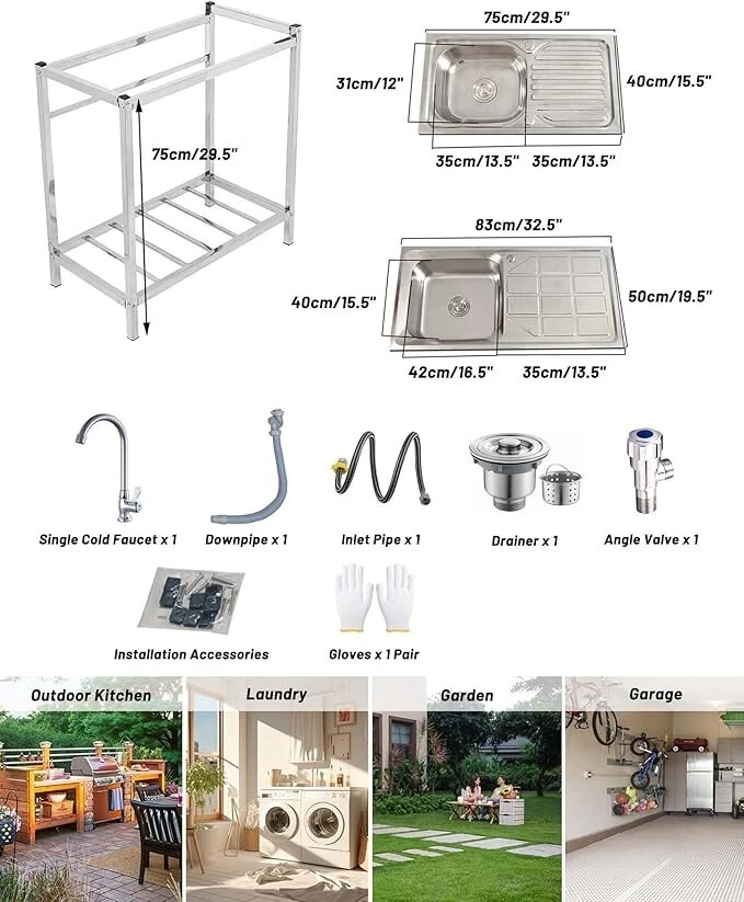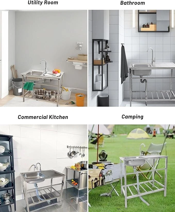 Package Included: Single Cold Faucet x 1, Downpipe x 1, Inlet Pipe x 1, Drainer x 1, Angle Valve x 1, Gloves x 1 Pair, Installation Accessories. Freestanding Stainless Steel Sink: Wear-resistant stainless steel material, scratch-resistant, not easy to rust or deform, suitable for dealing with a variety of kitchen tasks in daily useSmooth surface, easy to clean. Thoughtful Design: The utility sink comes with a worktop and bottom storage shelf, the worktop provides extra space for preparing food or drying dishes, while the bottom storage table provides storage space to keep your kitchen neat and organized. Stable Structure: when installing a sink, consider the flatness of the floor and the sturdiness of the mounting points. Often choose to fix it against a wall to increase overall stability. Rubber feet will not damage the floor. Wide Application: Utility washing hand sink is suitable for various scenarios such as home, restaurant, hotel, cafe and so on. Besides being placed in indoor and outdoor kitchens at home and so on, it can also be used in the backyard, garage, garden and so on, providing convenience for your life.