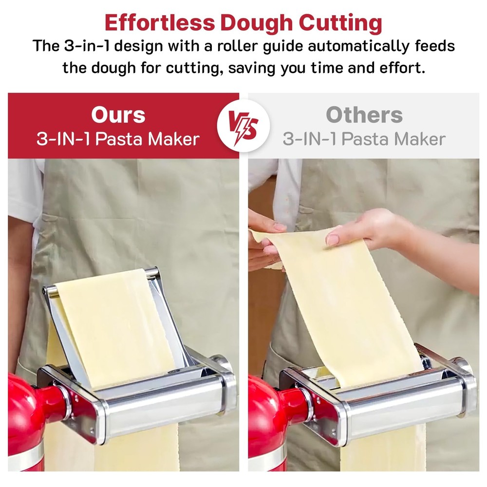 All Stainless Steel Build – Durable and Safe: Crafted entirely from stainless steel, this pasta maker attachment for KitchenAid stand mixers is built to last. It resists deformation and rust, even with frequent use. With direct food contact on a clean, odor-free metal surface, it ensures safe and hygienic pasta-making for your family—perfect for those who value quality kitchen tools Automatic Roller Guide – Effortless Rolling and Cutting: The innovative roller guide design automatically directs the pasta sheet into the cutter after rolling, eliminating the need for manual alignment. This smart design simplifies the process, increases safety, and improves efficiency—ideal for beginners and families looking for an easy start 3-in-1 Design – Multiple Pasta Types with One Installation: Combining a pasta roller, spaghetti cutter, and fettuccine cutter into one compact attachment, it allows you to make multiple pasta styles without switching tools. Install once and easily create spaghetti, fettuccine, and lasagna sheets—saving time and boosting kitchen productivity 8 Thickness Settings – Versatility for Every Recipe: Easily adjust the pasta sheet thickness from ultra-thin to thick using the control knob. Whether you're making dumpling wrappers, wonton skins, lasagna, or tacos, the 8 settings give you the flexibility to handle a wide variety of homemade dishes Reliable Kitchen Helper – Easy to Install and Clean: Quickly connects to the power hub. Smooth operation with no jamming, and easy to clean—simply wipe with a dry brush or damp cloth. A time-saving tool to keep your kitchen clean and your cooking efficient