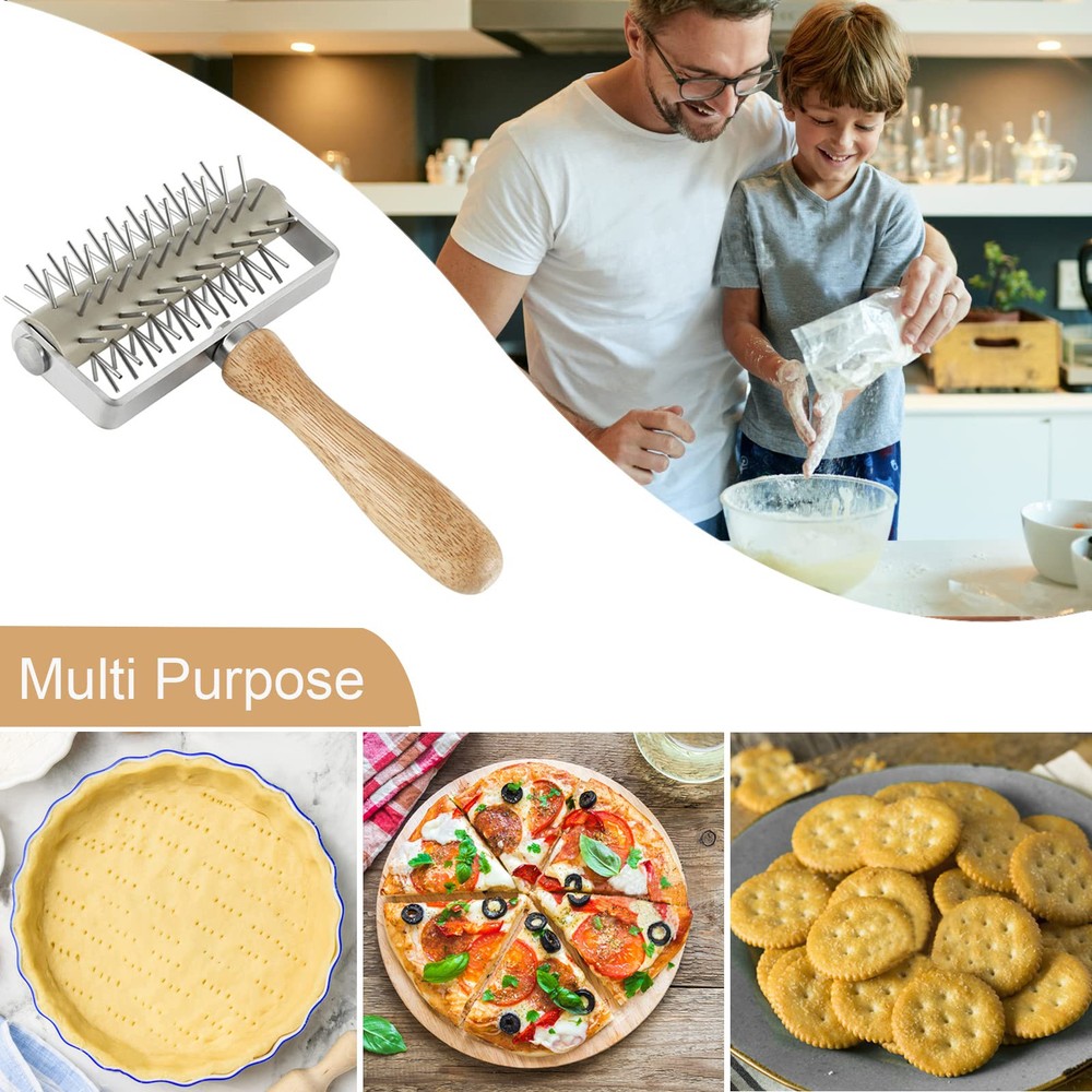 Premium Material: Our dough docker roller with a solid wood handle. Pins are made of Food stainless steel material. Sturdy and durable dough docker will last longer Wide Application: Our dough hole maker is suitable for making pizza crust, pastry, pie crusts, biscuit and etc. Roller docker helps avoiding the air pockets formation on dough Time-saver Pizza Docker: Dough docking tool save your time and effort by speeding up the process of dough holes. You can easily make a delicious baking food Dimension: Overall length 8.1 inches and 5.3 inches wide plastic roller. Pin length: 5/8 inch. Our pizza dough docker have 10 gears with 10 or 11 pins on each gear for easy punching Great Pizza Making Gift: Bakers and cooking enthusiasts will love this clever spike roller in their process of making pizza. It is attractive and practical present for your parents, neighbors, Thanksgiving, Christmas, housewarmings, birthdays, mother's day, father's day or other special days
