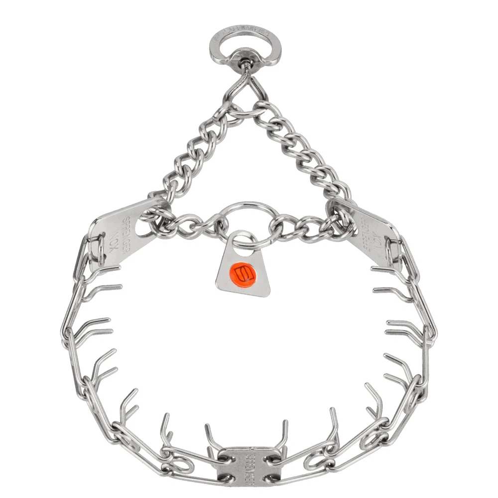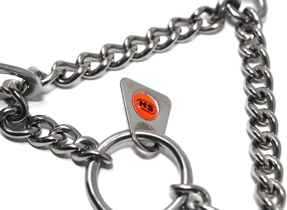 The Stainless Steel Training collar is one of the most recognizable and popular names in obedience training tools. A safe and effective alternative to choker collars, it puts even pressure around the neck, about every half inch, pinching the skin in a band. This collar does not apply direct pressure to the trachea, so you can train your dog with little or no tugging, jerking, or pulling. The addition of a center plate connector allows the middle link to be configured symmetrically, enabling the links to tighten in the same direction. Made of high quality German stainless steel, the size of this collar can be adjusted by adding or removing the links individually. Features: interlocking links, each link equipped with two blunt links slips over dog's head for easy on, easy off slightly beveled tips easy to increase or decrease in size Made of high quality stainless steel Additional links sold separately. Sizing instructions: collar should fit snuggly just below the dog's ears, measure the circumference of dog's neck and add 2". Stainless Steel Collar. This model come with Swivel for leash attachment: Size Medium 3.2mm x 23 inches long (overall collar length)