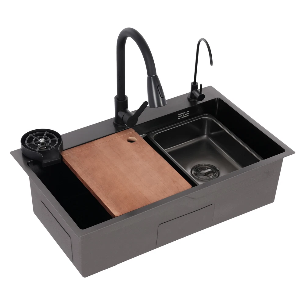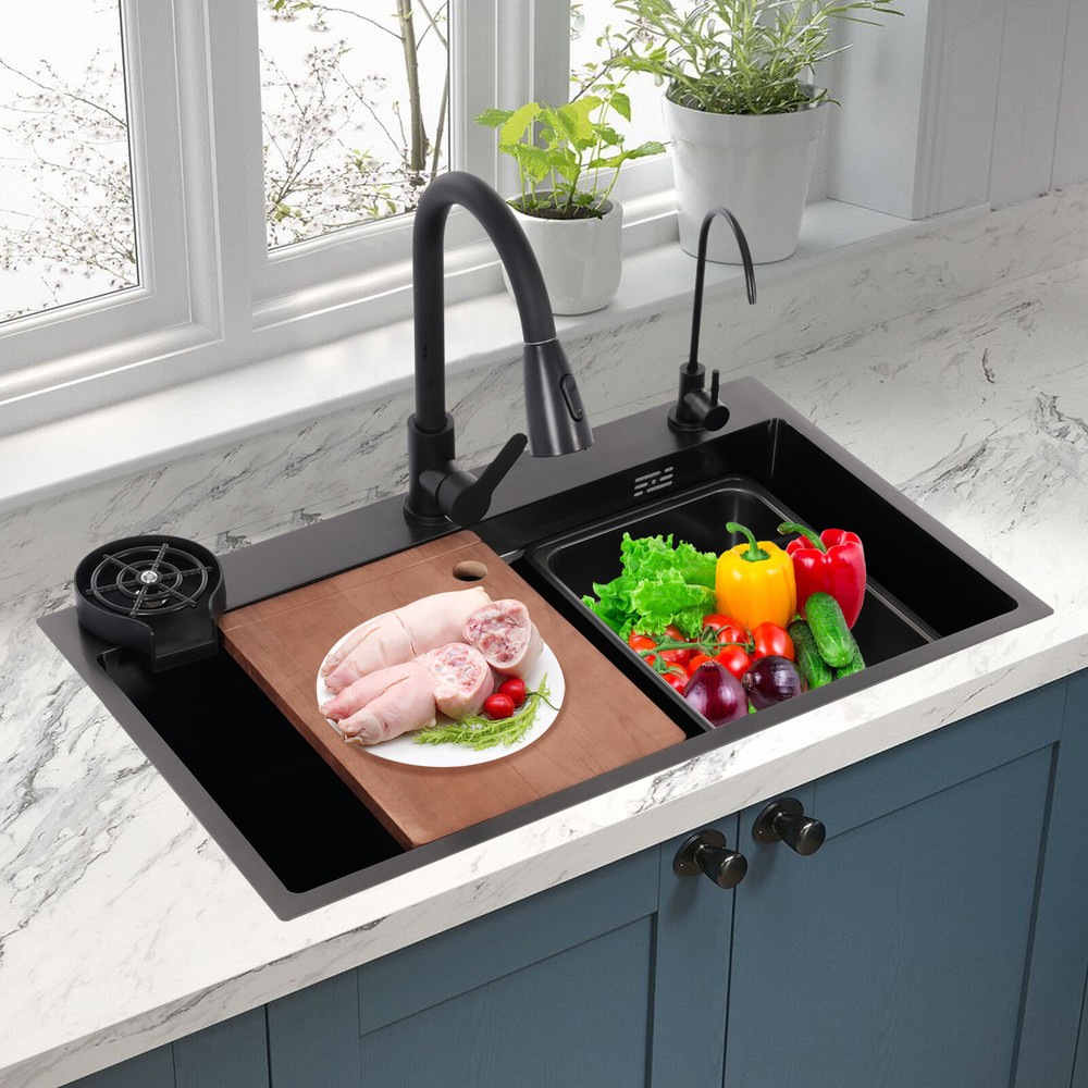 Rectangular Kitchen Sink Stainless Steel Multifunction Sink w/ Pull-out Faucet Description Revitalize the kitchen, starting from the sink! Our multi-functional sink integrates the pull-out faucet, cup rinser, water purified faucet, and more to help you improve your quality of kitchen life. 304 stainless steel has been treated with exquisite craftsmanship for excellent durability and modern appearance. Choose it and embark on a new chapter of convenient and efficient kitchen work! Key Features Build to Last: It is mainly made of 304 stainless steel after nano-coating, which is corrosion-resistant, scratch-resistant, and easy to clean, ensuring good appearance and performance even after long-term use. Efficient Kitchen: Pull-out faucet, water purified faucet, cup rinser, basin in basin, cutting board, and efficient drainer allow kitchen work to be centralized in one place, changing the frequent change of position work mode and making your kitchen work more efficient. Large Size: Spacious sink space is suitable for cleaning a large number of dishes(not included). It is a great helper for your cleaning or washing work. Quick Drainage: The U-shaped guide line and micro slope structure inside the sink can help with fast drainage. The gourd-shaped drainer can effectively intercept larger debris, prevent blockages, and form a water seal layer to prevent odors from rising, ensuring a fresh kitchen environment. Customized Use: The protruding frame design on the sink's interior wall holds the basin in basin and the cutting board stably to meet your usage needs. The pull-out faucet has three water output modes: water column, spraying, and sweeping, allowing you to enjoy a customized washing experience. Thoughtful Design: The product adopts silent pads and anti-condensation layers to reduce noise, prevent cabinet moisture, and create a quieter and more hygienic kitchen environment. Easy to Clean: The product has been treated with nano-coating, making it less likely to leave marks or stains. You can use a mild cleaner and soft sponge to wipe the sink to ensure its lifecycle. Buy with Confidence: We stand behind all our guests and look forward to assisting you with your purchase. It is our pleasure to answer your confusion and questions. The end of the story between us is not "we sell and you buy". Details Anti-overflow Holes: They can prevent the sink from overflowing and keep the kitchen floor dry. Water Storage Lid: It allows you to quickly store water and complete tasks such as soaking. Application This product can be widely used in homes, kitchens, restaurants, cafes, bars, hotels, homestays, milk tea shops, dessert shops, and other places. Specification Color: Black Style: Modern Shape: Rectangular Material: 304 Stainless Steel Cutting Board Material: Solid Wood Process: Nano Coating Mounting Type: Drop-In/Topmount/Undermount Assembly Required: Yes Valve Core Type: Ceramic Faucet Water Output Mode: Water Column, Spraying, Sweeping Faucet Pull-out Length: 30cm/11.81in Sink Size: 75*45*22cm/29.53*17.72*8.66in Package Size: 81*51*28cm/31.89*20.08*11.02in Gross Weight: 12kg/26.46lbs Net Weight: 11kg/24.25lbs Package Included 1 * Sink 1 * Pull-out Faucet 1 * Water Purified Faucet 1 * Cutting Board 1 * Drainer 1 * Basin in Basin 3 * Inlet Pipes Other Accessories for Assembly Notes Please carefully check the size of the product before purchasing. Please note that this product does not include the water pipe for the water purified faucet. You will need to bring your water pipe to connect it to your water purifier. Please allow the slight color difference caused by the shooting light and 1-3cm error due to manual measurement, and make sure you do not mind before ordering. Payment Delivery details Terms of sales About us Contact us Payment We accept ebay payment 。 Fees such as import duties, taxes are not included in the item price or shipping costs. These charges are the buyer's responsibility. Delivery details Shipping: 2-9 working days to: USA Terms of sales We maintain high standards of excellence and strive for hundred percent customer satisfaction. Feedback is very important to us. We hope that you contact us immediately before you give neutral or negative feedback, so that we can address your concerns. It is impossible to address issues if we do not know about them! About us Your satis faction is our ultimate goal. We work hard to earn your trust and future business. Our certified technicians have tested each item before shipping. The unit comes with 1 year limited warranty on all manufacturing defects. a) If you receive a defective item, you may return it or ask for a discount. Please contact us within 14 days after you receive the package. b) What you returned must be intact and in its original packaging as re? u. Customer is responsible for shipping costs of the returned item. c) We will cover the cost of shipping back t with the shipping rate indicated in the registration page. We will send you a new unit or refund the full payment you paid. Thank you. Contact us Business Hour Business Hour: Monday To Friday: 8:30 AM to 5:00 PM (Beijing China time) Due to time zones, our reply to your questions may not be immediately. But within above working time, we will reply your email within 24 hours. If it's non-workdays, please kindly be patient and wait till Monday. Please contact us with ebay message. Please feel free to contact us if you have any questions. Monday To Friday: 8:30 AM to 5:00 PM (Beijing China time) Due to time zones, our reply to your questions may not be immediately. But within above working time, we will reply your email within 24 hours. If it's non-workdays, please kindly be patient and wait till Monday. Please contact us with ebay message. Please feel free to contact us if you have any questions.