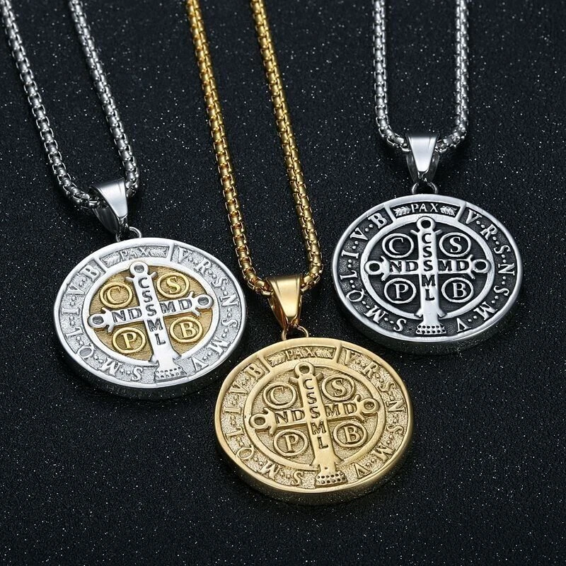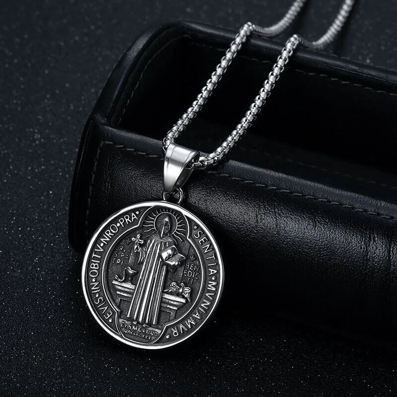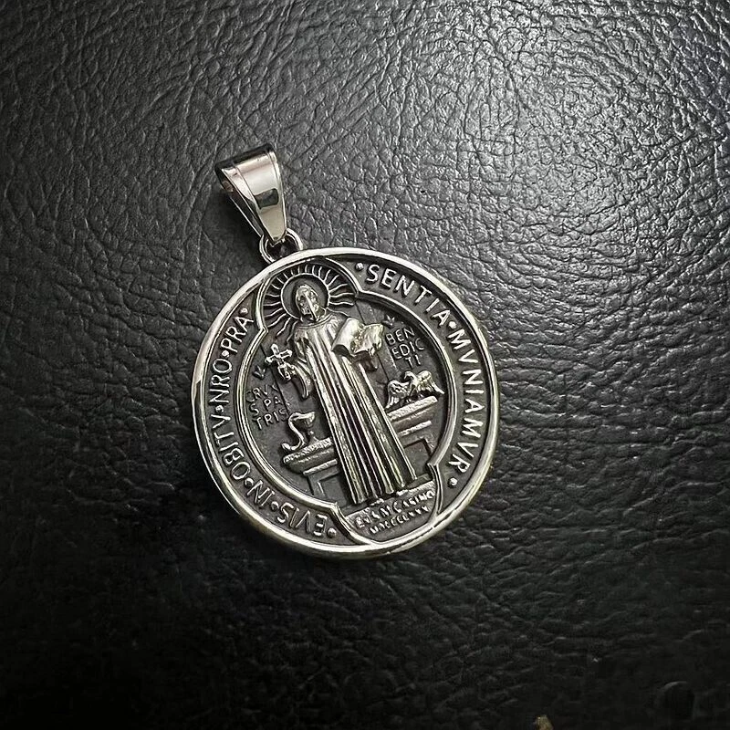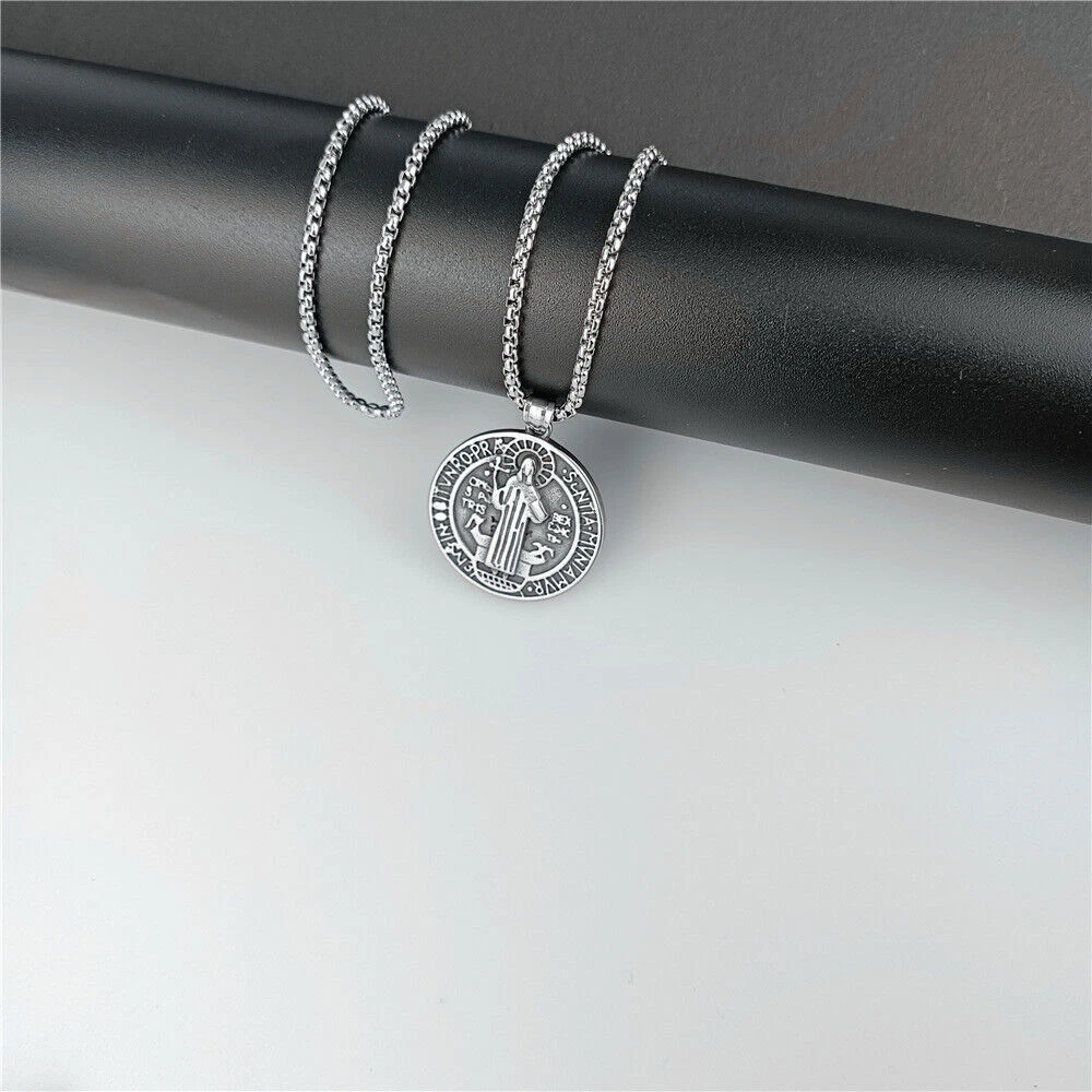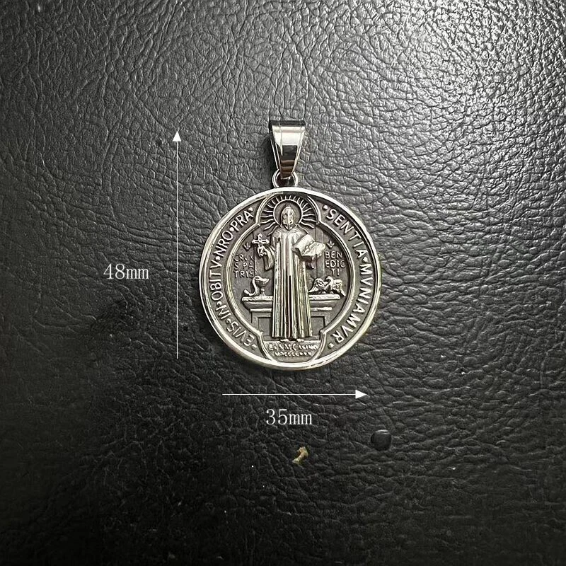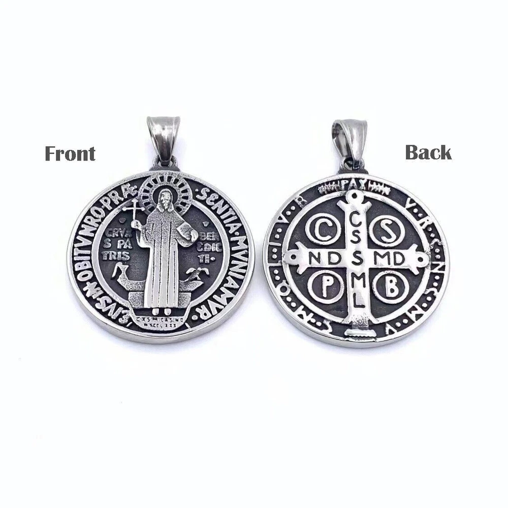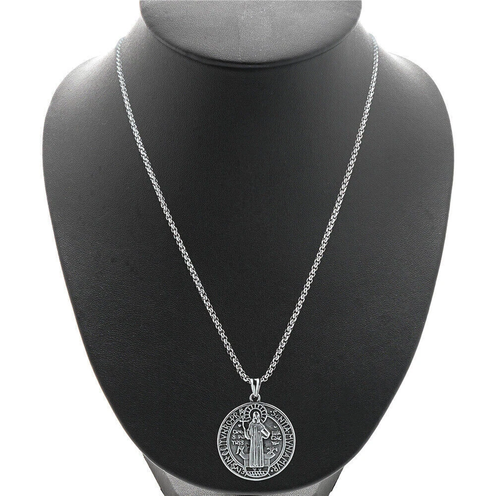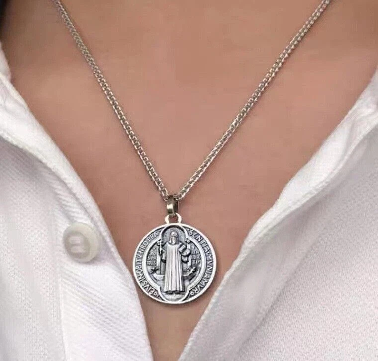eBay Brand : Cy trendy Metal (Pendant): 316L Stainless Steel Metal (Chain): 316L Stainless Steel Pendant Size: 35mm*35mm Chain length: 60cm Total Weight: 21g There is indeed no medal that possesses such wonderful power and none so highly esteemed by the holy Church as the Medal of St. Benedict. Whosoever wears this medal with devotion, trusting to the life-giving power of the holy Cross and the merits of the holy Father St. Benedict, may expect the powerful protection of this great Patriarch in his spiritual and temporal needs. The medal is one of the oldest and most honored medals used by Catholics and due to the belief in its power against evil is also known as the“devil-chasing medal. ” As early as the 11th century, it may have initially had the form of Saint Benedict’s cross, and was used by pope Leo IX. The reverse side of the medal carries the Vade retro satana (“Step back, Satan”) formula, which has been used by Catholics to ward off evil since the 15th century. Sometimes carried as part of the rosary, it is also found individually. In widespread use after its formal approval by Pope Benedict XIV in the 18th century, the medal is used by Catholics to ward off spiritual and physical dangers, especially those related to evil, poison, and temptation. Package includ e : 1 x necklace