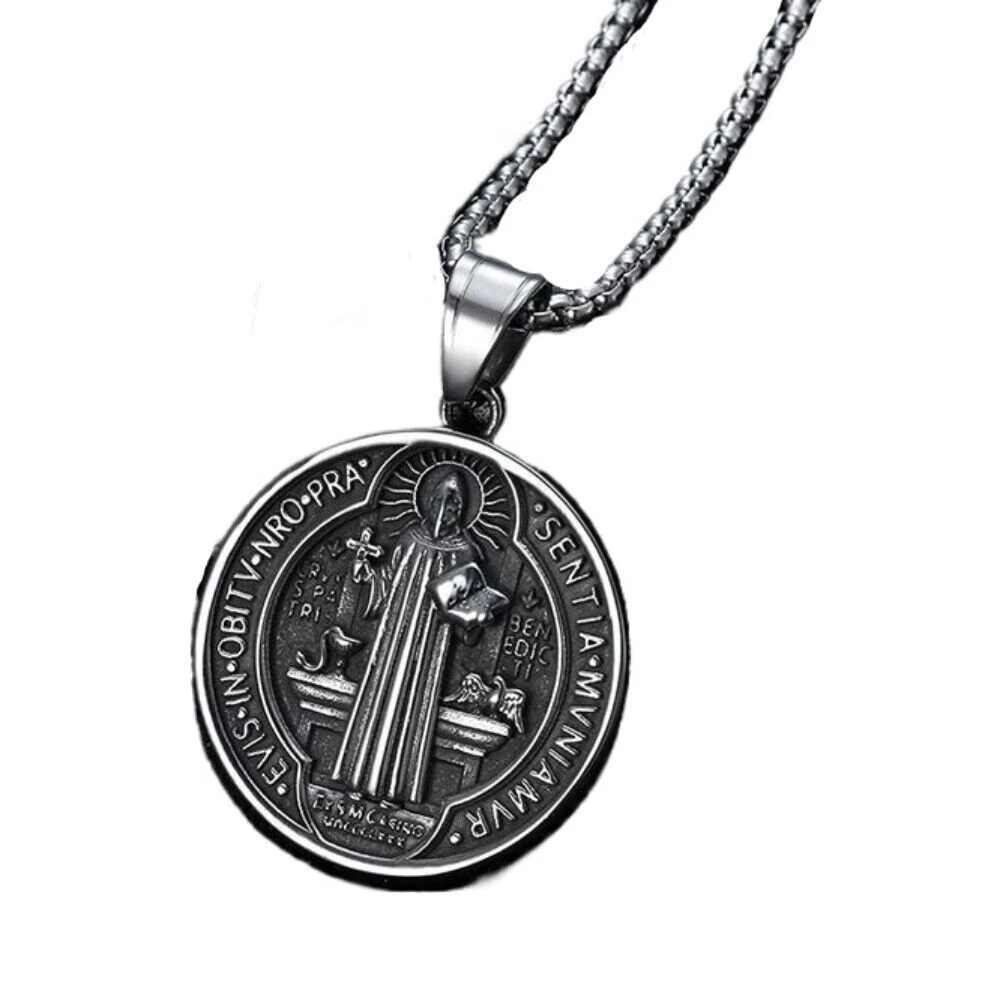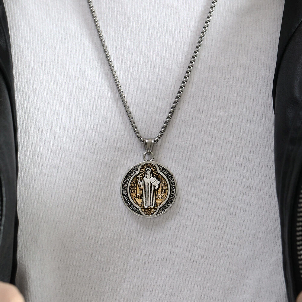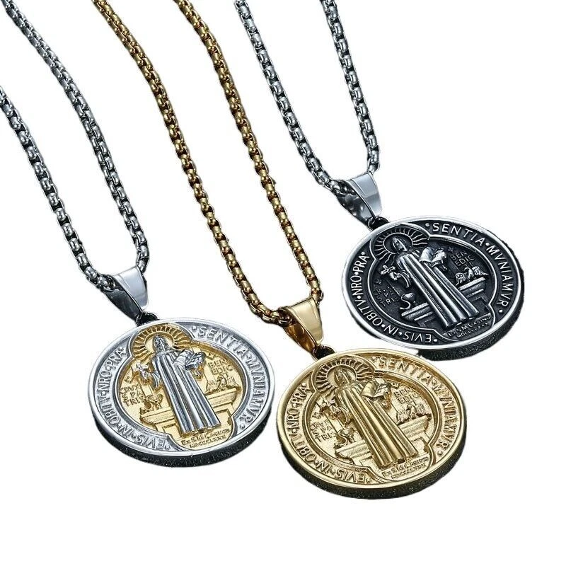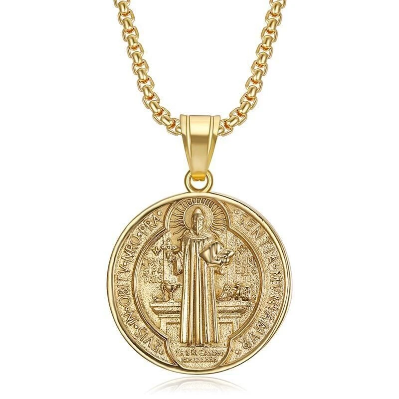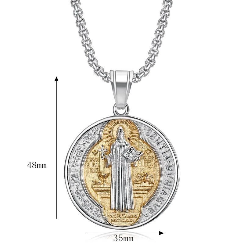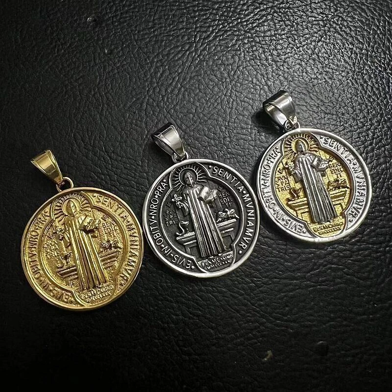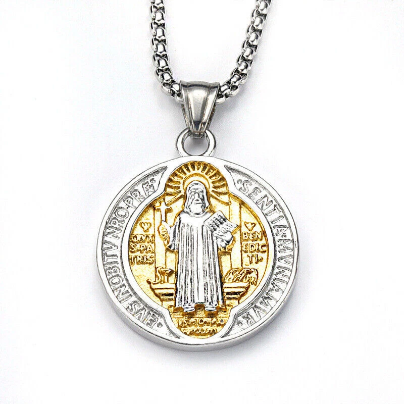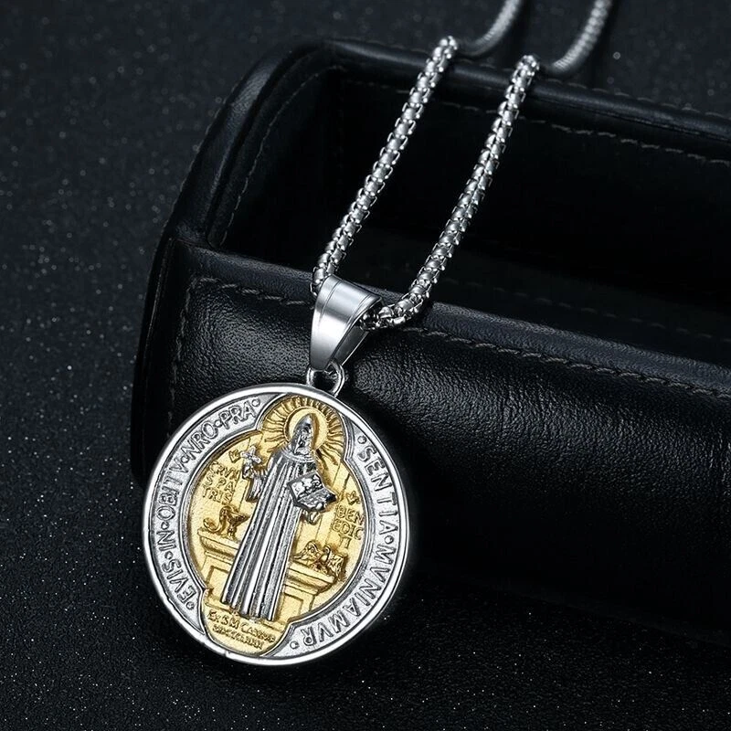 eBay Brand : Cy trendy Metal (Pendant): 316L Stainless Steel Metal (Chain): 316L Stainless Steel Pendant Size: 35mm*35mm Chain length: 60cm Total Weight: 21g There is indeed no medal that possesses such wonderful power and none so highly esteemed by the holy Church as the Medal of St. Benedict. Whosoever wears this medal with devotion, trusting to the life-giving power of the holy Cross and the merits of the holy Father St. Benedict, may expect the powerful protection of this great Patriarch in his spiritual and temporal needs. The medal is one of the oldest and most honored medals used by Catholics and due to the belief in its power against evil is also known as the“devil-chasing medal. ” As early as the 11th century, it may have initially had the form of Saint Benedict’s cross, and was used by pope Leo IX. The reverse side of the medal carries the Vade retro satana (“Step back, Satan”) formula, which has been used by Catholics to ward off evil since the 15th century. Sometimes carried as part of the rosary, it is also found individually. In widespread use after its formal approval by Pope Benedict XIV in the 18th century, the medal is used by Catholics to ward off spiritual and physical dangers, especially those related to evil, poison, and temptation. Package includ e : 1 x necklace