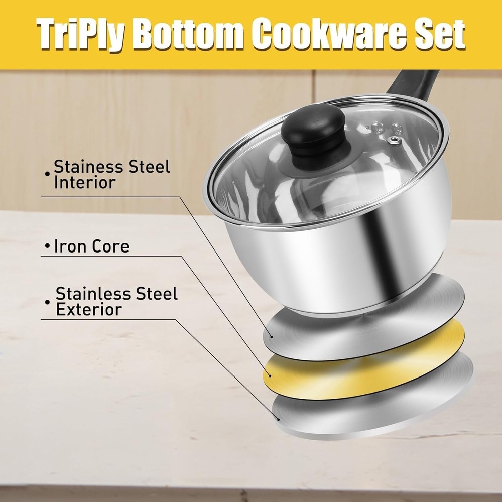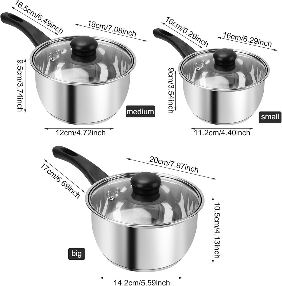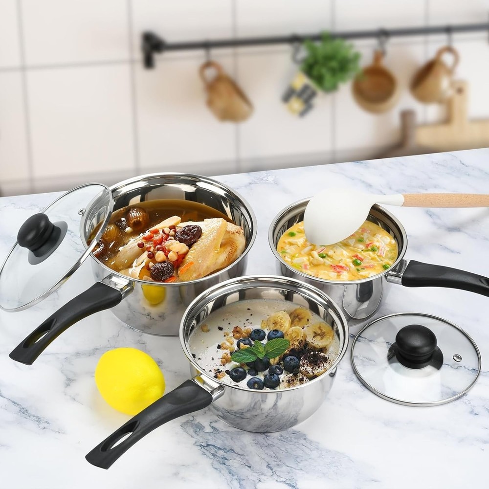 Material Stainless Steel Finish Type Uncoated Brand BSDLZCH Color Silver Capacity 3 Quarts Product Dimensions 7.9"D x 6.5"W x 3.93"H Coating Description Uncoated Is Oven Safe No Manufacturer BSDLZCH Size 7.9 See less About this item Set of 3 Various Sizes: 1 quart pot with lid, 2 quart pot with lid, 3 quart pot with lid, Meet different cooking needs. Heat-Resistant Handles: Our sauce pan has ergonomic bakelite handles. These heat-resistant handles stay cool to the touch, providing a skidproof grip and preventing burns. Fast & Even Heat Distribution - The stainless steel set thick impact-bonded iron disc layer in the bottom provides an even heat distribution. With Clear Lid: Tempered glass lids make it easy to observe the progress of your dish without losing heat. Versatile : This kitchen pot set is compatible with kinds of stovetops, such as gas, electric.