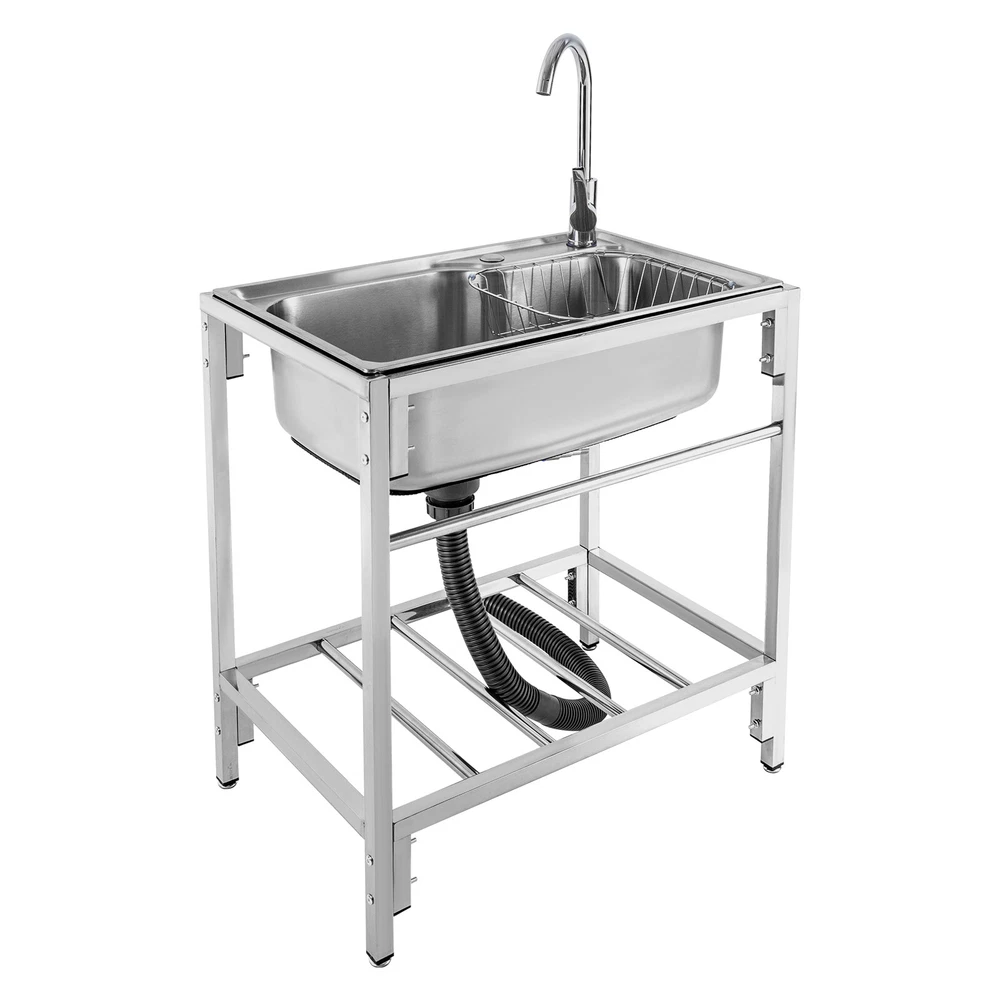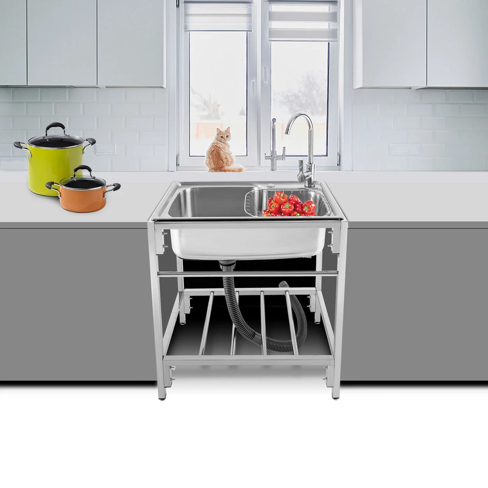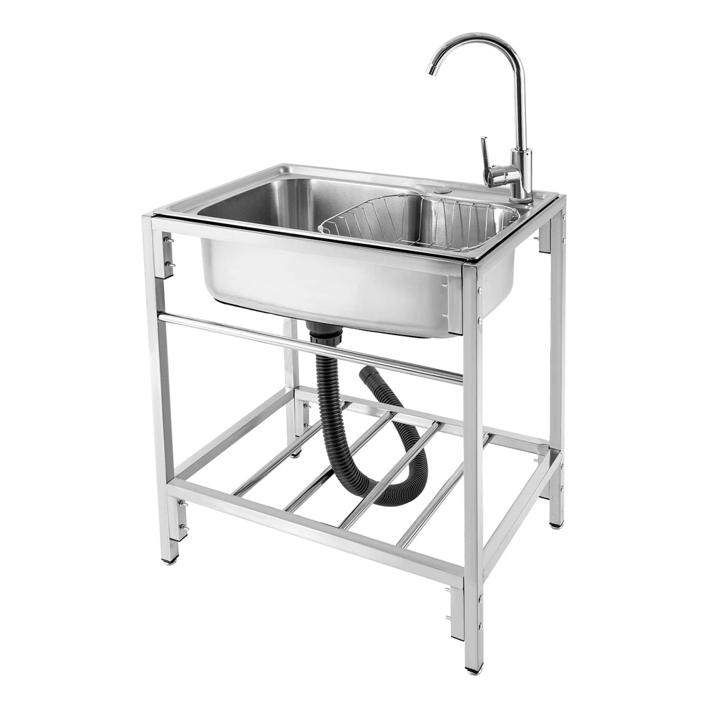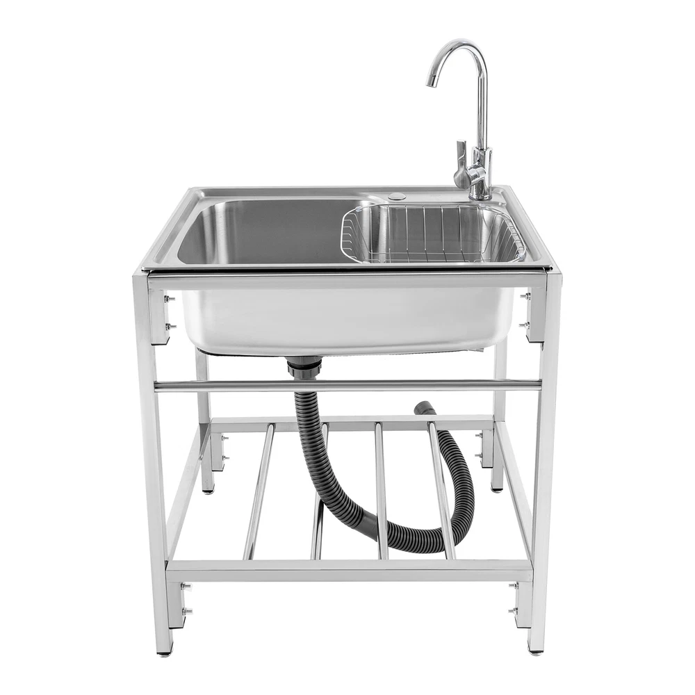 Stainless Steel Single Basin Kitchen Sink Home Laundry Sink with Faucet & Stand Description This freestanding single basin sink is the ideal cleaning aid for washing fruits and vegetables, clothes, dishes, and cookware. It has a 8.3in deep sink for a large number of cleaning tasks at once. Its raised countertop design prevents spills from wetting your clothes. The silencing pad at the bottom of the sink can reduce the sound of water impacting the metal sink, providing you with a good cleaning environment! Application This freestanding single basin sink is suitable for cleaning food, fruits, and vegetables, and any kitchen, bar, restaurant, dessert shop, clean room, cafeteria, garage, or any other business place. This will be a very useful piece of equipment when you barbecue in the backyard or garden. Specification Color: Silver Style: Single Bowl Basin Sink Installation Method: Freestanding Material: 202 Stainless Steel Surface Treatment: Brushing Process Processing: Integrated Molding Sink Countertop Weight Capacity: 100kg/ 220.46lbs Shelf Weight Capacity: 20kg/ 44.09lbs Sink Size: 61*37*21cm/ 24*14.5*8.3in Product Size: 68*44*75cm/ 26.7*17.3*29.5in Package Size: 77*48*28cm/ 30.31*18.9*11.02in Net Weight: 10.5kg/ 23.15lbs Gross Weight: 12kg/ 26.46lbs Package Included 1* Sink 1* Cold & Hot Tap 1* Sewer Pipe 1* Filter Carrycot 1* Thickened Lower Outlet 1* Drain Bracket 1 Set* Bracket 2* Water Pipes 2* Angle Valves Other Needed Accessories Key Features Large Capacity Sink : The size of the sink is 24*14.5*8.3in to allow you to complete a large number of cleaning tasks and accommodate many pots and pans at one time, making it very suitable for commercial use. Layered Filtration : Its filter carrycot is capable of layered filtration of sewage to prevent the problem of clogged downspouts caused by larger objects falling into the sink, making it easy for you to use. Farewell to Drip : We provide you with a drain basket. When you have cleaned the dishes, you can put them into the drain basket. When the water drips out, you can collect them again, and you will have a cleaner kitchen! Low Noise : The bottom of the sink is equipped with a silencing pad, which can effectively reduce the noise when the water hits the metal sink, providing you with a quieter cleaning atmosphere. Convenient to Use : It adds extra storage space at the bottom for you to put things like detergent, dishwashing basins, and vegetable baskets that you will use frequently for your daily use. And its faucet can rotate 360 ° to facilitate your cleaning. High Load-bearing Capacity : Its bracket is fixed with screws, which is more stable, making its sink countertop hold up to 220.46lbs, and bottom shelf hold 44.09lbs of items. Such a strong load-bearing capacity allows you to use it with confidence. High-quality Material : It is made of high-quality 202 stainless steel, free of lead, durable, non-toxic, and harmless so that you can rest assured of long-term use. Easy to Clean : The sink has a brushed finish and is designed with R-conners, which makes the sink smooth, not easy to get oil and scale, and easy to clean. Easy Installation : This freestanding single basin sink has a simple structure and complete accessories, so you can easily install it in a short time. Customer Service : We aim to provide quality products and services. If you have any problems, please feel free to contact us. We will reply and solve the problem for you as soon as possible. Details Raised Sink Countertop : Its countertop is raised to effectively prevent water from splashing out and wetting your clothes when washing dishes. Firm Sewer : Its sewer is embedded with steel wire, which is not only hard to break, but also prevents insects and rats from biting, thus prolonging its service life. All Steel Drainage : Its drainage system is made of all steel, making it durable and not easy to rust or smell, so you can use it with confidence. Brushing Process : Its surface is treated with a brushing process, which not only makes it more metallic but also enhances its ability to prevent corrosion, mold, and rust. Integrated Molding : This freestanding single-basin sink adopts an integrated molding process, which makes it durable without cracks. Notes Please allow the slight color difference caused by the shooting light and 1-3 cm error due to manual measurement, and make sure you do not mind before ordering. Payment Delivery details Terms of sales About us Contact us Payment We accept ebay payment 。 Fees such as import duties, taxes are not included in the item price or shipping costs. These charges are the buyer's responsibility. Delivery details Shipping: 2-9 working days to: USA Terms of sales We maintain high standards of excellence and strive for hundred percent customer satisfaction. Feedback is very important to us. We hope that you contact us immediately before you give neutral or negative feedback, so that we can address your concerns. It is impossible to address issues if we do not know about them! About us Your satis faction is our ultimate goal. We work hard to earn your trust and future business. Our certified technicians have tested each item before shipping. The unit comes with 1 year limited warranty on all manufacturing defects. a) If you receive a defective item, you may return it or ask for a discount. Please contact us within 14 days after you receive the package. b) What you returned must be intact and in its original packaging as re? u. Customer is responsible for shipping costs of the returned item. c) We will cover the cost of shipping back t with the shipping rate indicated in the registration page. We will send you a new unit or refund the full payment you paid. Thank you. Contact us Business Hour Business Hour: Monday To Friday: 8:30 AM to 5:00 PM (Beijing China time) Due to time zones, our reply to your questions may not be immediately. But within above working time, we will reply your email within 24 hours. If it's non-workdays, ple