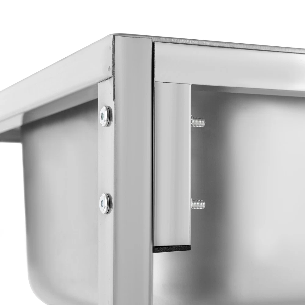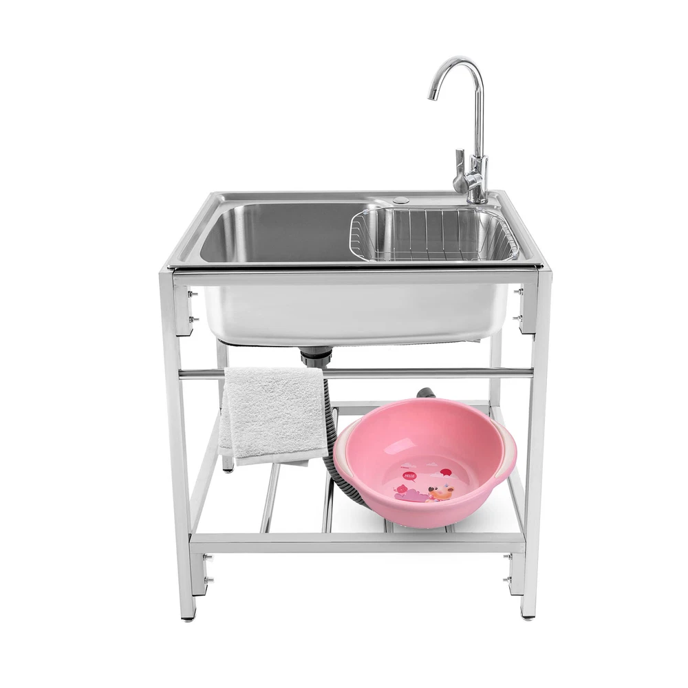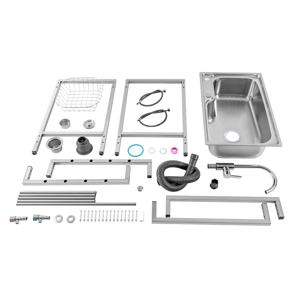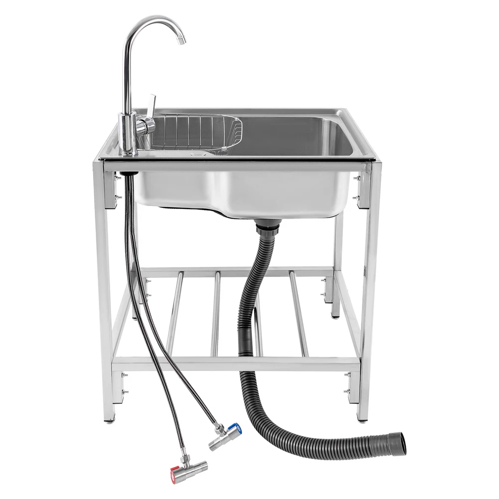 Stainless Steel Single Basin Kitchen Sink Home Laundry Sink with Faucet & Stand Description This freestanding single basin sink is the ideal cleaning aid for washing fruits and vegetables, clothes, dishes, and cookware. It has a 8.3in deep sink for a large number of cleaning tasks at once. Its raised countertop design prevents spills from wetting your clothes. The silencing pad at the bottom of the sink can reduce the sound of water impacting the metal sink, providing you with a good cleaning environment! Application This freestanding single basin sink is suitable for cleaning food, fruits, and vegetables, and any kitchen, bar, restaurant, dessert shop, clean room, cafeteria, garage, or any other business place. This will be a very useful piece of equipment when you barbecue in the backyard or garden. Specification Color: Silver Style: Single Bowl Basin Sink Installation Method: Freestanding Material: 202 Stainless Steel Surface Treatment: Brushing Process Processing: Integrated Molding Sink Countertop Weight Capacity: 100kg/ 220.46lbs Shelf Weight Capacity: 20kg/ 44.09lbs Sink Size: 61*37*21cm/ 24*14.5*8.3in Product Size: 68*44*75cm/ 26.7*17.3*29.5in Package Size: 77*48*28cm/ 30.31*18.9*11.02in Net Weight: 10.5kg/ 23.15lbs Gross Weight: 12kg/ 26.46lbs Package Included 1* Sink 1* Cold & Hot Tap 1* Sewer Pipe 1* Filter Carrycot 1* Thickened Lower Outlet 1* Drain Bracket 1 Set* Bracket 2* Water Pipes 2* Angle Valves Other Needed Accessories Key Features Large Capacity Sink : The size of the sink is 24*14.5*8.3in to allow you to complete a large number of cleaning tasks and accommodate many pots and pans at one time, making it very suitable for commercial use. Layered Filtration : Its filter carrycot is capable of layered filtration of sewage to prevent the problem of clogged downspouts caused by larger objects falling into the sink, making it easy for you to use. Farewell to Drip : We provide you with a drain basket. When you have cleaned the dishes, you can put them into the drain basket. When the water drips out, you can collect them again, and you will have a cleaner kitchen! Low Noise : The bottom of the sink is equipped with a silencing pad, which can effectively reduce the noise when the water hits the metal sink, providing you with a quieter cleaning atmosphere. Convenient to Use : It adds extra storage space at the bottom for you to put things like detergent, dishwashing basins, and vegetable baskets that you will use frequently for your daily use. And its faucet can rotate 360 ° to facilitate your cleaning. High Load-bearing Capacity : Its bracket is fixed with screws, which is more stable, making its sink countertop hold up to 220.46lbs, and bottom shelf hold 44.09lbs of items. Such a strong load-bearing capacity allows you to use it with confidence. High-quality Material : It is made of high-quality 202 stainless steel, free of lead, durable, non-toxic, and harmless so that you can rest assured of long-term use. Easy to Clean : The sink has a brushed finish and is designed with R-conners, which makes the sink smooth, not easy to get oil and scale, and easy to clean. Easy Installation : This freestanding single basin sink has a simple structure and complete accessories, so you can easily install it in a short time. Customer Service : We aim to provide quality products and services. If you have any problems, please feel free to contact us. We will reply and solve the problem for you as soon as possible. Details Raised Sink Countertop : Its countertop is raised to effectively prevent water from splashing out and wetting your clothes when washing dishes. Firm Sewer : Its sewer is embedded with steel wire, which is not only hard to break, but also prevents insects and rats from biting, thus prolonging its service life. All Steel Drainage : Its drainage system is made of all steel, making it durable and not easy to rust or smell, so you can use it with confidence. Brushing Process : Its surface is treated with a brushing process, which not only makes it more metallic but also enhances its ability to prevent corrosion, mold, and rust. Integrated Molding : This freestanding single-basin sink adopts an integrated molding process, which makes it durable without cracks. Notes Please allow the slight color difference caused by the shooting light and 1-3 cm error due to manual measurement, and make sure you do not mind before ordering. Payment Delivery details Terms of sales About us Contact us Payment We accept ebay payment 。 Fees such as import duties, taxes are not included in the item price or shipping costs. These charges are the buyer's responsibility. Delivery details Shipping: 2-9 working days to: USA Terms of sales We maintain high standards of excellence and strive for hundred percent customer satisfaction. Feedback is very important to us. We hope that you contact us immediately before you give neutral or negative feedback, so that we can address your concerns. It is impossible to address issues if we do not know about them! About us Your satis faction is our ultimate goal. We work hard to earn your trust and future business. Our certified technicians have tested each item before shipping. The unit comes with 1 year limited warranty on all manufacturing defects. a) If you receive a defective item, you may return it or ask for a discount. Please contact us within 14 days after you receive the package. b) What you returned must be intact and in its original packaging as re? u. Customer is responsible for shipping costs of the returned item. c) We will cover the cost of shipping back t with the shipping rate indicated in the registration page. We will send you a new unit or refund the full payment you paid. Thank you. Contact us Business Hour Business Hour: Monday To Friday: 8:30 AM to 5:00 PM (Beijing China time) Due to time zones, our reply to your questions may not be immediately. But within above working time, we will reply your email within 24 hours. If it's non-workdays, ple