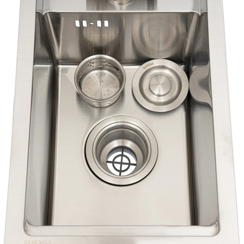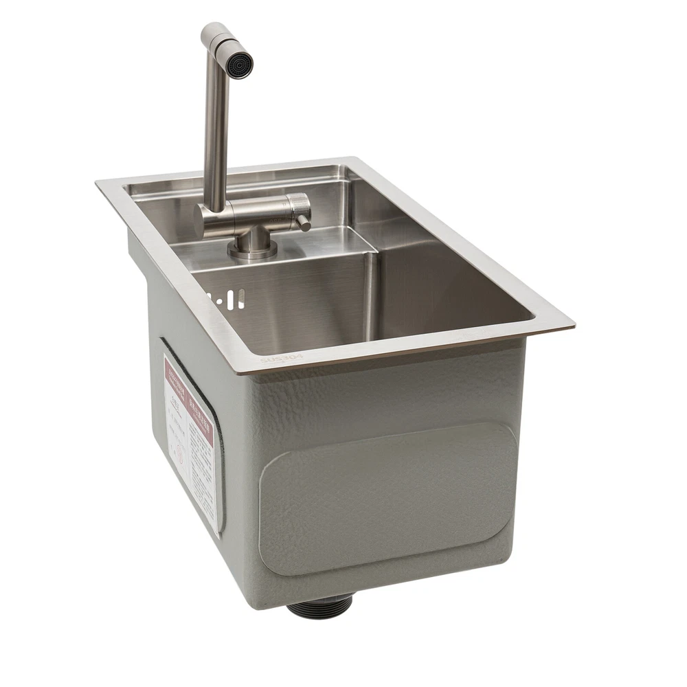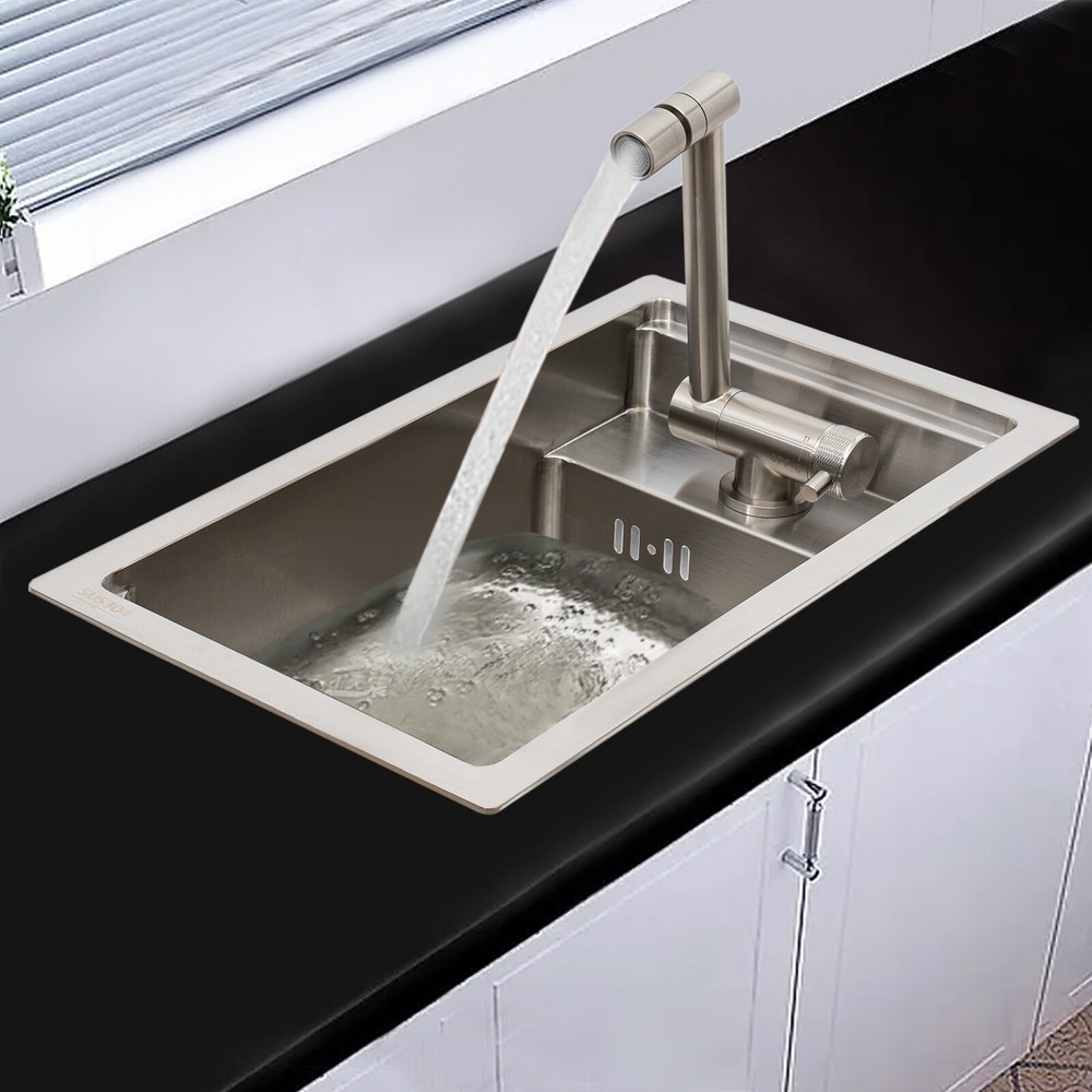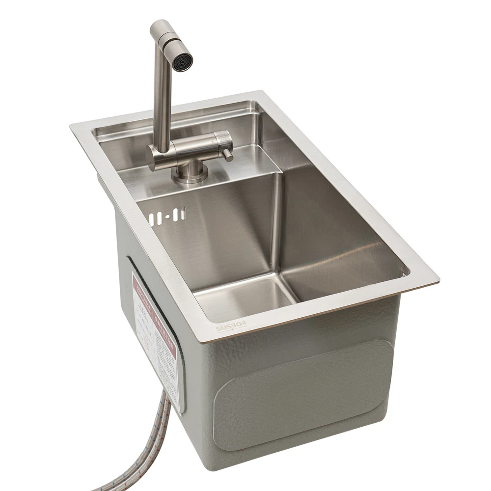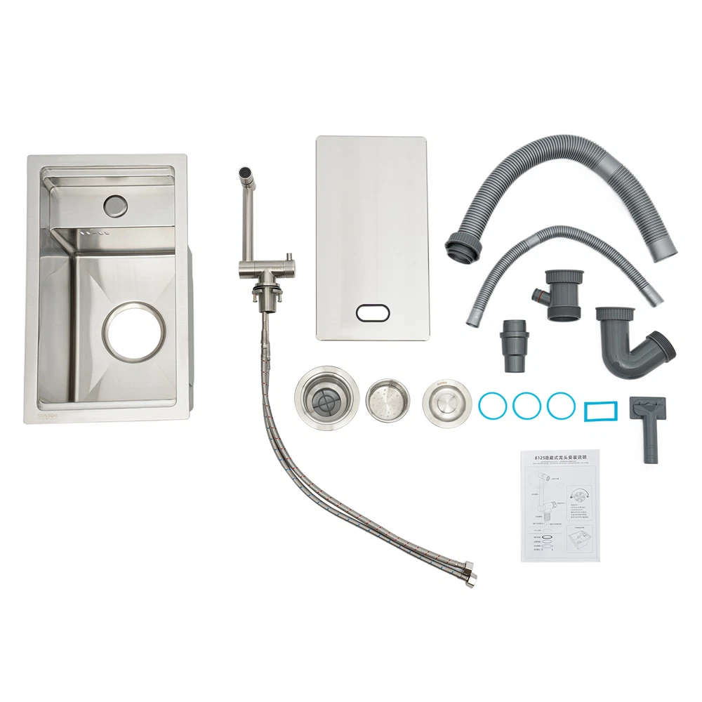Description Imagine being able to prepare food in the kitchen in the comfort of your family by simply covering the sink with a discreet design to prevent it from crowding your workspace. This remarkable product boasts several notable features that set it apart in the market. Single Bowl Bar Kitchen Laundry Sink Set Stainless Steel Hidden w/Folding Faucet Welcome~ Description Imagine being able to prepare food in the kitchen in the comfort of your family by simply covering the sink with a discreet design to prevent it from crowding your workspace. This remarkable product boasts several notable features that set it apart in the market. Key Features High-quality Material: The sink is crafted from high-quality brushed SUS304 stainless steel, known for its exceptional durability, corrosion resistance, and long-lasting performance. This ensures that our sink can withstand heavy daily use and maintain its elegant appearance for years to come. Expand Your Using Space: With foldable faucet and accompanying cover, the concealed sink easily blends into your countertop, creating an almost seamless and integrated look, and expanding your workspace for various kitchen activities. Multifunctional Sink: The sink comes with a hot and cold water faucet, so you can easily control the temperature of the water with the handle, either cold or hot, depending on your preference. The honeycomb bubble design of the faucet provides a soft dispense of water to prevent splashing and wetting of the countertop. Beautiful Appearance: Silver-colored sink has a metallic chic feel and the brushed finish adds a touch of sophistication to any kitchen or utility area. Its sleek and modern look not only enhances the overall aesthetics but also facilitates easy cleaning, effectively reducing the appearance of water spots and fingerprints. Sound Insulation & Anti-condensation Design: Rubber mute pads reduce water flow noise, providing you with excellent experience. The anti-condensation coating can effectively prevent the temperature difference from being too large. Easy to Drain: This sink features X-shaped water guide lines on the bottom that helps to drain quickly without clogging or splashing. Assembly in a Breeze: Complete installation accessories and a simple structure allow you to complete the assembly in a very short time! Guaranteed Customer Service: Our friendly customer service team would be happy to solve your issues with our sink. If you have any issues, feel free to reach out to us. Details R10 Rounded Corners: R10 small corner design with superior aesthetics, which improves safety and is easy to clean. Exquisite Overflow Holes: It allows you to say goodbye to water spills and keep your kitchen as clean as possible. Internal Platform: It allows you to place some cleaning utensils within reach, such as sponge wipes, detergents, to improve cleaning efficiency. Stainless Steel Drain Strainer: It easily filters leftovers, prevents clogging of the drain, and allows for smooth drainage PP Material Downpipe: It has high-temperature resistance and prevents anti-odor and anti-clogging . Handle with Plastic Protective Cover: It's easier to pull and put down and protects your hands. V-shaped Drainpipe: The v-shaped design pipe effectively isolates bad smells and prevents backwater, and clogging. Application It is suitable for kitchen, rv, wet bar, balcony, basement, yard, laundry, office or bathroom. Specifications Material: 304 Stainless Steel, PP, Plastic, Rubber Color: Silver Shape: Rectangular Surface Treatment: Brushed, Anti-condensation Coating Installation Type: Drop-In Assembly Required: Yes Number of Basins: 1 Sink Countertop Load-bearing Capacity: 5kg/ 11.02lbs Sink Load-bearing Capacity: 20kg/44.09lbs Gross Weight: 7.62kg/16.8lbs Sink Size: 43×25×22/16.9×9.8×8.7in Cover Size(L*W): 38.6×20cm/15.2×8in Package Size: 52×37×41cm/20.5×14.6×16.1in Package Included 1* Sink 1* Cold and Hot Faucet 1* Cover 1* Drain Strainer 1* Chinese Manual All Accessories for Installation Notes To increase the life of the sink, please do not scratch its surface with sharp objects. Please allow the slight color difference caused by the shooting light and 1-3cm error due to manual measurement, and make sure you do not mind before you order. tu2 Payment Delivery details Terms of sales About us Contact us Payment We accept ebay payment 。 Fees such as import duties, taxes are not included in the item price or shipping costs. These charges are the buyer's responsibility. Delivery details Shipping: 2-9 working days to: USA Terms of sales We maintain high standards of excellence and strive for hundred percent customer satisfaction. Feedback is very important to us. We hope that you contact us immediately before you give neutral or negative feedback, so that we can address your concerns. It is impossible to address issues if we do not know about them! About us Your satis faction is our ultimate goal. We work hard to earn your trust and future business. Our certified technicians have tested each item before shipping. The unit comes with 1 year limited warranty on all manufacturing defects. a) If you receive a defective item, you may return it or ask for a discount. Please contact us within 14 days after you receive the package. b) What you returned must be intact and in its original packaging as re? u. Customer is responsible for shipping costs of the returned item. c) We will cover the cost of shipping back t with the shipping rate indicated in the registration page. We will send you a new unit or refund the full payment you paid. Thank you. Contact us Business Hour Business Hour: Monday To Friday: 8:30 AM to 5:00 PM (Beijing China time) Due to time zones, our reply to your questions may not be immediately. But within above working time, we will reply your email within 24 hours. If it's non-workdays, please kindly be patient and wait till Monday. Please contact us with ebay message. Please feel free to contact us if you have any questi