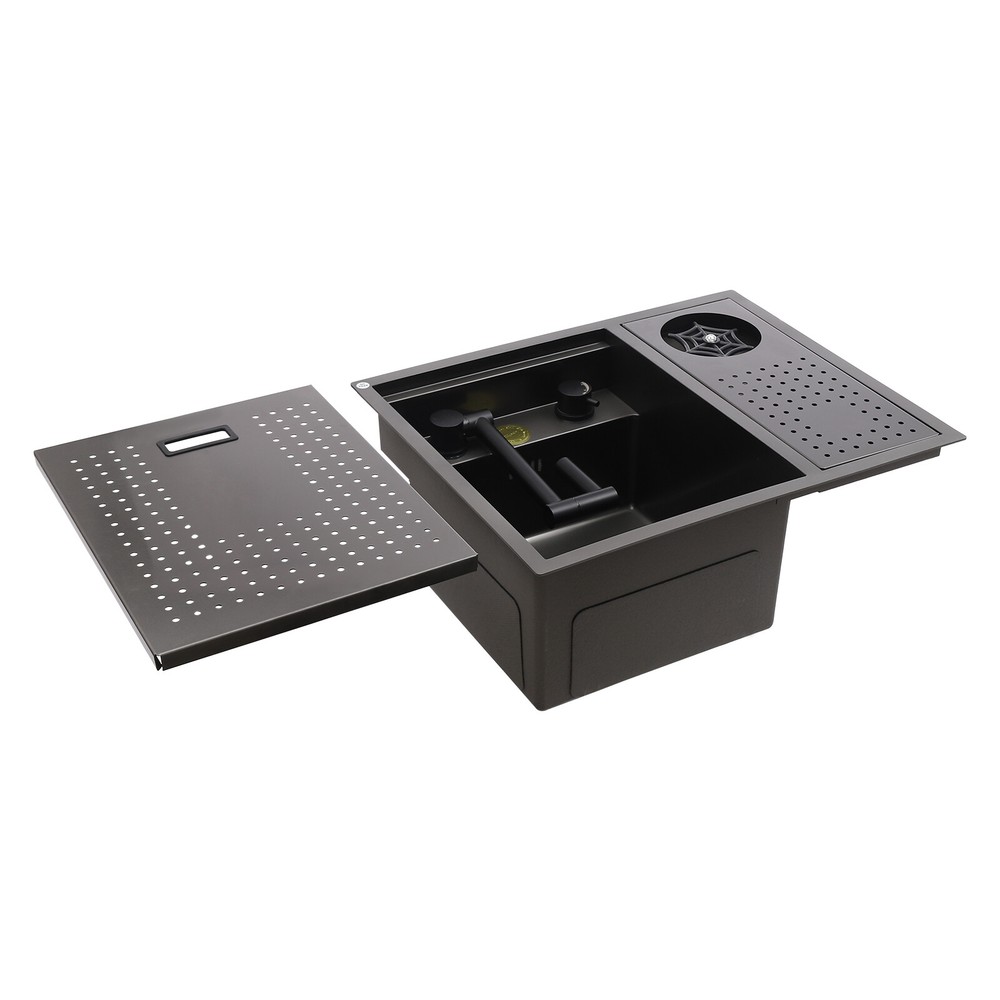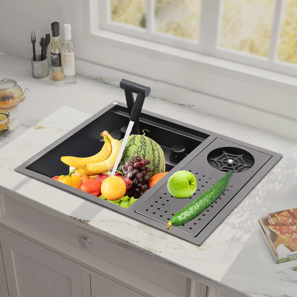 Specification Material: Nano-stainless steel Color: Black Process: Spray Finishing Shape: Rectangular Style: Modern Assembly Required: Yes Mounting Type: Under-counter, Center, Countertop Sink Depth: 220mm/8.66in Product Size: 54.86*44.96*22.1cm/21.6*17.7*8.7in Package Size: 60*50*26.5cm/23.62*19.69*10.43in Gross Weight: 8.6kg/18.96lbs Net Weight: 7.3kg/16.09lbs Package Included 1* Bar Sink 1* Faucet Other Accessories for Assembly Drop In Sink Single Bowl Stainless Steel Top Mount Kitchen Bar Sink w/Faucet Specification Material: Nano-stainless steel Color: Black Process: Spray Finishing Shape: Rectangular Style: Modern Assembly Required: Yes Mounting Type: Under-counter, Center, Countertop Sink Depth: 220mm/8.66in Product Size: 54.86*44.96*22.1cm/21.6*17.7*8.7in Package Size: 60*50*26.5cm/23.62*19.69*10.43in Gross Weight: 8.6kg/18.96lbs Net Weight: 7.3kg/16.09lbs Package Included 1* Bar Sink 1* Faucet Other Accessories for Assembly Description Our stainless steel sink is a bar sink solution that combines modern design with practical functionality. Designed for home bars, small entertainment spaces, or professional bartending venues, it cleverly hides the sink under the bar, making it virtually invisible when not in use, which saves space and instantly enhances the cleanliness and premium feel of the space. Key Features Made to Last: High-quality nano stainless steel and exquisite black coating make this product bright, dirt and oil-resistant, wear-resistant, and not easy to rust and deform, ensuring a long service life. Advanced Technology: The sound damping pads and acoustic insulation materials reduce noise and ensure excellent noise reduction and quiet reliability.The thick undercoating also can prevent condensation. Convenient Cleaning: The 360° rotatable faucet and 90° foldable handles provide a full range of cleaning for your items, allowing you to enjoy a comfortable and easy cleaning experience. Large Sink Space: Large 8.66-inch deepening capacity can accommodate more pots and pans while preventing splashing. It can meet the large bar, family, and other multi-scenario uses. Innovative Design: When not in use, you can close the cover to make it a kitchen workbench, allowing you to do chopping, kneading, etc. on it, providing you with great convenience. In addition, you can also reverse the cover to turn it into a draining basin in a second! Quick Draining: The X-shaped inverted flow design gives the sink a good drainage function, which can effectively prevent water from accumulating. In addition, it makes the surface less likely to adhere to stains, making it easy for you to clean. The filter basket can keep large solid residues inside the sink and protect the pipe from blocking. Installation Options Available: The product has three installation options: under-counter basin installation, center basin installation, and countertop basin installation, you can choose according to your own preferences or the specifics of the space. Hot & Cold Water Adjustment: The configured hot and cold water adjustment valve provides great convenience for you to regulate the water temperature. Simple Installation: Simple construction and a full range of installation accessories ensure that you can install the sink quickly and accurately to meet your needs in a short period. Effortless Cleaning: The smooth surface, round corners, and simple structure allow you to clean it easily without leaving dead corners of dirt accumulation. Details Push Cup Washer: It only requires you to press with one hand to dispense water for a quick cup rinse. Anti-overflow Hole: This design can effectively prevent the water from overflowing when you don't turn off the faucet in time. Application This product is suitable for kitchen sinks, center island counter sinks, bar sinks, flat sinks, wine counter sinks, etc. How to Install Place the sink in the installation position, turn it over, and place it on the floor. Press down on the sink and trace the outline along the edge of the sink. Remove the sink and draw a cut line 0.39 inch inside the outline of the sink. Drill a hole with a diameter of 14.96 inches inside the cutting line, put in the saw blade, and cut along the cutting line, then use sandpaper(not included) to smooth the cut. Fill the outside of the incision with clear silicone(some installers use glass glue)(not included), width 0.13-2.52in. After installing the kitchen faucet, put the sink close to the front edge and ease it down. Check the position of the sink on the countertop again, apply glass adhesive(not included) or install the fastener at the connecting strip, and clean the countertop. Notes Please check the size carefully before ordering. Please note that if you carry out the under-counter basin installation, you need to take the cover and sink together to the qualified installation person, in order to open and install the holes together against each other, to avoid the situation that the cover can not be covered. Please do not clean it with hard tools like steel wire balls for a longer service life. Please allow the slight color difference caused by the shooting light and 1-3cm error due to manual measurement, and make sure you do not mind before ordering. Payment Delivery details Terms of sales About us Contact us Payment We accept ebay payment 。 Fees such as import duties, taxes are not included in the item price or shipping costs. These charges are the buyer's responsibility. Delivery details Shipping: 2-9 working days to: USA Terms of sales We maintain high standards of excellence and strive for hundred percent customer satisfaction. Feedback is very important to us. We hope that you contact us immediately before you give neutral or negative feedback, so that we can address your concerns. It is impossible to address issues if we do not know about them! About us Your satis faction is our ultimate goal. We work hard to earn your trust and future business. Our certified technicians have tested each