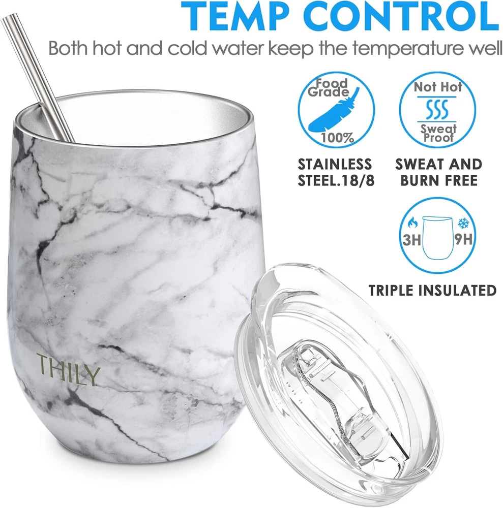 Store New Arrivals Add to Favorite View Feedback Contact Stainless Steel Stemless Wine Glasses 12 Oz Vacuum Insulated Wine Tumbler with Lid and Straw, Reusable, Keep Cold & Hot for Drinks, Coffee, Cocktails, 2 Pack(Teal + Marble) Description Age Range Description Adult Style Tableware Capacity 350 Milliliters Number of Items 2 Pattern Marble Material Type Stainless Steel Theme Wine Finish Types Matte Item Dimensions W x H 3.54"W x 4.52"H Unit Count 2.0 Count Material Stainless Steel Capacity 350 Milliliters Package Type Standard Packaging Additional Features Wineglasses, Stemless, Thermal Specific Uses For Product Home,Office,Picnic,Hiking,Travel Reusability Reusable Occasion Christmas, Wedding, Birthday, Thanksgiving Item Weight 6.08 ounces Item Weight 6.08 ounces Occasion Christmas, Wedding, Birthday, Thanksgiving Special Feature Wineglasses, Stemless, Thermal Color Matte Teal + White Marble Material Features Insulated Product Care Instructions Machine Wash, Hand Wash Only Built-In Media Straw Brush, Stainless Steel Straw, Lid, Insulated Wine Glass Recommended Uses For Product Home; Office; Hiking; Travel; Outdoor;Sport; Indoor; Party; Gift; Camping Material Type Free BPA Free Style Name Tableware Size 2 Count (Pack of 1) PREMIUM MATERIAL OFFER HEALTHIER DRINKING WAY - THILY stemless vacuum insulated wine tumblers are crafted from 304 food-grade 18/8 stainless steel, durable and shatterproof. Highly resistant to rust and to absorbing odor, taste. All components are non-toxic, BPA free and environmentally friendly, won’t alter flavors. Safer and healthier than plastic or wine glasses TRIPLE-INSULATED KEEP YOUR DRINKS COLD LONGER - these unbreakable wine tumblers are triple-insulated keep hot up to 3 hours and cold up to 9 hours. The exterior of the vacuum sealed area is dipped in copper for added insulation and sweat proof. The thermal copper lining keeps your wine or coffee at the perfect temperature SPLASH-PROOF LID AND RUBBER BOTTOM - comes with a push-on lid keep any dust particles getting in and stop major spills, silicone base to keep it from sliding on slippery surfaces and reduce the noise. You will also get a reusable stainless steel metal straw. Our wine tumbler set will take you to enjoy a fresh juice or an ice-cold cocktail to a new level in this summer THE BEST GIFT IDEA FOR ANY OCCASION - various color choices allow for so many ideal gift options. Best cute gift choices for wife, bride, bridesmaid, men, girls, wedding birthday party, Christmas, Thanksgiving, Valentine, mother or teachers day. Great for outdoor, camping, travel, office, boating, picnics, the pool, the beach or the patio PERFECT CAPACITY AND HIGH QUALITY - 12 oz capacity can hold great for coffee, wine, tea, cocktails, champagne, beer and more. This stainless steel insulated travel cup is lightweight and portable to take on your outdoor adventures. If you have any problem with our stemless vacuum insulated wine tumbler with lid, please at anytime Product Description THILY believed that if we made a crave-worthy cup and bottle that combined fashion with function, people would reduce buying disposable bottles or cups and we could reduce single-use plastic consumption worldwide. Quality for a , Here is THILY When the weather gets hot, you drinking wine or juice outdoors, drinks inevitably become lukewarm When you go out to barbecue or picnic you have kids who tend to run around, knock things over and break anything that’s remotely breakable I would recommend THILY 12oz vacuum insulated stemless wine tumbler set with slideable lid and straw Enjoy a fresh juice or an ice cold cocktail to a new level this summer! Safest Material to Hold Your Drinks These stainless steel tumblers set are made of food-grade 18/8 stainless steel metal. Highly resistant to rust and to absorbing odor, taste or bacteria. Triple Insulation Technology, Sweat Proof Excellent temperature retention keeps your drinks cold up to 9 hours and hot up to 3 hours . The thermal copper lining keeps your wine or coffee at the perfect temperature Various Color for Different Ideal Gift Options Best cute gift choices for dad, mom, wife, bride, bridesmaid, men, children, girls, wedding birthday party, Christmas, Thanksgiving, Valentine, mother father or teacher's day Great for Outdoor Activities and Travel These stainless steel insulated travel cup are unbreakable , portable and durable , great for outdoor, camping, travel, office, boating, picnics, the pool, the beach or the patio Make Your Home, Camping or Travel Unforgettable With Your Favorite Drink At Hand! Package Includes: 2 x Insulated Wine Glasses 2 x Spill-proof Lids 2 x Stainless Steel Straws 1 x Straw Brush Warm tips: The lid is designed to be splash-proof and fit securely on the top, so you don’t have to worry about any major spills. However, it’s not designed to be completely leak-proof, so try to keep tumbler upright when you’re on the go. Reattach the outer rubber ring will help reduce the leakage. The slider is removable(use a flat object to pop the slider out on the side) If filling with hot liquid, allow liquid to cool down with the lid off for at least 4 minutes before attaching the lid. ABOUT US We offer the best prices around on high quality products. Our E-store includes media such as books, movies, music and games while offering electronics, toys, sporting apparel, clothing, tools, general home, garden items and more. SHIPPING We are always working hard to ensure your package arrives as soon as possible. Please understand that some factors like weather, high postal traffic, and the performance of shipping companies are outside of our control. We offer free shipping to the lower 48 states and ship within 2 business days of payment, usually sooner. We do not accept P.O. Boxes. Please provide a physical address. For shipping outside of the continental USA, we only use eBay's Global Shipping Program.The item is shipped to KY and then sent to the rest of the world. Internation