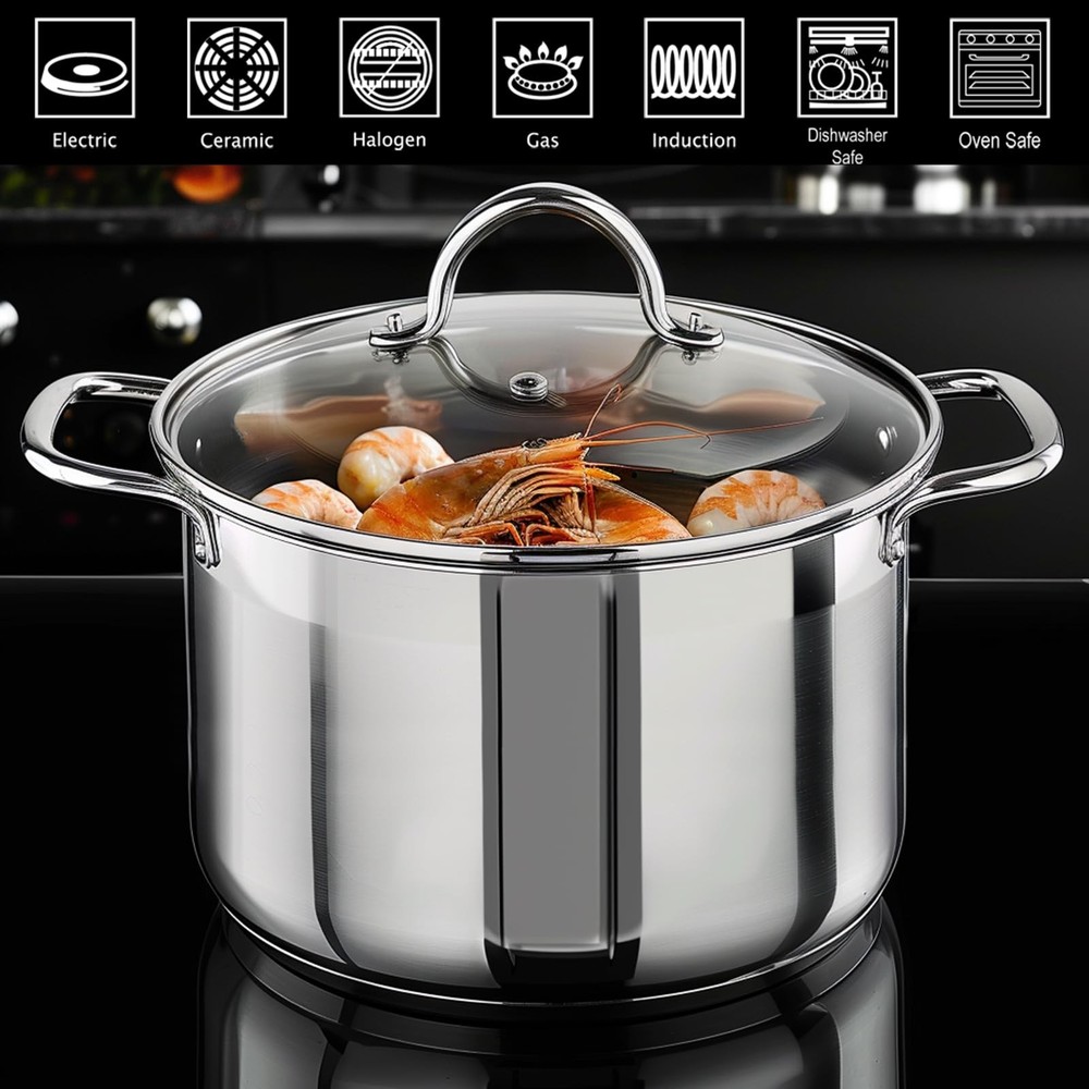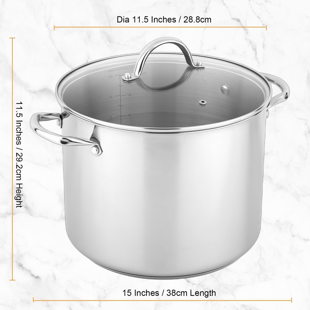 Our stainless steel stockpot can hold up to at a time and is suitable for any kitchen. Easy to use for both culinary beginners in the home kitchen and experienced commercial chefs. It is versatile that you can use it to cook family-sized stews, soups, pasta, sauces or canned water. The stockpot features food-grade healthy nickel free stainless steel with excellent polishing process, construction with great stability and strength, takes into account durability, aesthetics and health-conscious. The encapsulated aluminum base can distribute heat quickly and evenly, to achieve fast and lasting heating. The stainless steel stockpot can be used on any stovetop, is sensitive-friendly, oven-safe, has the lid removed, and can be used at temperatures up to 500 ℉. It is worth better care, so we recommended hand wash and dry the water after cleaning before storing. Stackable design, to maximize storage space and keep your kitchen organized. Our stainless steel stockpot has riveted stainless steel side handles for comfortable and durable, and reliable strength. It is your reliable choice for cooking and serving dishes, whether you're carrying them to the kitchen or the backyard. The stockpot comes with a clear tempered glass lid that circulates heat and moisture during cooking, to retains the natural flavor and nutrients of the food, and also provides better visibility to check the food at a glance. The small hole in the lid helps to release steam and prevent boiling from spilling over. This stockpot is the perfect tool for every cooking lovers. We are committed to providing quality products and service. If you have any questions about our products, please feel free to contact us. FOOD-GRADE STAINLESS STEEL: The 14qt stock pot is made of high-quality stainless steel, ensuring durability, corrosion resistance, and a sleek modern look. Its encapsulated bottom ensures even heat distribution for perfect cooking results, whether you're simmering, boiling, or stewing. VERSATILE COOKING: The perfect choice for making large quantities of soups, stews, and stocks, catering to the needs of both home cooks and event caterers with its generous capacity. COOKTOP COMPATIBILITY: Effortlessly compatible with induction cooktops and all other stovetops, offering flexibility in cooking methods and adapting to various kitchen setups. TEMPERED GLASS LID & ERGONOMIC HANDLES: The see-through tempered glass lid allows for easy monitoring of the cooking process, while the securely riveted handle ensures a comfortable and safe grip, enhancing both convenience and safety. DISHWASHER SAFE & OVEN SAFE: The stock pot is dishwasher safe, but it is recommended to handwash it in order to maintain its stainless steel shine. It is also oven-safe for added versatility, effectively distributing and retaining heat for even cooking. The maximum temperature it can withstand is 500°F/260℃, except for the glass lid which can handle up to 350°F/176℃.