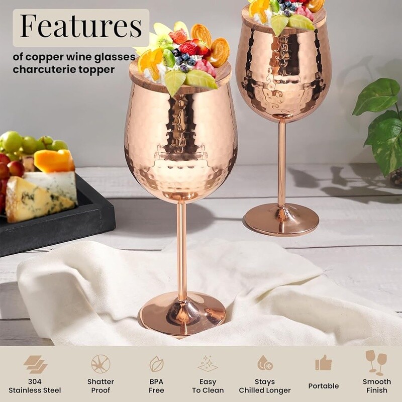 You may also like Mighty Mite Canister Vacuum Cleaner 12 Amp Suction 360 Hose Blower Tool Set New 80.17 USD 84.39 USD Free shipping 5% off Joy Nativity Yard Sign Outdoor Christmas Decorations 3 PCS Metal Holiday Decor 56.79 USD Free shipping 28 Inch Charcoal Offset Smoker Grill Side Firebox Warming Rack Heavy Duty Wheels 136.33 USD 143.51 USD Free shipping 5% off 2-in-1 Sweep & Mop Deluxe Multi-Surface Floor Cleaning Kit Heavy Duty Cloths New 28.41 USD 29.91 USD Free shipping 5% off Kosher Ground Cinnamon 6 Pack No Artificial Flavors Enhance Flavor 2.12 oz New 22.83 USD 24.03 USD Free shipping 5% off Onion Ring Flavored Snack Chips 10 Count Multipack Individual Bags Easy Snack US 7.91 USD 8.97 USD Free shipping 12% off Gluten Free Chocolate Chip Cookie Mix 3 Pack Easy Bake Dough 3 Dozen Cookies New 21.2 USD 22.32 USD Free shipping 5% off 36 Pcs Teacher Gifts Coffee Glass Bulk Makeup Bags Pens Thank You Graduation New 74.09 USD Free shipping Square Bar Stool Cushions Set of 4 Non-Slip Memory Foam Chair Pad Comfort New 42.87 USD 45.13 USD Free shipping 5% off 8 Drawer Rolling Storage Cart W/ Wheels Organizer Home Office Crafts Makeup New 80.71 USD Free shipping Automatic Pet Water Dispenser Dogs Cats Easy Clean Refill Hydration System New 14.22 USD 14.97 USD Free shipping 5% off Water Resistant Boat Cover 150D Polyester Durable Trailer Straps Snug Fit Vents 69.77 USD 73.44 USD Free shipping 5% off About this item Multifunctional Stylish Metal Glasses with Wooden Toppers : Crafted from durable stainless steel with a gleaming rose gold finish, these cute wine glasses offer durability and maintain your wine’s temperature. Topped with natural, sustainably sourced wood coasters lids, Whether you're hosting a dinner party, enjoying a picnic, or winding down at home, these wine goblets are a functional yet elegant addition to your collection. These stainless steel glasses come with snug-fitting wooden plates that protect your drink from dust and particles while serving as mini charcuterie boards for snacks. Perfect for outdoor adventures and dinner parties, they offer an eco-friendly, reusable option for sustainable entertaining. Plus, these food-safe glasses are safe to use for drinking and will not cause any harm Lightweight & Easy to Clean: Our 2-piece set of gold Christmas wine glasses is lighter than typical stemmed glasses, making them easy to handle and perfect for travel or outdoor events. Versatile for wine, water, cocktails, or hot drinks, they are also easy to clean with warm water or in the dishwasher Perfect Gift for Wine Lovers: Looking for a unique and thoughtful gift? Whether it's a Christmas, housewarming, birthday or special celebration. Our 2PCS set of Wine Glass are the ideal choice. Stylish, functional, and perfect for any occasion—surprise someone special with a gift they’ll cherish! Transform Your Wine Experience Today: Why settle for less when you can have it all? Protect your wine by reducing spills, protecting surfaces, and impressing your guests with our Two-in-1 Rose Gold Glass with Wine Glass Toppers. Make every drink special and set the ideal mood for your upcoming event! Brand: Elevans Color: Copper/Rose Gold Special Feature: Break Resistant Style: Modern Recommended Uses For Product: Parties, Travel, Home You may also like Giddy Up Electric Grill Brush Rechargeable Heavy Duty Stainless Steel Bristles 64.41 USD 67.8 USD Free shipping 5% off 3.2 Cu Ft Retro Dry Erase Compact Fridge, (EFR331 192.66 USD Free shipping 4-Bike Hitch Mounted Rack Carrier Road Trips Camping Adjustable Tie-Down System 225.72 USD Free shipping 9ft Spinning Surf Combo Fishing Rod Reel W/ Bonus Pompano Rig 3pc Setup New 38.44 USD 40.46 USD Free shipping 5% off Seat Mount Clamp-on Swivel Fit Depths 7.5-18 In Hole Pattern Installation Boats 49.81 USD 52.43 USD Free shipping 5% off Adventure Ready Collapsible Basting Dome W/ Handle Griddle Top Versatility New 27.95 USD 29.42 USD Free shipping 5% off Self Cleaning Bottleless Water Dispenser Hot Cold Dual Filtration Child Lock New 171.75 USD 180.79 USD Free shipping 5% off Top Entry Cat Litter Box Odor Control Dog Proof Grooved Lid Clean Tray New 28.46 USD 29.96 USD Free shipping 5% off Hydroponic Grow Tent 2x2 High Reflective Mylar Indoor Plant Growing Kit New 61.74 USD Free shipping Honey Butter Cornbread Mix 12 Pack Sweet Moist Muffins Southern Baking Mix New 25.17 USD 26.49 USD Free shipping 5% off Professional Griddle Breakfast Kit Batter Dispenser Egg Rings Bacon Press Set US 29.3 USD 30.84 USD Free shipping 5% off Non-Stick 5 Quart Gold Saute Pan with Glass Lid Soup Stockpots For Gas Electric 38.53 USD 40.56 USD Free shipping 5% off