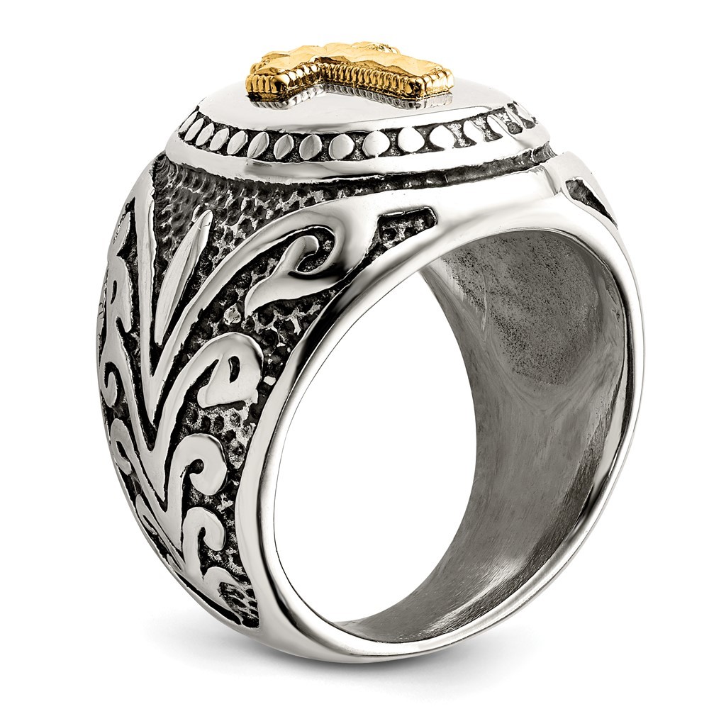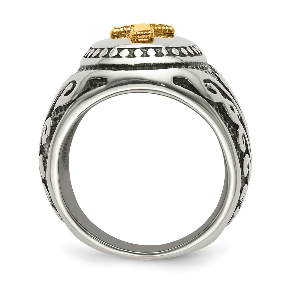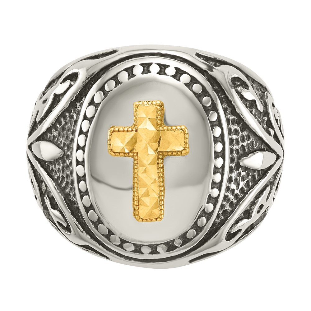 Stainless Steel with Diamond-cut 14K Gold Accent Cross Oval Signet Ring Size 11