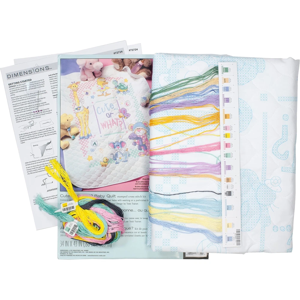 Stitch a heartfelt and unique baby gift with the Stamped Cross Stitch Cute or What DIY Baby Quilt Kit! This adorable baby blanket features a collection of cute baby animals surrounding the words ''Cute… or What?'' Includes cotton embroidery thread, stitching needle, and polyester cotton quilt with printed cross stitch pattern. Completed baby quilt measures 34'' x 43''. Cute or What Cross stitch quilt kit includes cotton embroidery thread, stitching needle, and stamped poly/cotton baby blanket. Printed poly/cotton baby quilt measures 34'' x 43''. A unique gift for new parents, this adorable stamped cross stitch baby blanket kit creates a heartfelt keepsake and nursery decoration. printed cross stitch pattern and easy instructions to create this cute baby gift. This adorable baby blanket features a collection of cute baby animals and the words ''Cute… or What''.