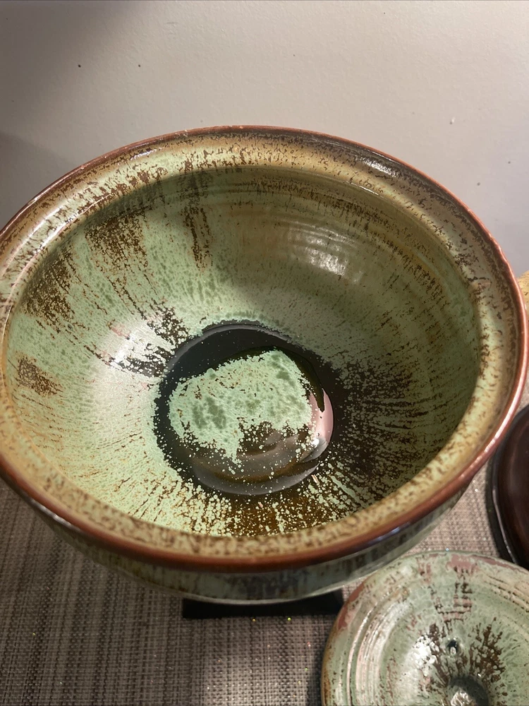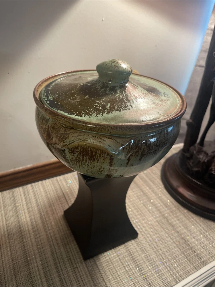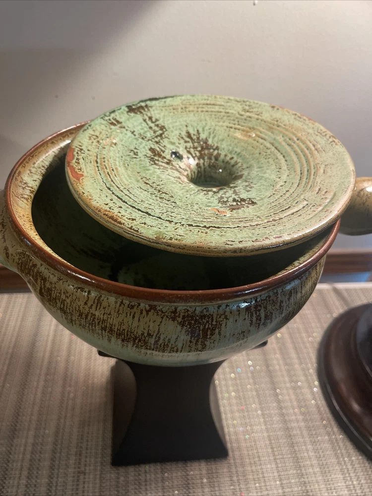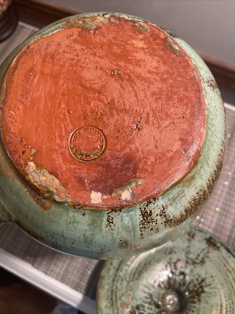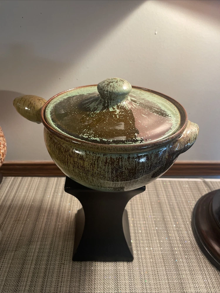 Features: With Handle, With Lid Vintage: Yes Finish: Glazed Item Length: 7 in Original/Licensed Reproduction: Original Item Width: 5 in Time Period Manufactured: 1980-1989 Origin: North Carolina Material: Clay Handmade: Yes Country/Region of Manufacture: United States Backstamp: Incised Year Manufactured: 1987 Production Technique: Pottery Type: Casserole Brand: Cole Sanford North Carolina Pottery Color: Green
