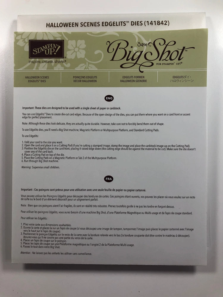 Create stunning embellishments for your scrapbook or paper craft project with these brand new Stampin' Up! Halloween Scenes Edgelits. These cutting dies are perfect for adding intricate designs to your paper crafts. Expertly crafted from high-quality materials, these cutting dies are suitable for all your die-cutting needs. Whether you're a seasoned crafter or a beginner, these dies are easy to use and produce precise and professional results every time. Add a touch of elegance to your next project with these Stampin' Up!Halloween Scenes Edgelits. Item comes from a smoke-free, pet-free environment. I will ship via USPS to US customers only.