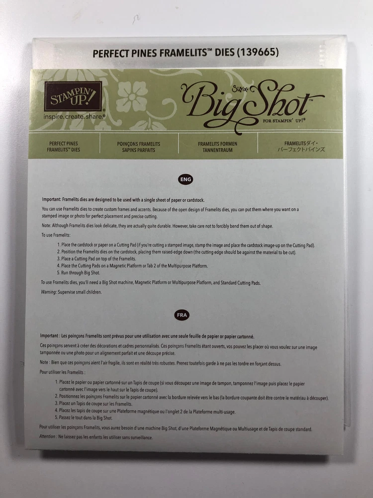 Create stunning embellishments for your scrapbook or paper craft project with these brand new Stampin' Up! Perfect Pines Framelits. These cutting dies are perfect for adding intricate designs to your paper crafts. Expertly crafted from high-quality materials, these cutting dies are suitable for all your die-cutting needs. Whether you're a seasoned crafter or a beginner, these dies are easy to use and produce precise and professional results every time. Add a touch of elegance to your next project with these Stampin' Up! Perfect Pines Framelits. Item comes from a smoke-free, pet-free environment. I will ship via USPS to US customers only.