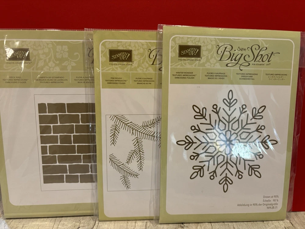 Lot of 3 folders NEW Winter Wonder Pine Bough Brick Enhance your creativity with this lot of three Stampin' Up! Sizzix Embossing Folders. These folders are perfect for embossing your favorite materials, making them a great addition to any crafting collection. The set includes Winter Wonder, Brick, and Pine Bough designs, all made from durable plastic. Use these folders to create unique and intricate designs for your scrapbooking and paper crafting projects. The Stampin' Up! brand is known for their high-quality products, and these embossing folders are no exception. Don't miss out on the opportunity to add this set to your crafting holiday arsenal. Please see pictures for additional item details and please do not hesitate to reach out wioth any questions.