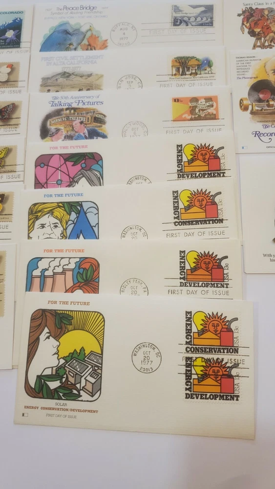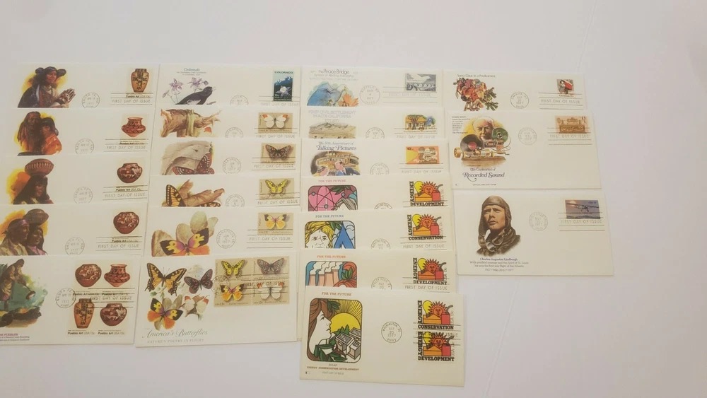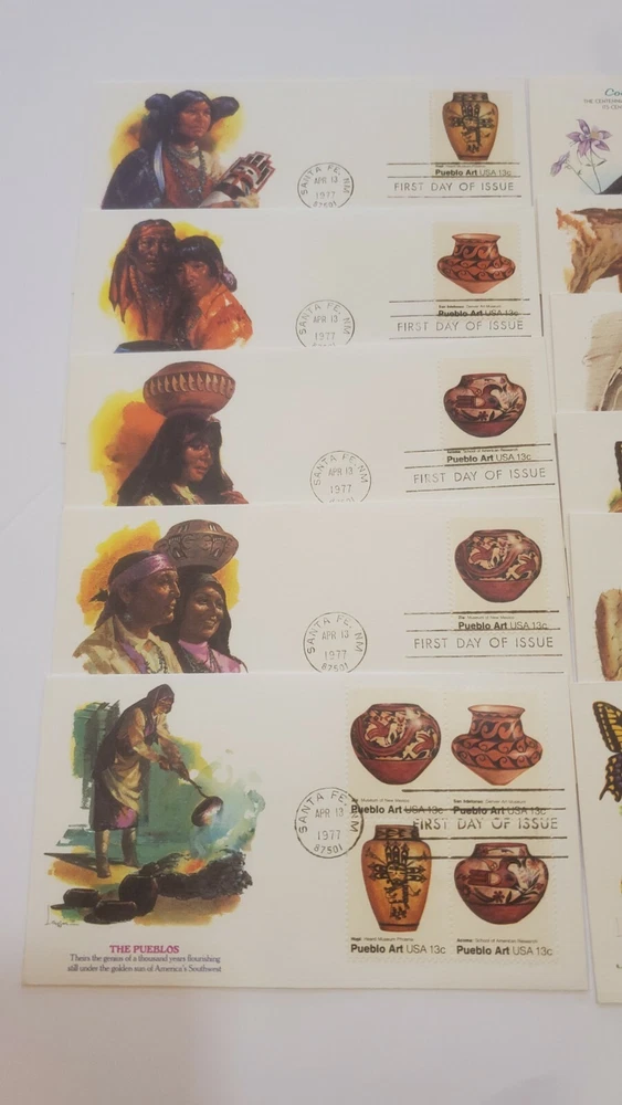 Please visit our store category "Stamps" to purcase many mint lots of fdc stamps. We offer a huge assortment from a massive collection that spanned over 90 years of FDC. fleetwood mint fdc lot Pottery pueblo art Butterflies Energy conservation Lindberg Edison listings are weighed and measured to charge the least amount in shipping as possible given usps rates. combined shipping is available upon request. message us for a combined shipping invoice after purchasing, but before paying for order and we will adjust shipping charge accordingly. we are in the process of liquidating a huge stamp collection for the lowest prices researched through ebay history. thanks so much for your interest!