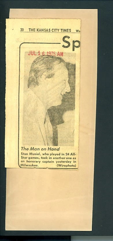 Stan Musial is pictured on this 3 1/4 x 8 Press Photo as honorary captain for the National League at the 1975 All Star Game in Milwaukee. This July 16th 1975 dated photo has the original news caption on the back from the Kansas City Times. Please check out the thousands of press photos I have available in my e-bay store. Shipping and handling is $3.00 for first class shipping for as many photos you may purchase to save $ on shipping charges as long as all photos are PAID AT THE SAME TIME WITH ONE PAYMENT. If you think you might buy multiple items from any seller that offers combined shipping, use the "Add To Cart" option under the "Buy It Now" button instead of the buy-it-now, and this will combine your purchases into one shipping charge as you add more items to your cart and purchase. Only make your payment after you have added all the items you want into your cart - you should then see that there is one charge for shipping when you go to make your payment. . (mears, 12-12, #789)